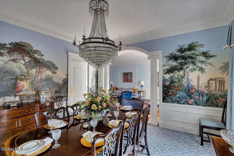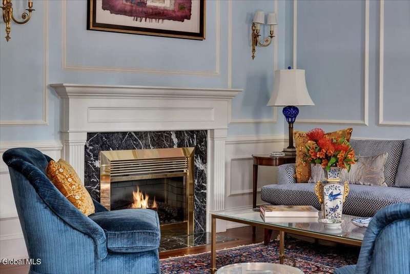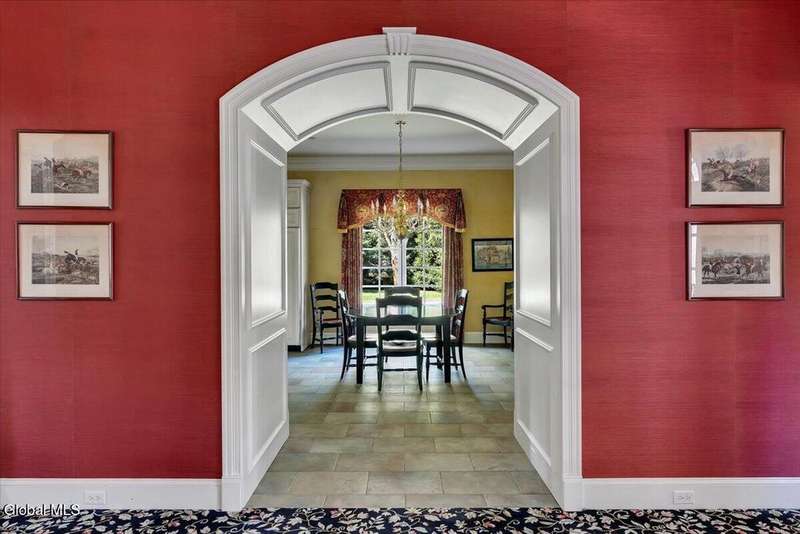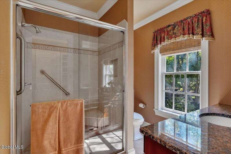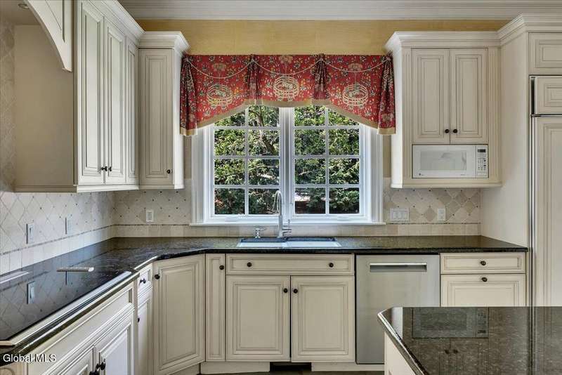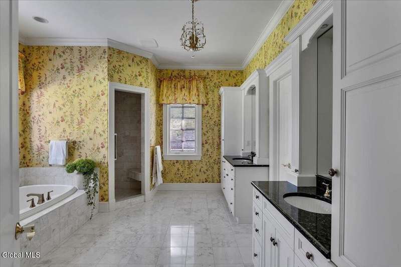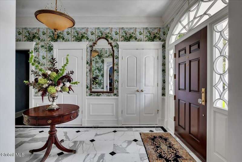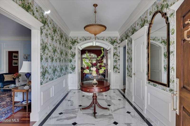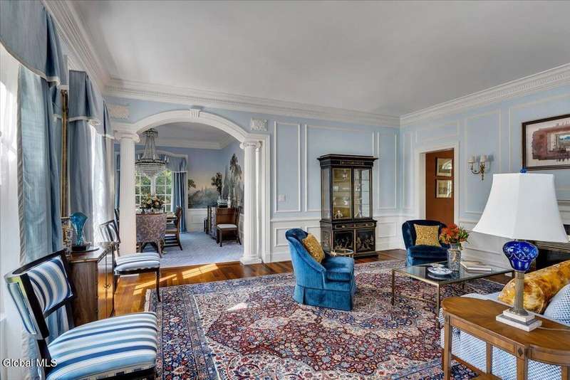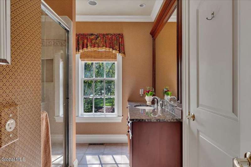This architecturally stunning, one-level luxury residence combines timeless sophistication with the finest craftsmanship and finishes throughout. An extremely rare opportunity for the most discerning buyer. Constructed by Loudonville's premier builder with remarkable attention to detail. The home's appeal begins with a sweeping circular drive that leads to a dramatic front entrance. Bluestone steps ascend to a grand portico that welcomes you inside. Center foyer with a sparkling marble floor. Intricate moldings, and designer features throughout set an impressive tone. The formal living and dining rooms are designed with entertaining in mind. Zuber wallpaper. The gourmet kitchen is a chef's dream?anchored by a spacious island and equipped with Wolf, Dacor, Bosch, Summit, and Sub-Zero appliances. The adjoining great room captivates with a soaring cathedral ceiling, grand fireplace, custom built-ins, wet bar, and sliding doors that open to a private covered terrace. It's the heart of the home and perfect for gatherings large or small. Private hall with Venetian plaster walls leads to the bedroom and study wing. The owner's study or den provides an ideal space for work or relaxation. With an adjoining walk-in closet/dressing room and full bath, this flexible area could also serve as a 4th bedroom. Guest suite with an ensuite bath ensures comfort and privacy. Magnificent primary suite is a true retreat, featuring a sumptuous spa-inspired bath and an expansive dressing room. Separate guest room with ensuite bath offers perfect accommodations for an au pair. Convenient side entrance with ample storage and a laundry room. Lower-level game/recreation room with garden windows and new carpeting, plus unfinished space. Heated 3 car side-load garage. Zoned heating and cooling. Set on a beautifully landscaped private 1.7-acre lot with large stone terrace, this extraordinary home embodies the best of Loudonville luxury living.