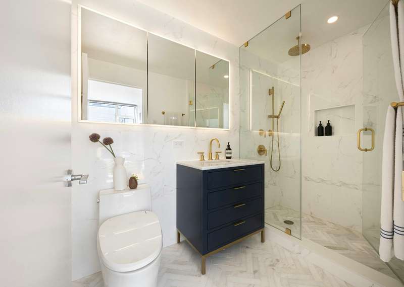 The primary suite is a serene retreat featuring a walk-in closet and a spa-inspired bathroom. Highlights include a 60" recessed framed medicine cabinet mirror with defogger, Porcelanosa floor-to-ceiling wall tile, marble flooring, and Kohler hardware, complemented by a Kohler toilet and bidet. The guest bathroom mirrors this level of detail with Porcelanosa wall and floor tiles, another 60" recessed framed medicine cabinet with defogger, Kohler hardware, and a Toto toilet. A Bosch washer and dryer are seamlessly integrated into the space for added convenience.