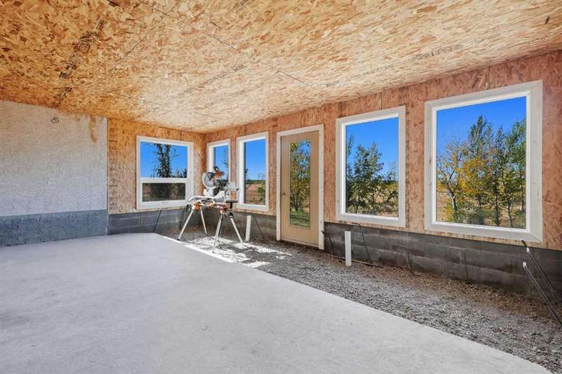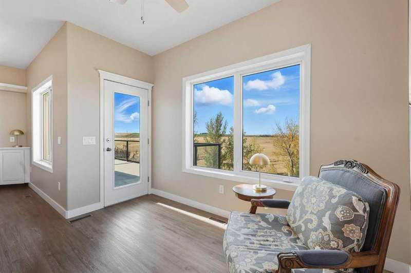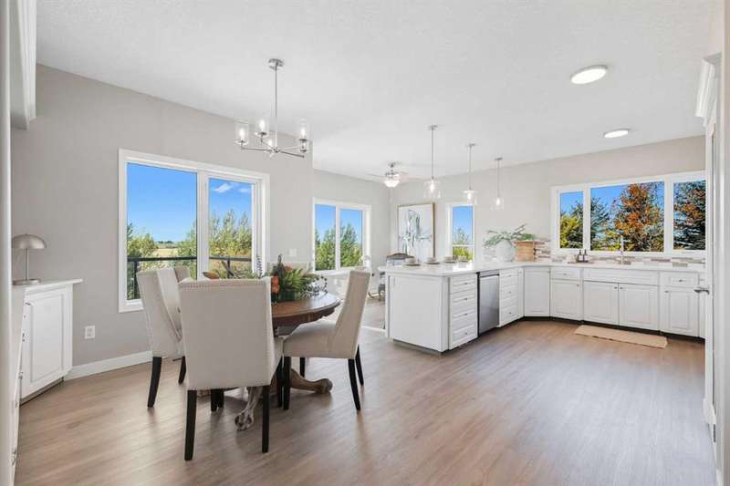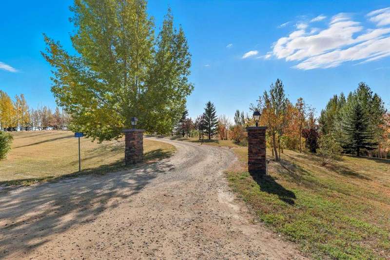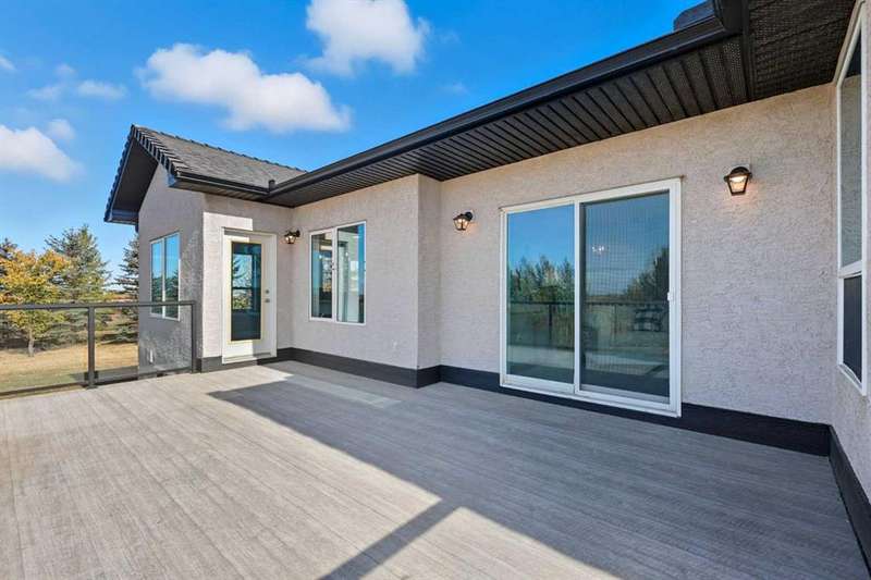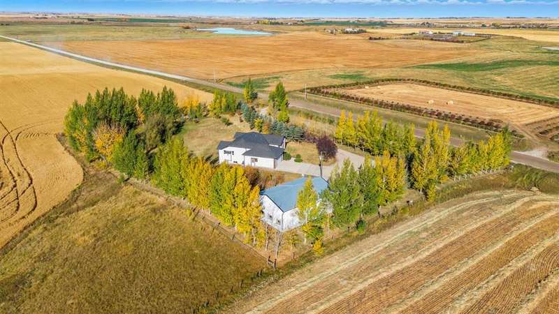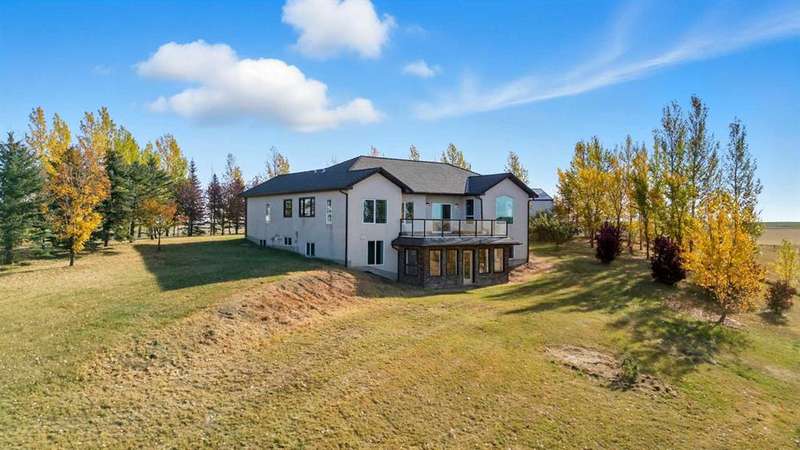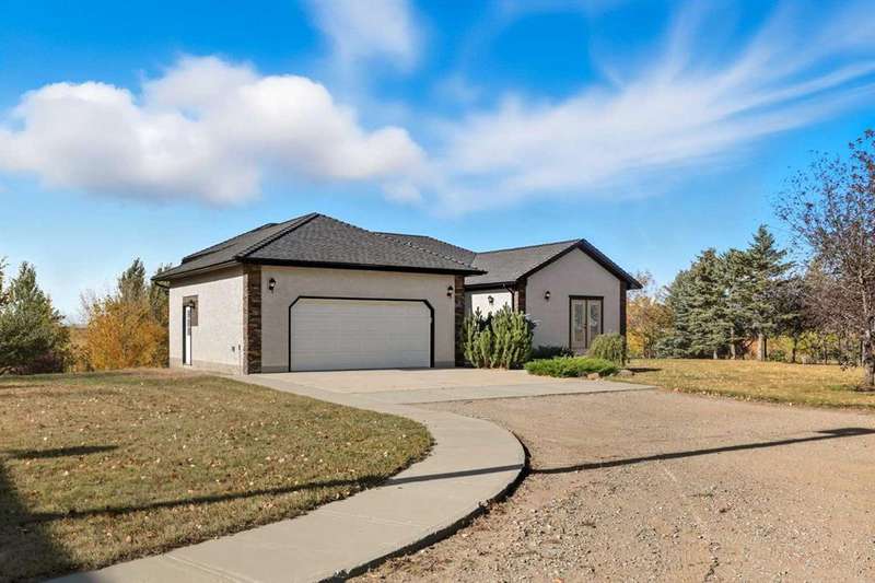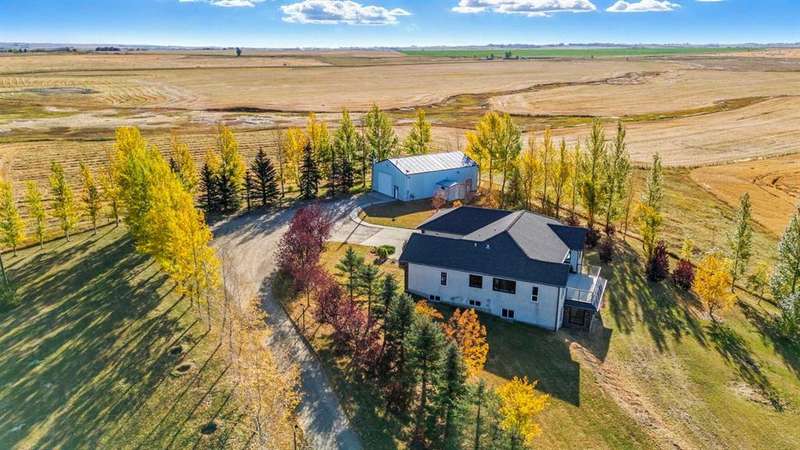 Welcome to this custom-built, 3500 sq ft developed area, walk-out bungalow perched on a scenic hilltop in Wheatland County, just 10 km north of Strathmore and only 25 minutes from Calgary International Airport. Set on 3 private, beautifully treed acres surrounded by agricultural fields and boasting unobstructed west-facing views of the Rocky Mountains, this property combines luxury living with peace and privacy. A tree-lined driveway lit with stately fixtures guides you to the home, which has been newly updated with modern paint, lighting, flooring, appliances, and decking, offering a fresh and stylish feel throughout. Designed for easy country living, the property is virtually maintenance free and finished with durable stucco and asphalt shingles. The 47’ x 31’ shop is fully insulated and heated, finished with a metal exterior and metal roof, making it ideal for storage, business, or hobby use in any season. Inside, the main floor showcases a large kitchen with peninsula seating, walk-in pantry, and a cozy breakfast nook with garden doors opening to the west-facing deck with glass railings—perfect for evening sunsets. The dining area and main living room are filled with natural light from oversized windows, and anchored by a gas fireplace, creating a warm and welcoming atmosphere. The master suite includes two walk-in closets, a spa-inspired 4-piece ensuite with a standalone soaker tub and separate shower, and garden doors to the east, perfect for enjoying peaceful morning sun. A den, main floor laundry, and central air conditioning add comfort and practicality. The walk-out basement, complete with in-floor heating, features a large family room with a built-in entertainment area, three bedrooms, big windows, and access to an enclosed patio—a cozy, protected space to enjoy your surroundings year-round. Additional highlights: oversized attached garage with in-floor heat, built-in cabinetry, sink, and hot/cold water, as well as 3 frost-free hydrants located throughout the property. Surrounded by mature trees, wide-open fields, and breathtaking west-facing views. Just a short drive to amenities in Strathmore, and a quick commute to Calgary and YYC. This home offers the ideal combination of luxury, low-maintenance design, and unmatched rural charm. The land offers many possibilities too for future uses as the house and shop were developed on the east side of the property. Whether you're seeking a private family acreage or a turnkey retreat with space to work and play, this property delivers. A rare opportunity to own a thoughtfully designed, move-in-ready acreage in one of Wheatland County’s most desirable locations. Call your AWESOME Realtor today to book a viewing!