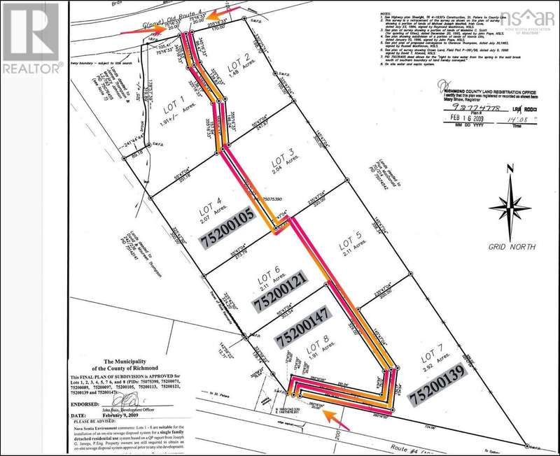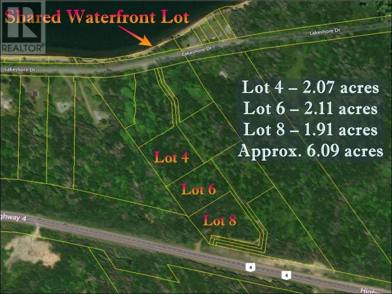 Welcome to Irish Cove, within 20 minutes from the Ben Eoin Golf Club & Resort, ski hill, and Ben Eoin Provincial Park, and only 1 minute from the Irish Cove Provincial Park, this scenic location blends outdoor adventure with peaceful living. Lots 4, 6, and 8 offer a combined 6.09 acres of elevated land within a quiet 8-lot subdivision. These parcels rise steadily from the lakeshore and offer sweeping views, a forested setting, and excellent potential for residential or recreational development. As part of the subdivision, these lots include shared deeded access to a waterfront parcel on the Bras dOr Lake, ideal for kayaks, enjoying lakeside picnics, or simply taking in the breathtaking sunsets. A shared right-of-way provides access from Highway 4 to the lakefront via Lakeshore Drive, ensuring convenience and connectivity within the subdivision. Highway 4 (East Bay Highway), a provincially owned and maintained road for year-round access. All three are classified as Resource Taxable, which means no additional 10% deed transfer tax for out-of-province buyers (lawyer will confirm). Surveys are available, lots have been approved by Nova Scotia Environment for an on-site sewage disposal systemhelping simplify the path to building. Whether you're looking to build a year-round home, seasonal cottage, or secure land for future development, these three lots provide a rare opportunity in one of Cape Bretons most naturally beautiful settings. Coordinates (Highway 4 Entrance): 45.814828, -60.684892 Coordinates (Share Waterfront Lot): 45.818243, -60.685911 For full listing details, go do Realtor.ca MLS#202519480 (id:2494)