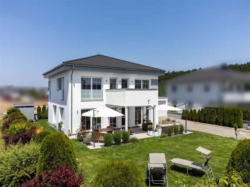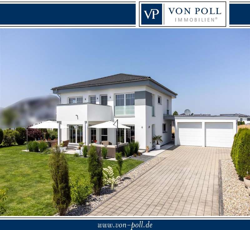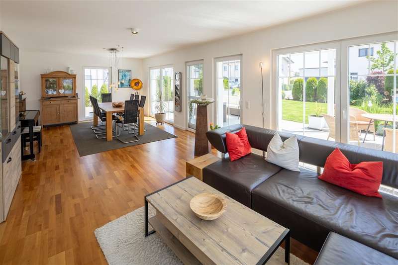 For sale is a high-quality detached house with a living space of approx. 158.80 m², situated on a plot of approx. 569 m². The property, which was completed in 2016, is in mint condition, meets the KfW 55 standard and was built using a timber frame construction. Thanks to its modern construction and high-quality fittings, the house offers ideal living comfort for families. It is distributed over the basement, ground floor and upper floor. Features include triple-glazed plastic windows with electric shutters and an efficient air-to-water heat pump. Living comfort is enhanced by the generous underfloor heating on all floors. A surveillance system and motion detectors in the entrance area provide additional security. The first floor has a modern entrance area with hands-free system, a fully equipped fitted kitchen, a bright living and dining area with access to the terrace, a study, a guest WC and a practical pantry. The flooring consists of a combination of high-quality parquet and tiles, which create a pleasant living ambience. The upper floor is divided into two separate areas. The parents' area comprises a bedroom with dressing room and access to the balcony as well as a spacious bathroom with bathtub and shower. The children's and guest area consists of a children's room with access to the balcony and a further children's room. A second bathroom with shower completes this floor. In the basement, there is a tiled hobby room with underfloor heating, a utility room, a laundry room and two additional cellar rooms. These offer plenty of storage space and potential uses. The outdoor area includes a terrace and a low-maintenance garden with garden shed. An enclosed carport with space for two vehicles offers additional convenience. In 2024, the smaller windows were replaced, the plinth area and window sill connections were resealed and the property was replastered. These measures contribute to the property's lasting value and increase its appeal. This detached house offers you maximum living comfort, a well thought-out room layout and modern technology. A viewing is recommended to fully experience the advantages of this offer. We will be happy to provide you with further information and look forward to presenting this attractive property to you in more detail during a personal visit.