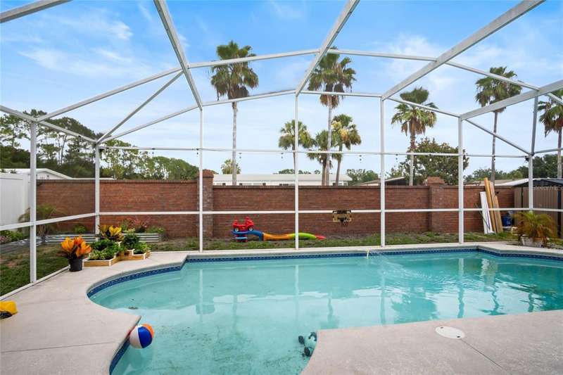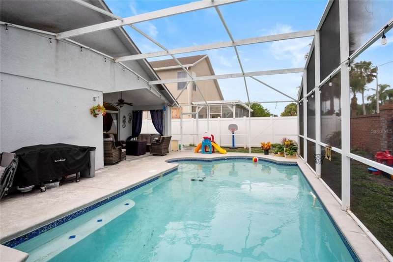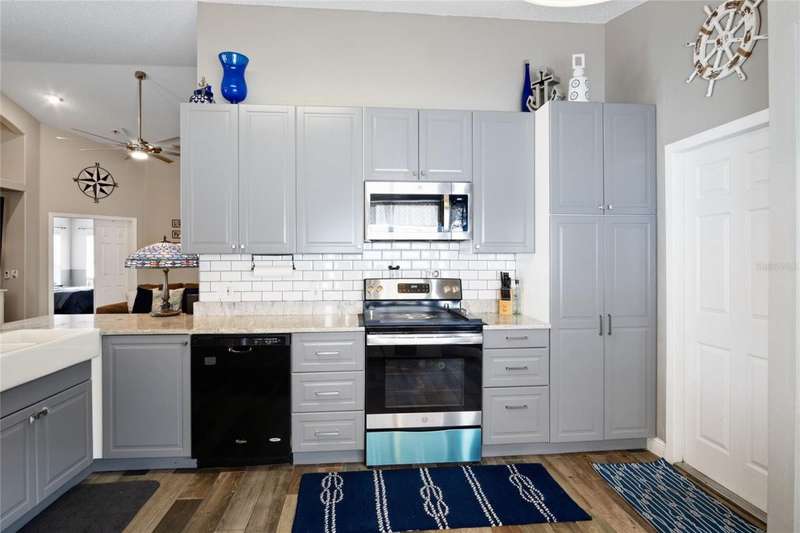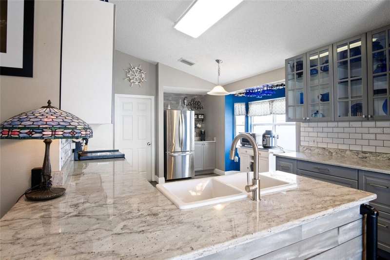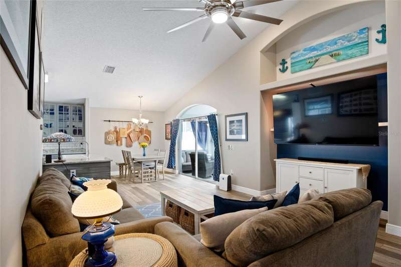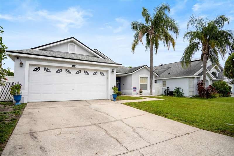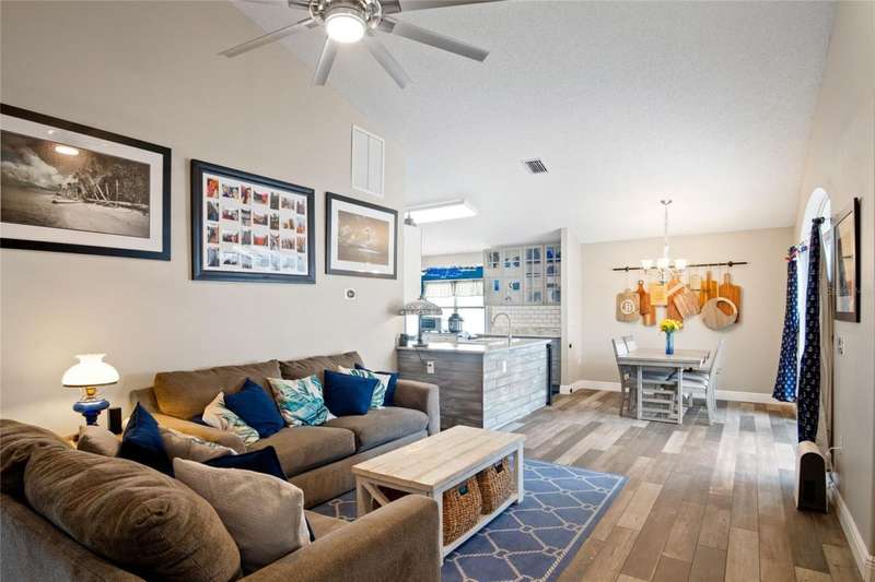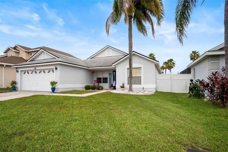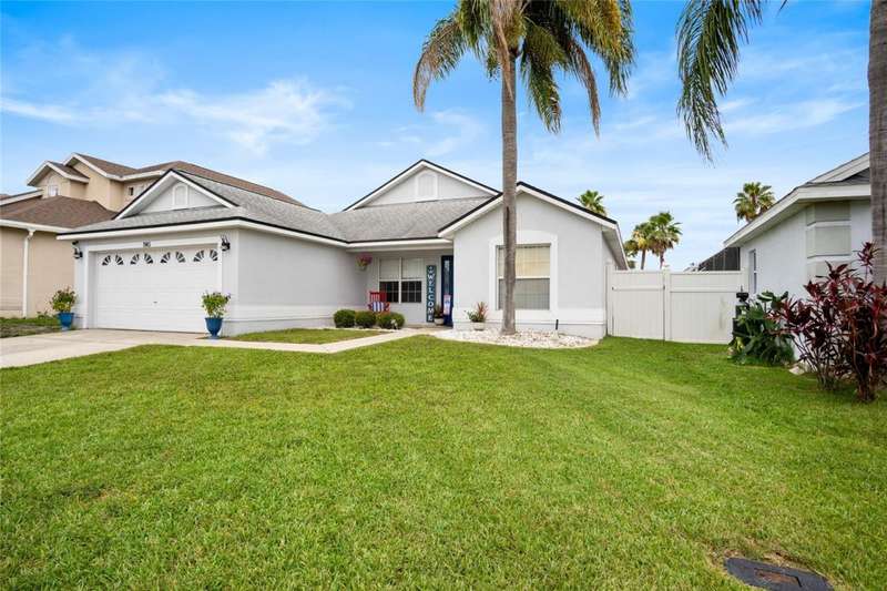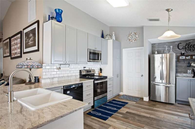 Welcome to this beautifully updated and meticulously maintained 4-bedroom, 2-bathroom pool home located in the desirable Fairways Lake Estates. With a thoughtful blend of style, functionality, and comfort, this home is move-in ready and ideal for use as a primary residence, vacation getaway, or short-term rental. Step inside and enjoy the many recent upgrades that elevate this home's appeal, including a fully remodeled primary ensuite and guest bathroom (2024), new AC system (2023), and wood plank tile flooring installed throughout most of the home (2022). The kitchen was tastefully remodeled in 2021 and now features stainless steel appliances, granite countertops, a stylish backsplash, coffee bar, ample storage, and glass cabinets perfect for displaying your favorite dishware-all overlooking the covered lanai and screened-in pool. Additional updates include a new roof (2019), resurfaced pool (2018), vinyl fencing for privacy (2018), and a new water heater (2014). The air-conditioned garage offers a unique option for a home office or gym, perfect for remote workers or hobbyists. Inside, enjoy charming details like shiplap paneling, chair rail accents, built-in shelves in the guest bedroom, and custom touches throughout. The open living and dining area is ideal for entertaining family and friends, while the outdoor space provides a peaceful oasis to relax poolside or dine al fresco under the lanai. Fairways Lake Estates offers wonderful community amenities including a golf course, tennis and basketball courts, a playground, lake access for fishing, and a community pool-all with a low HOA fee. Conveniently located just minutes from Disney World, H2O Water Park, Margaritaville, shopping, dining, and medical facilities. Don't miss this opportunity to own a stylish and functional home in one of Central Florida's most sought-after communities!