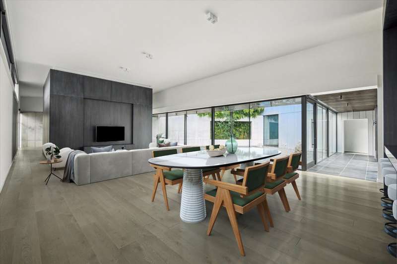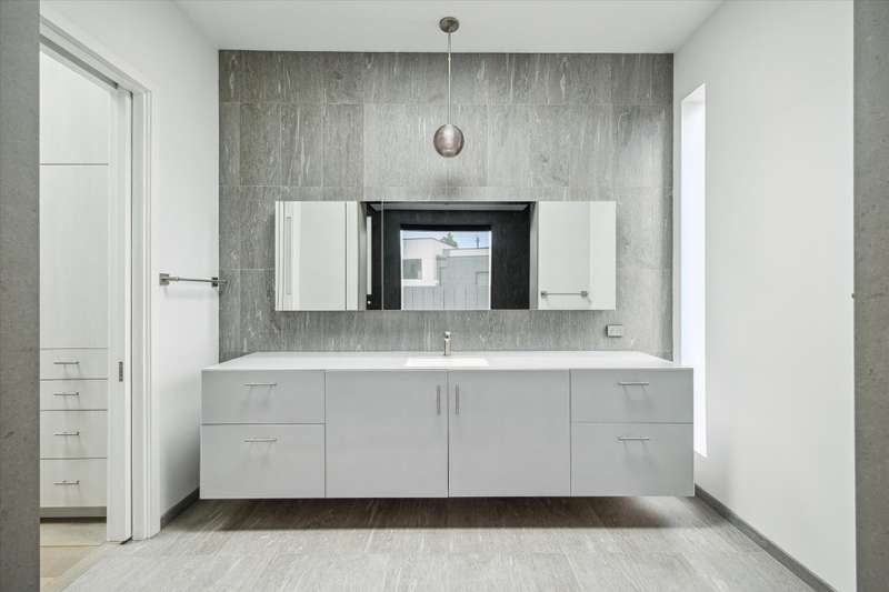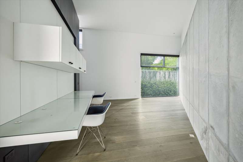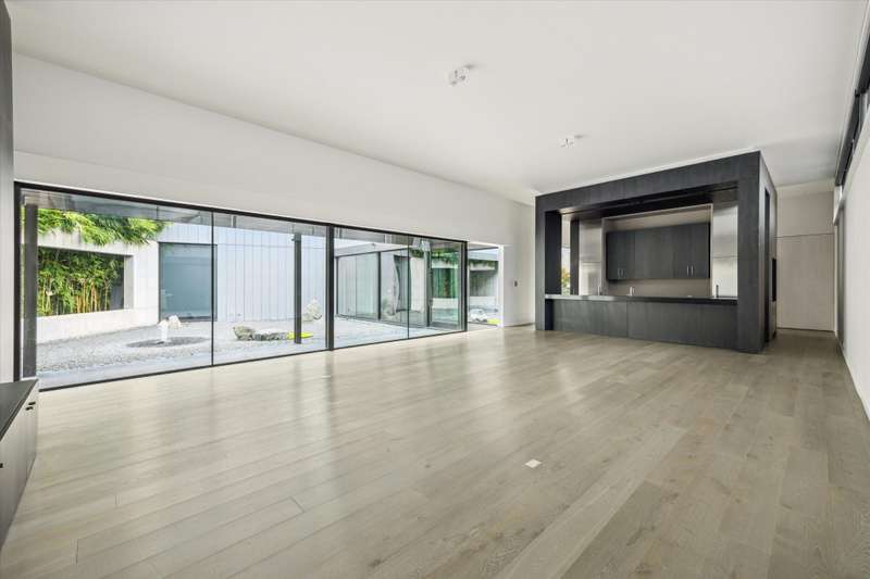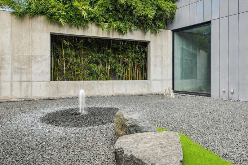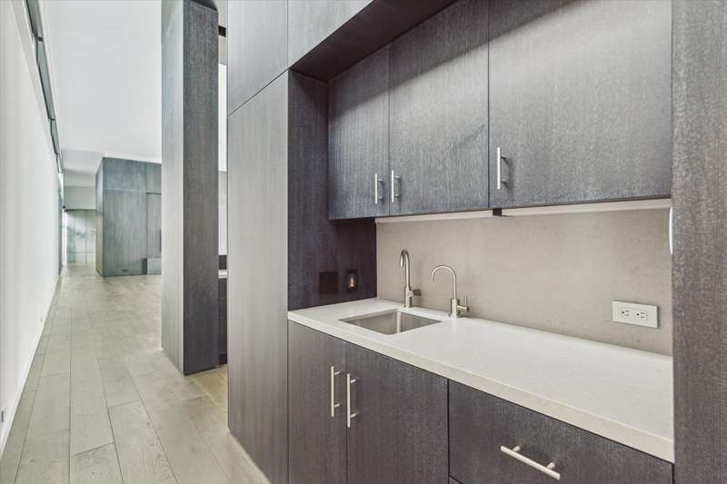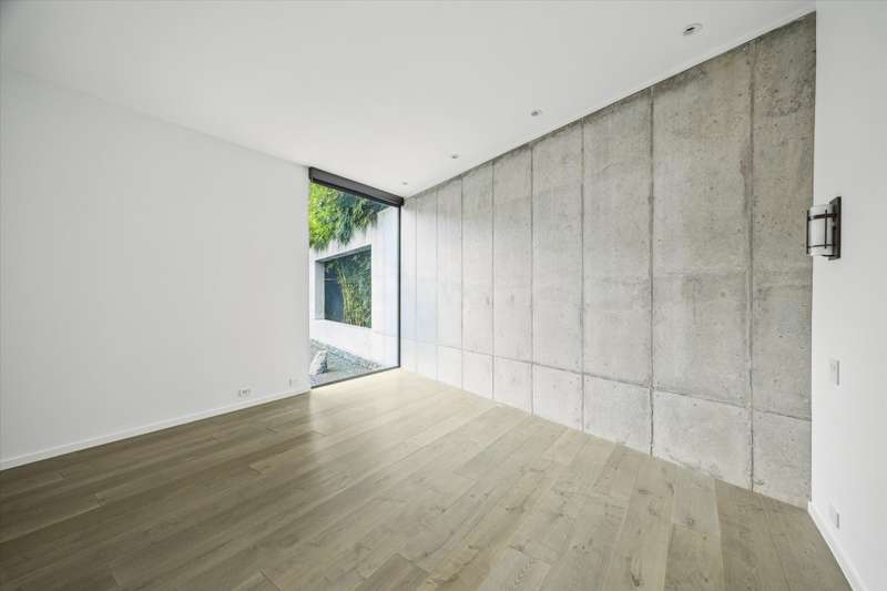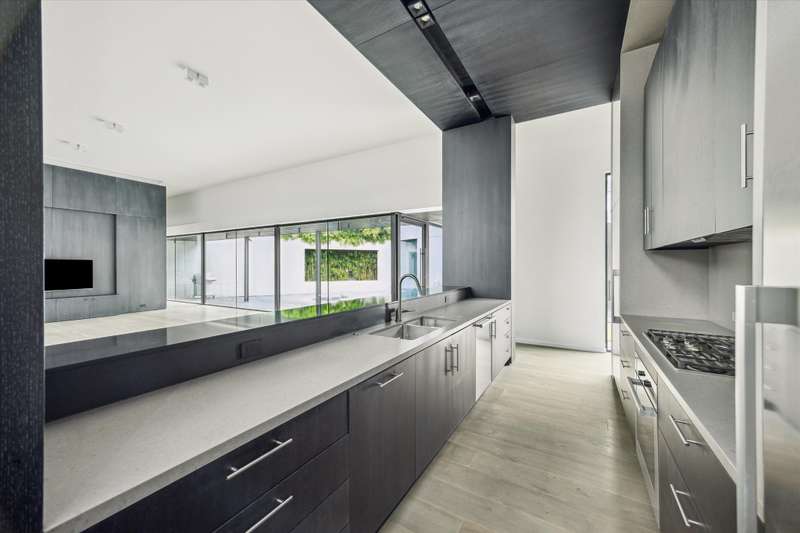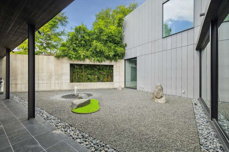 This chic home was created by Robertson Design with clean lines, 14-foot ceilings, an abundance of natural light, open floor plan, and floor-to-ceiling windows with views to a Zen-like courtyard. In addition to a stunning living/dining room the home includes 3 bedrooms, 3 1/2 baths, with two primary suites. Both of the primary suites have spa-like bathrooms and large walk-in closets. Additional rooms include an office, gym and a guest bedroom with an en-suite bath. The kitchen has Miele appliances, built-in refrigerator/freezer, with breakfast bar opening to the living area. Other special features include an elevator and a generator. Per Seller