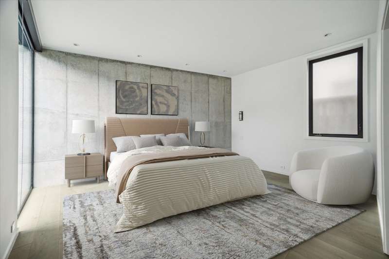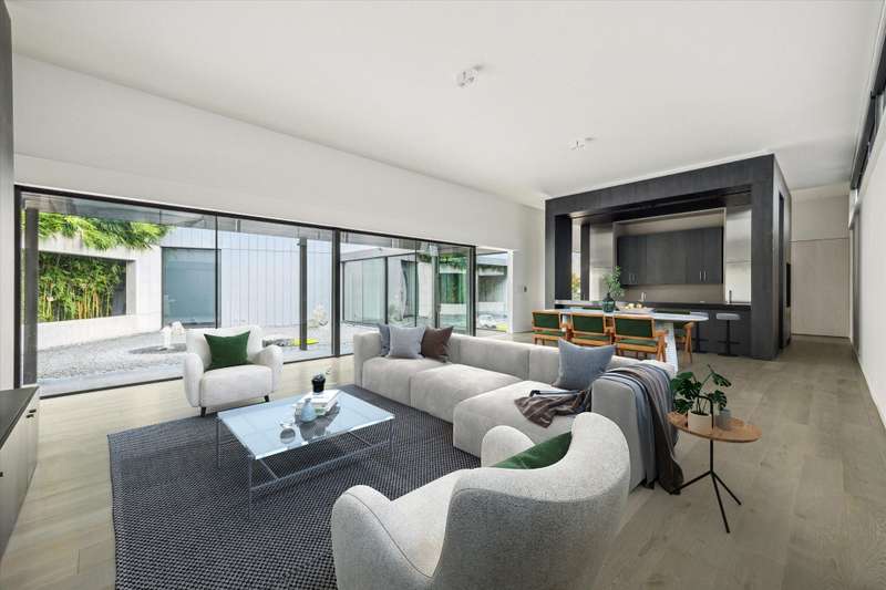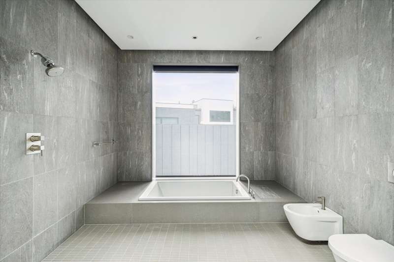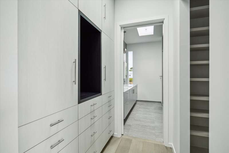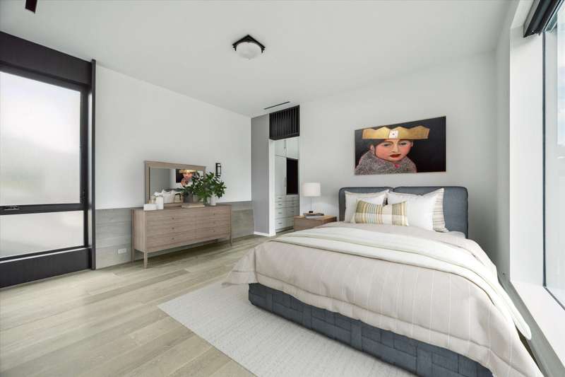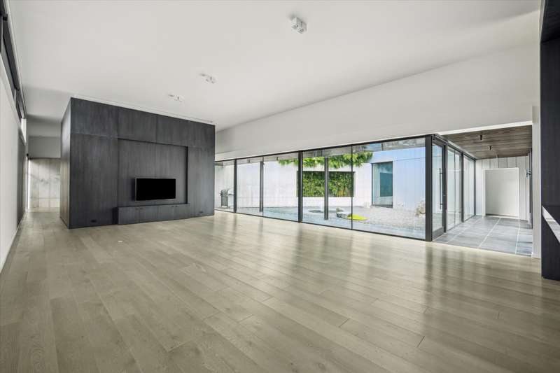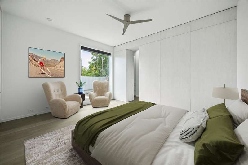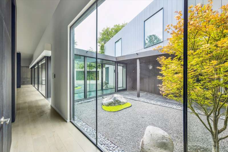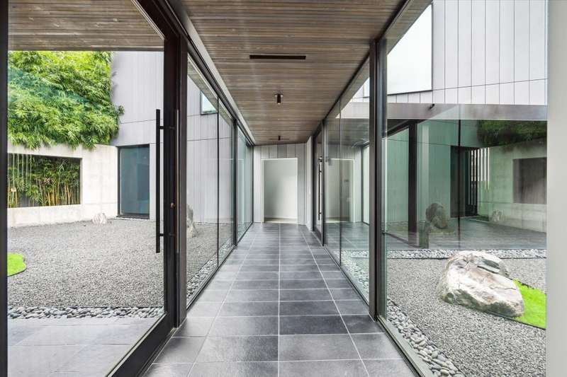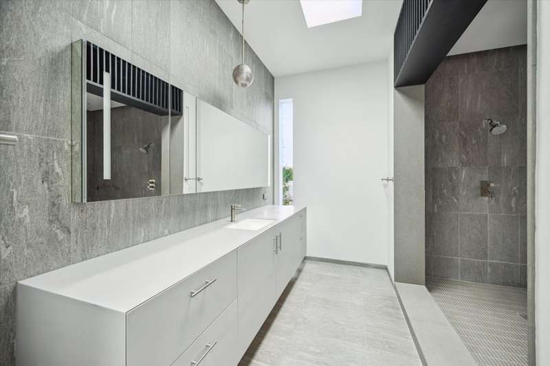 This chic home was created by Robertson Design with clean lines, 14-foot ceilings, an abundance of natural light, open floor plan, and floor-to-ceiling windows with views to a Zen-like courtyard. In addition to a stunning living/dining room the home includes 3 bedrooms, 3 1/2 baths, with two primary suites. Both of the primary suites have spa-like bathrooms and large walk-in closets. Additional rooms include an office, gym and a guest bedroom with an en-suite bath. The kitchen has Miele appliances, built-in refrigerator/freezer, with breakfast bar opening to the living area. Other special features include an elevator and a generator. Per Seller
