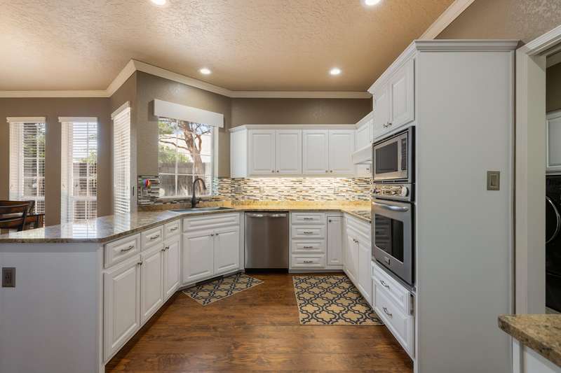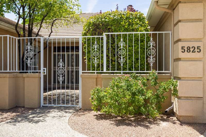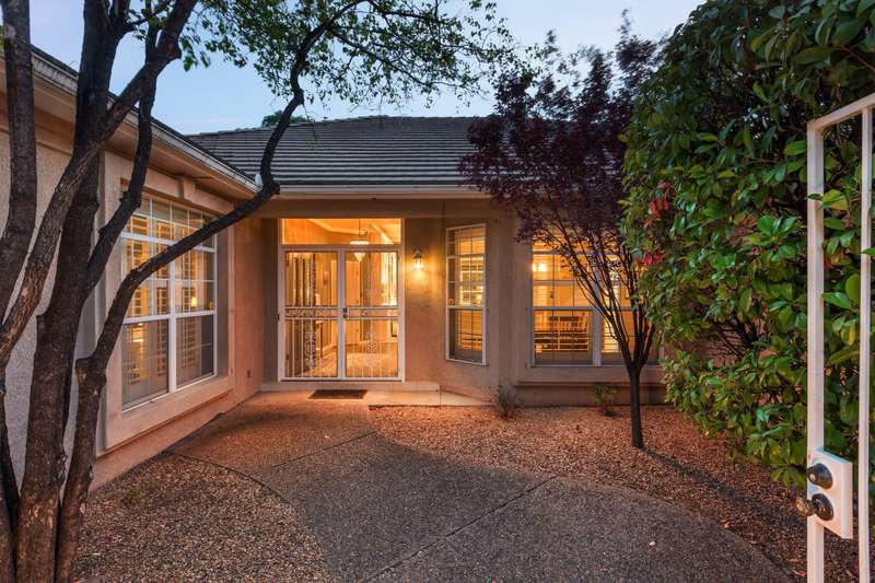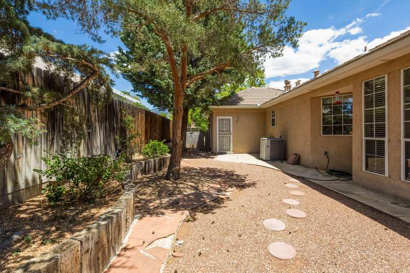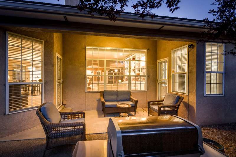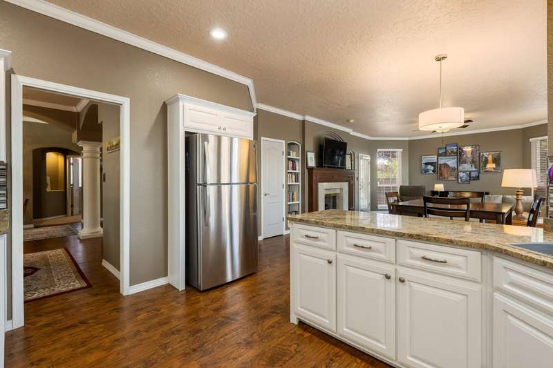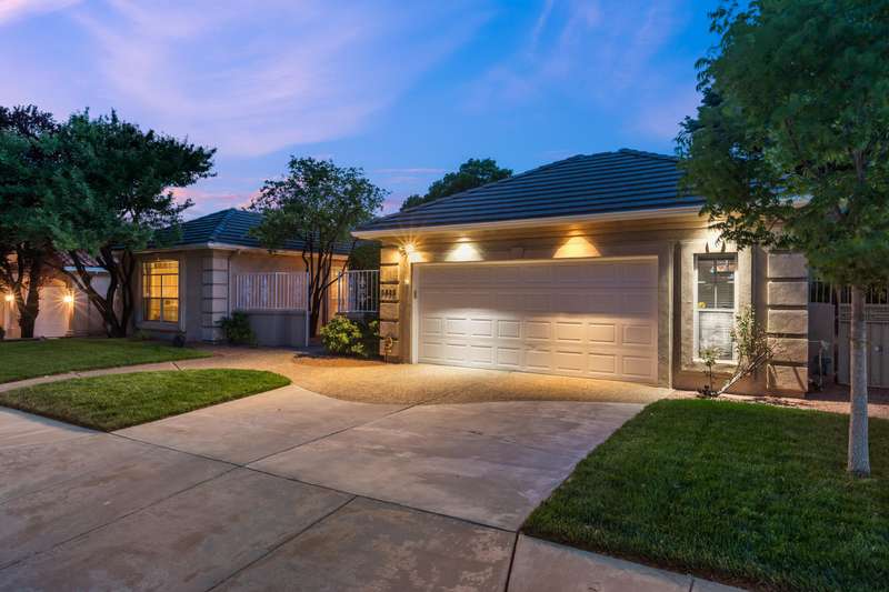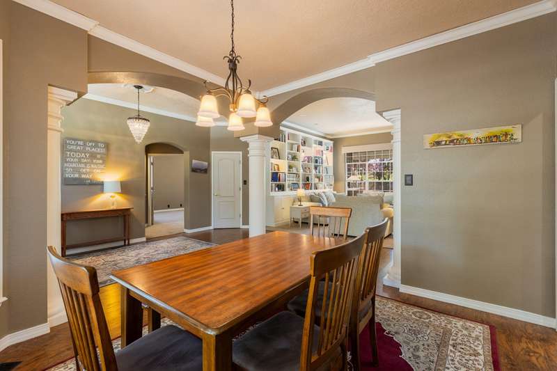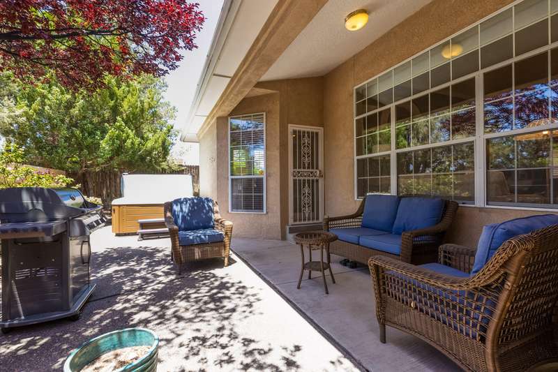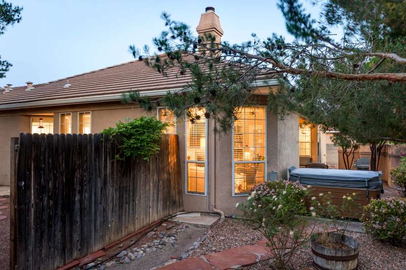 Elegant and updated single story Peppertree home! Formal living room with raised ceiling, crown moulding, beautiful wall of bookcases/display shelves and two way fireplace. Generous formal dining with easy access to kitchen with granite counters and updated cabinets. Kitchen is open to cozy den with fireplace and access to rear yard. Convenient laundry room and half bath. Updated hall bath with double sinks. Primary bedroom includes walk -in closet and update bath with walk-in shower, soaking tub, double sinks and patio door leading to hot tub. Updated Vinyl Plank flooring, tile, and carpeting. Excellent schools - Georgia O'keefe, Eisenhower and Eldorado. Lovely area for walking and riding bikes!