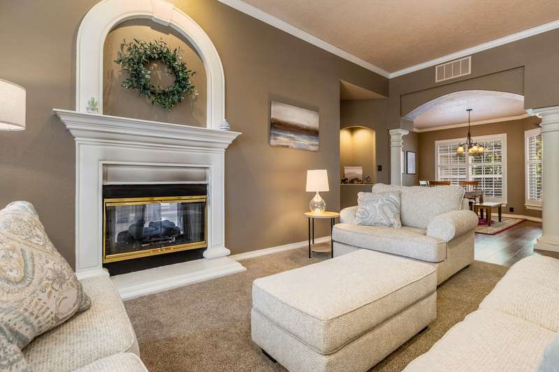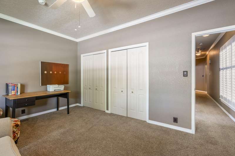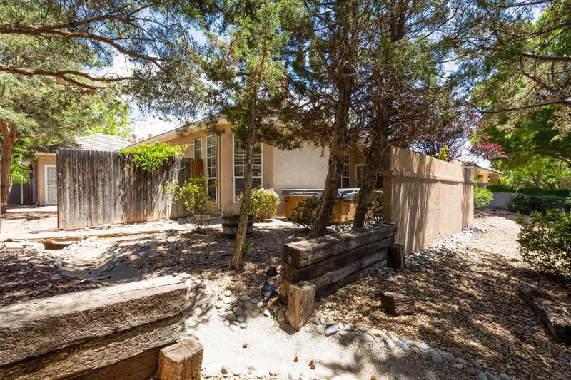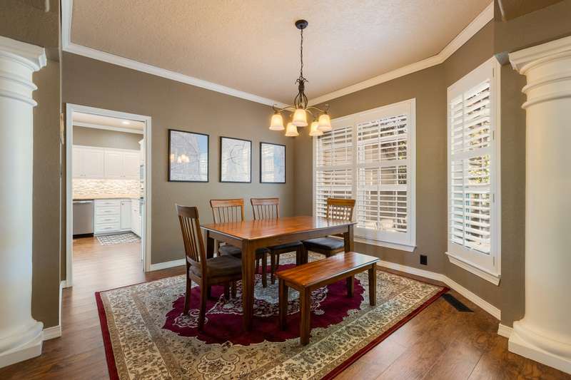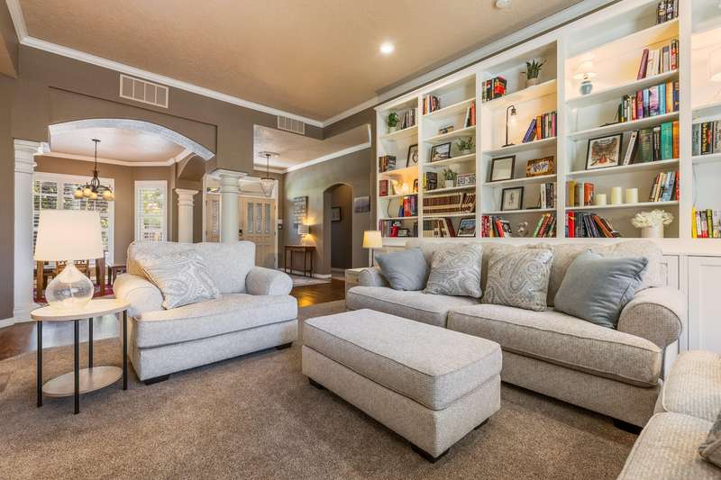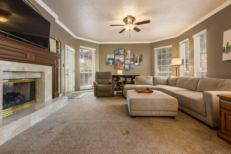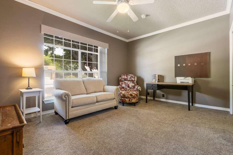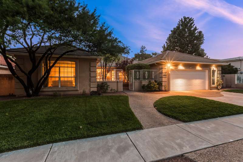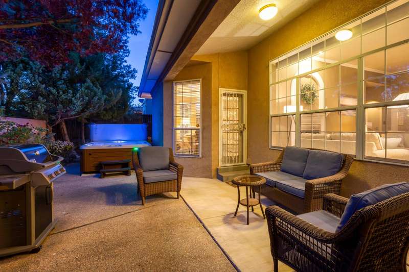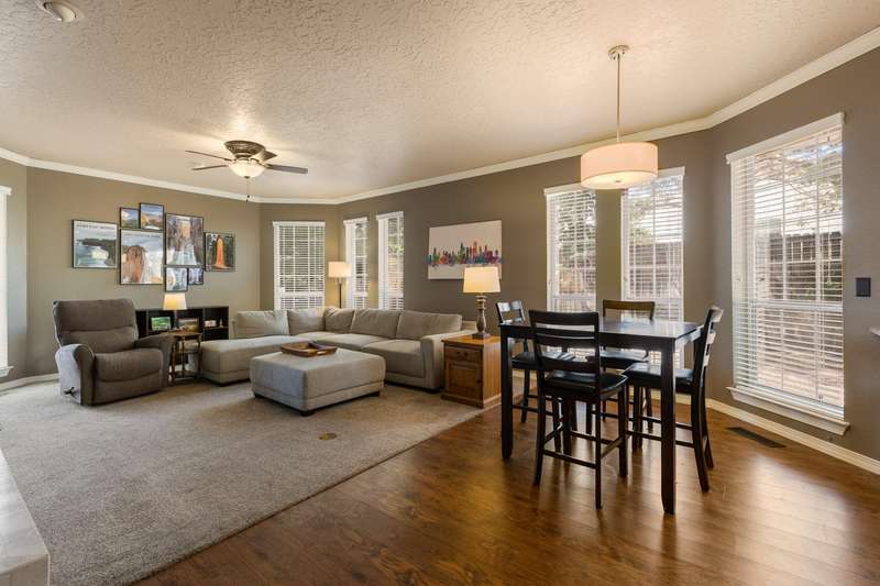 Elegant and updated single story Peppertree home! Formal living room with raised ceiling, crown moulding, beautiful wall of bookcases/display shelves and two way fireplace. Generous formal dining with easy access to kitchen with granite counters and updated cabinets. Kitchen is open to cozy den with fireplace and access to rear yard. Convenient laundry room and half bath. Updated hall bath with double sinks. Primary bedroom includes walk -in closet and update bath with walk-in shower, soaking tub, double sinks and patio door leading to hot tub. Updated Vinyl Plank flooring, tile, and carpeting. Excellent schools - Georgia O'keefe, Eisenhower and Eldorado. Lovely area for walking and riding bikes!