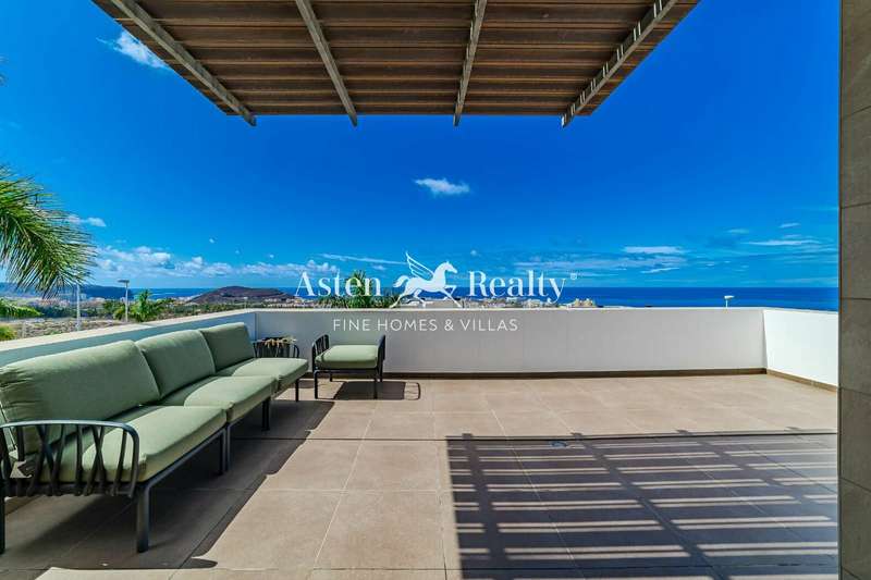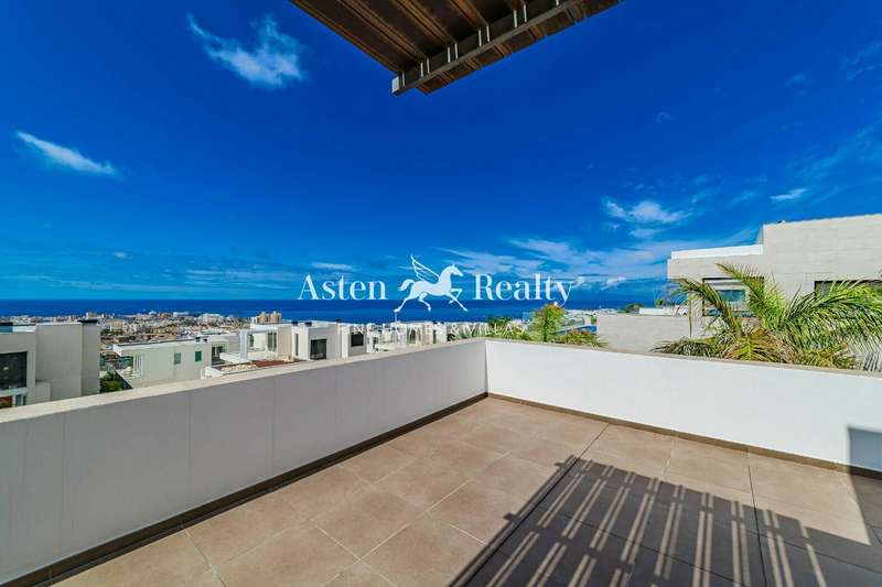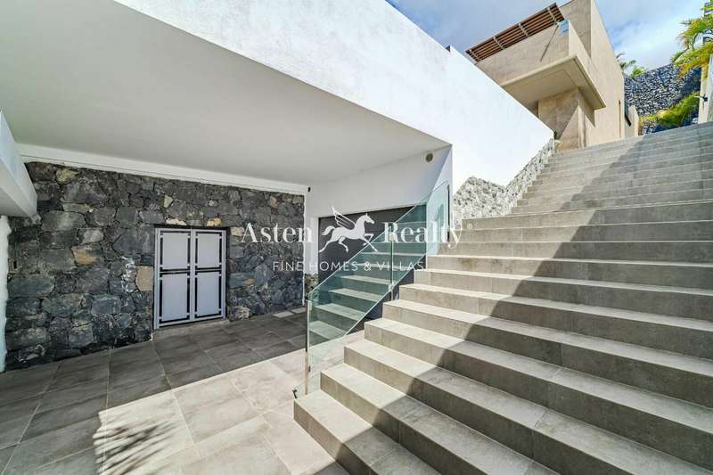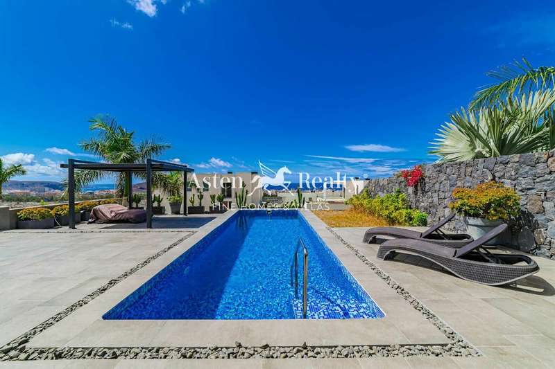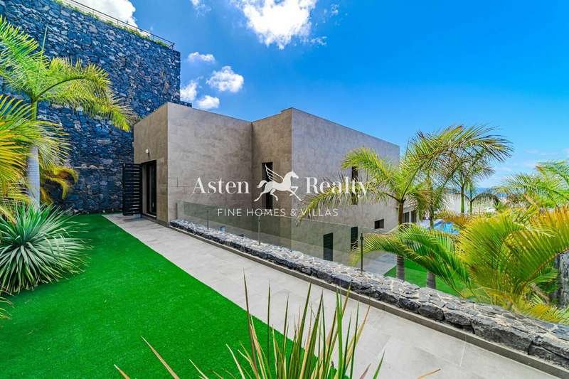 The ground floor of 126 m2 features a welcoming entrance hall, spacious living-dining room, modern kitchen, a double bedroom, and a full bathroom. This floor opens to a spectacular outdoor area with a terrace, garden, and a 27 m2 pool, all totaling 377 m2, offering panoramic views of the sea and the island of La Gomera.