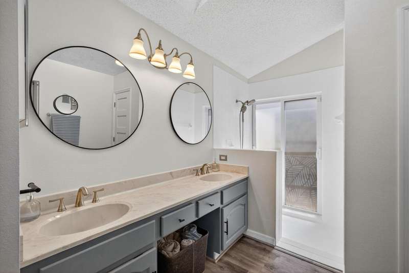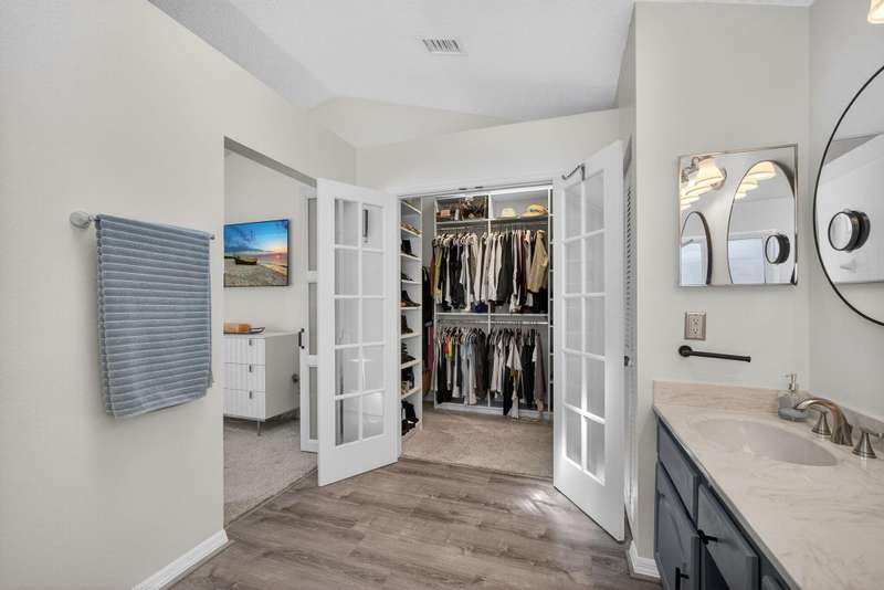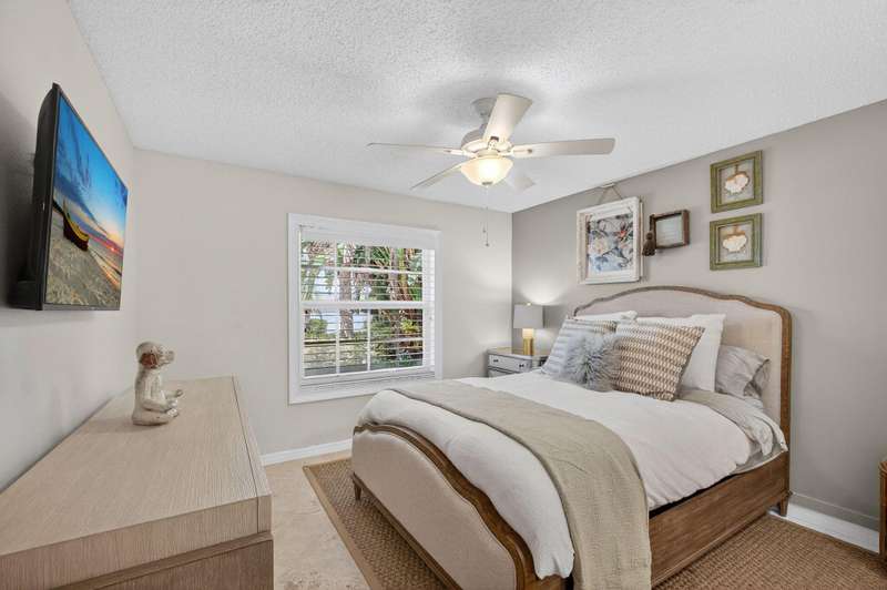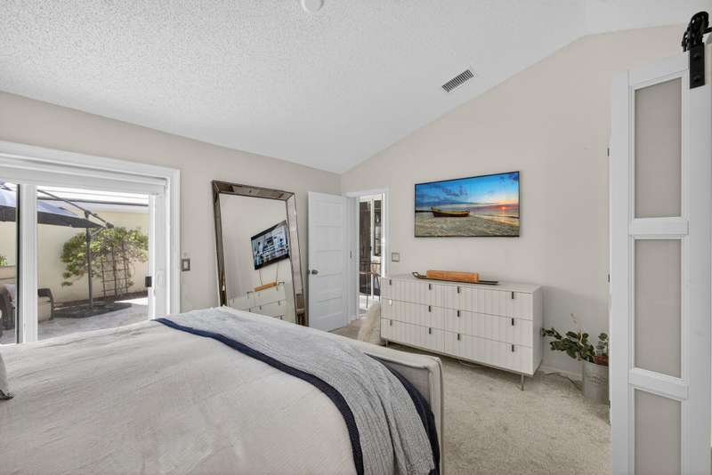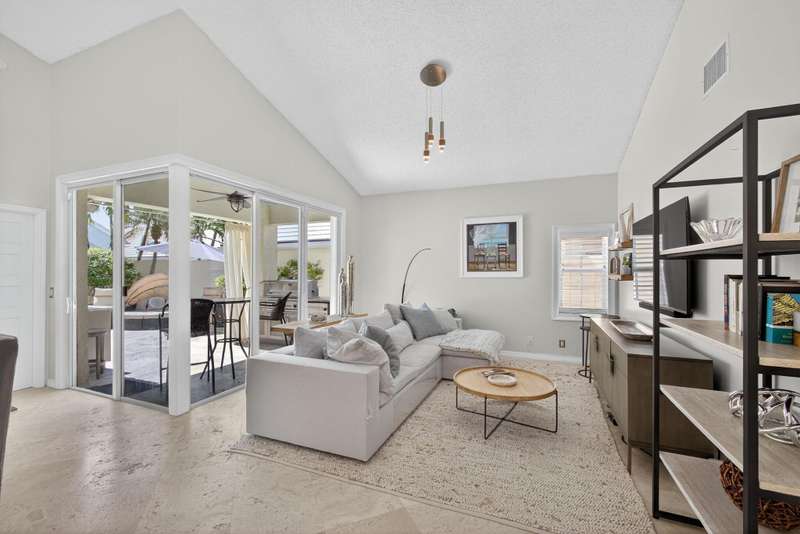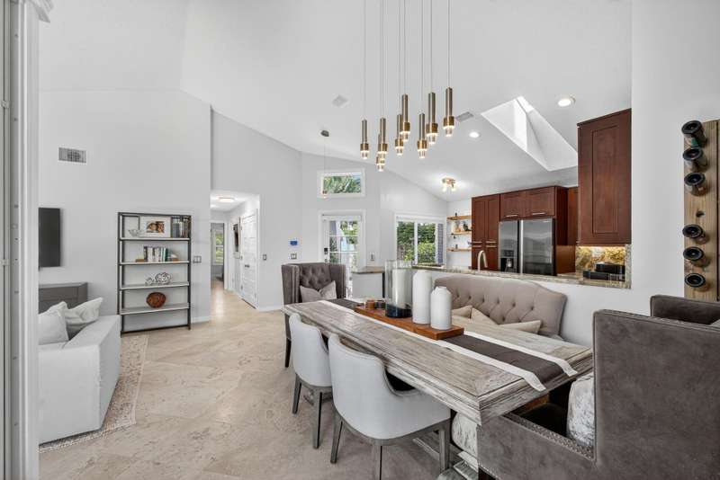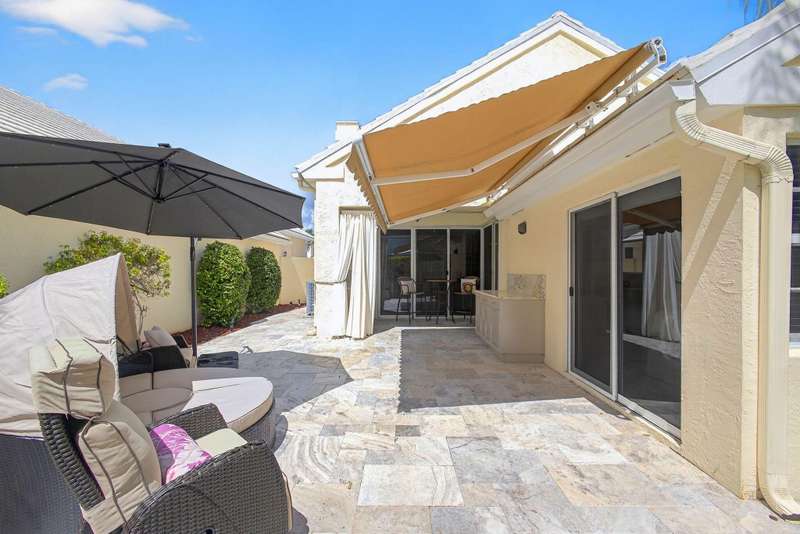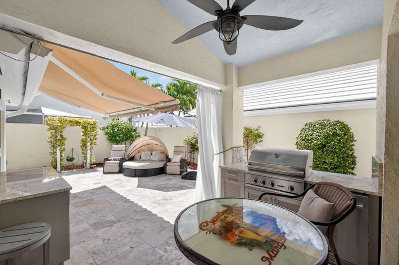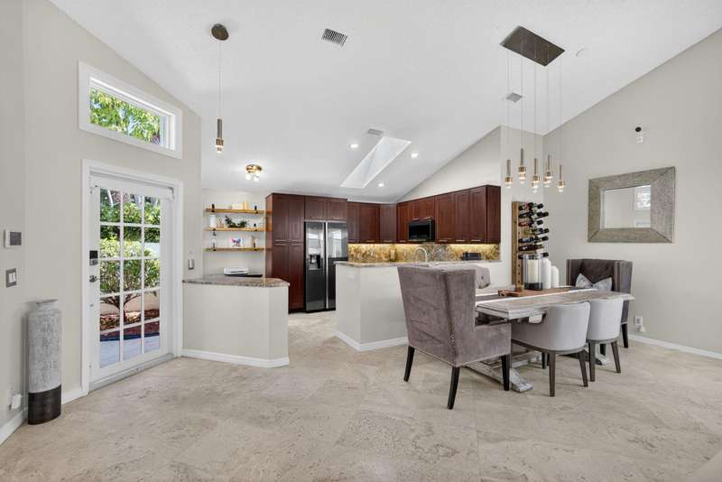 Discover this charming 3BR/2BA single-story residence on a desirable corner lot in exclusive Barclay Club. Soaring vaulted ceilings and elegant diagonal travertine flooring create seamless flow from the open living areas through floor-to-ceiling sliders to the expansive rear patio. The fully renovated designer kitchen showcases custom wood cabinetry with LED lighting, striking Netuno Bordeaux granite counters, and premium black stainless Samsung appliances including induction range, counter-depth refrigerator, and digital dishwasher. Exceptional outdoor entertaining awaits with a spacious patio featuring summer kitchen and retractable awning--perfect for year-round Florida living. Recent major improvements include impact windows and doors installed in 2019, a new HVAC system from 2020,