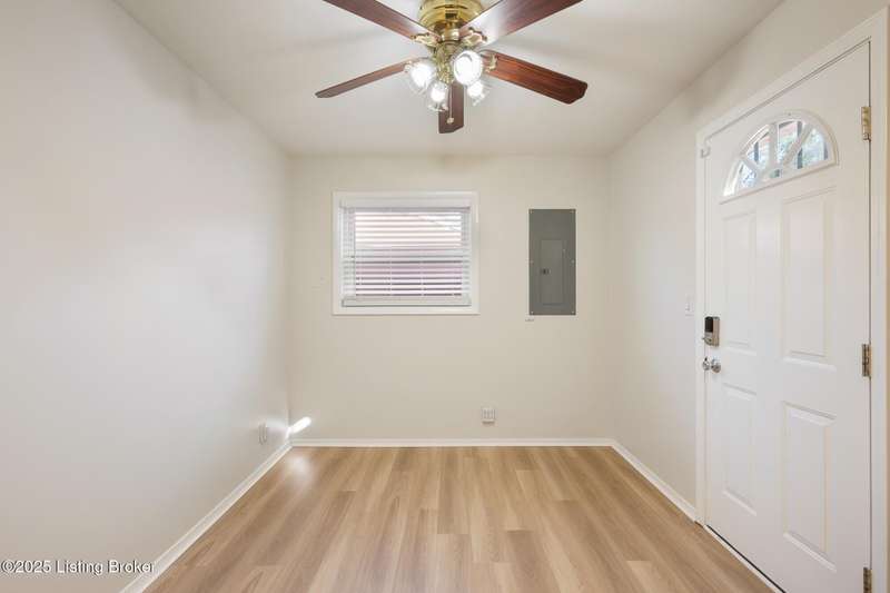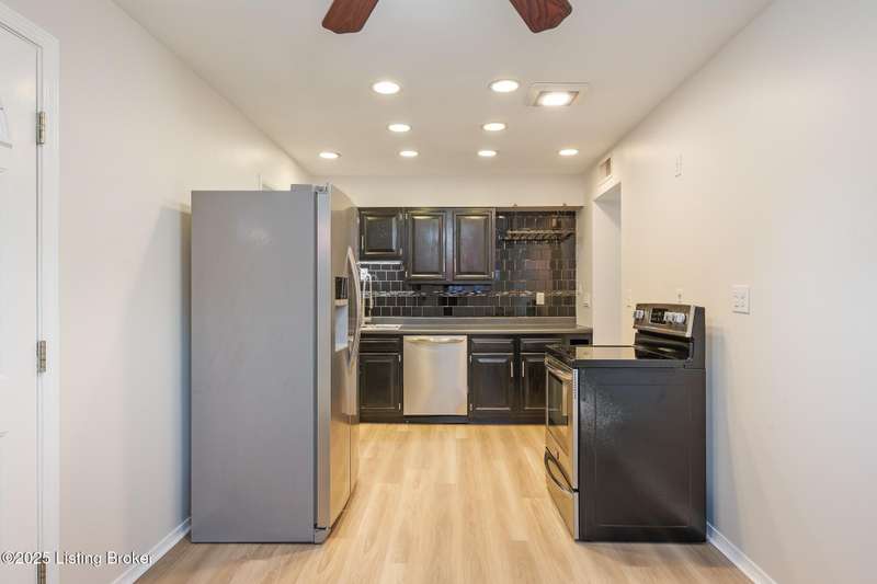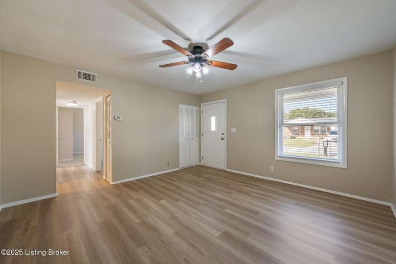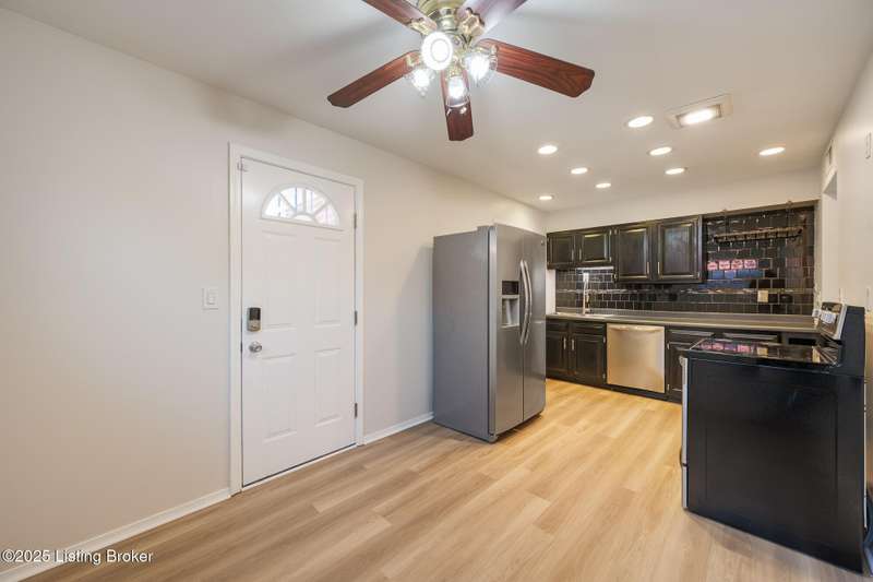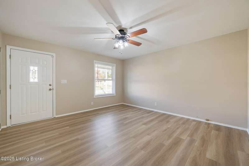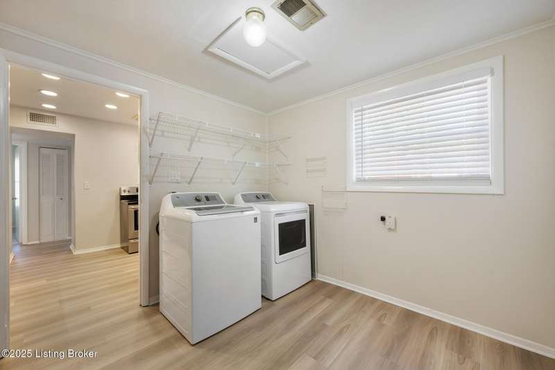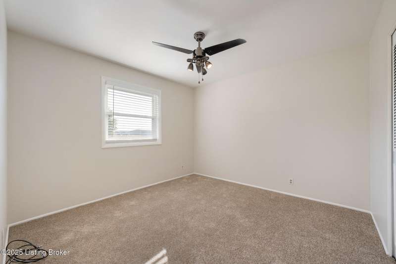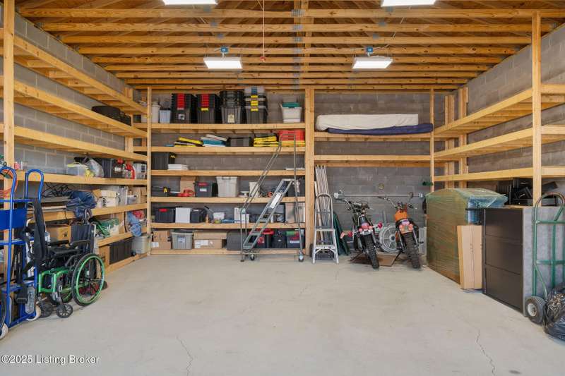 Are you looking for a fantastic home with a modest garage or are you looking for a great garage and the home is an added bonus? You can have both at 1083 Hillview Boulevard! Located right on the Bullitt/Jefferson County border, this beautifully updated property combines style, comfort, and low-maintenance living. And then there is the garage - it is massive at 33 x 24 with a 10 x 20 main door plus dedicated electrical panel, loads of built-in shelving and side access door adjacent to a gravel parking area (RV?). The kitchen is a showstopper with stainless steel appliances, stylish black cabinetry, smoky countertops, a fun pot hanger (or area for floating shelves), and a striking black mosaic tile backsplash, all illuminated by recessed lighting. The home is almost maintenance-free and features brick exterior, vinyl windows, wrapped soffits along with newly poured concrete sidewalks and patio - no wood! Inside, you'll find freshly painted interiors (Sherwin Williams Accessible Beige and Aesthetic White with Pure White trim) and new greige-toned LVT (living spaces) and carpet (bedrooms) that complements any décor. The updated bathroom offers a tile floor and surround, curved bathtub, and crisp white vanity and cabinet, creating a clean, modern look. The spacious laundry area includes shelving and a large pantry closet, adding valuable storage and functionality. All three bedrooms have carpet (replaced 10/2025), two have ceiling fan/light combos. You will appreciate the privacy of a fully fenced rear yard bordered by a large open grassy lot with no neighboring homes. Outdoor living spaces include a welcoming front porch and a private patio, perfect for relaxing or entertaining. Come by surprised by the quality and space of this home - it truly offers the perfect blend of modern updates, outdoor options and peaceful surroundings - ready for you to move right in and enjoy!