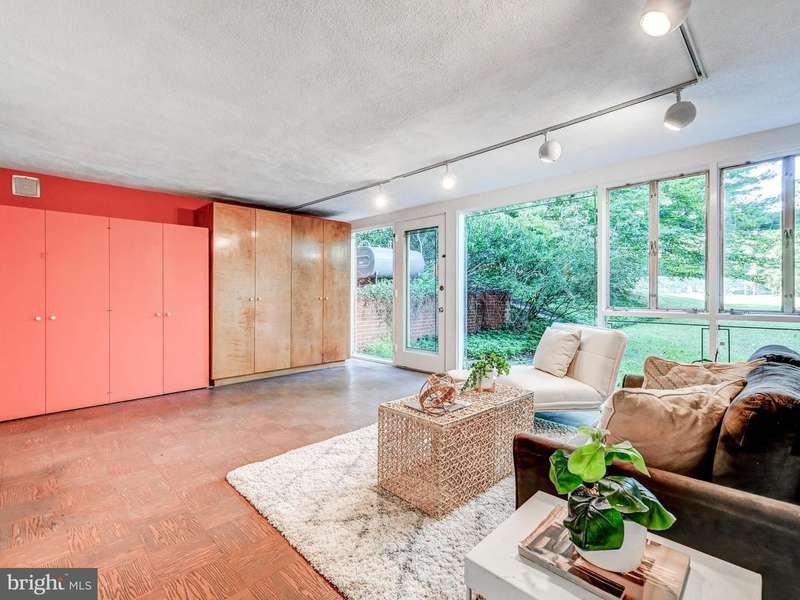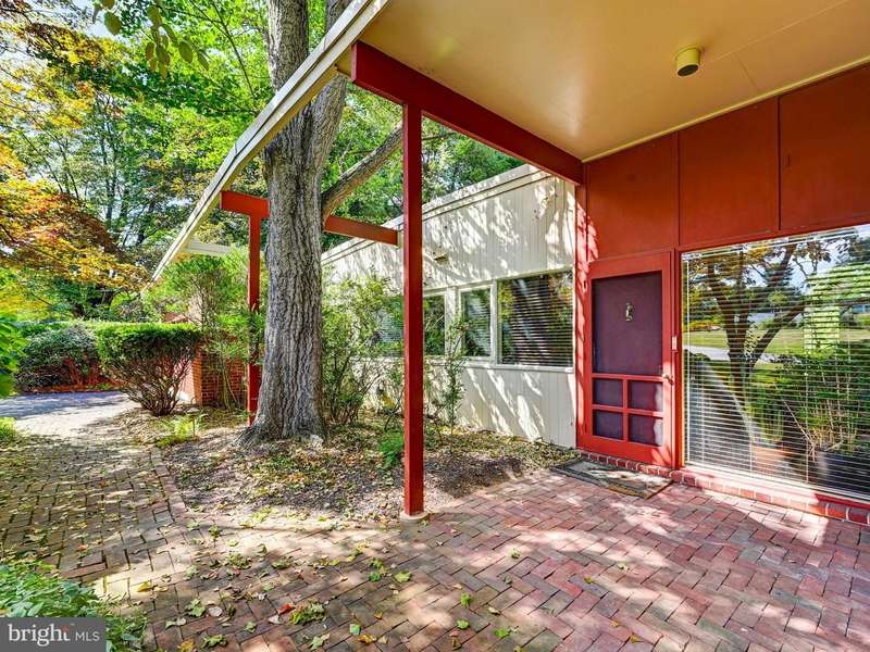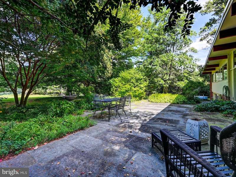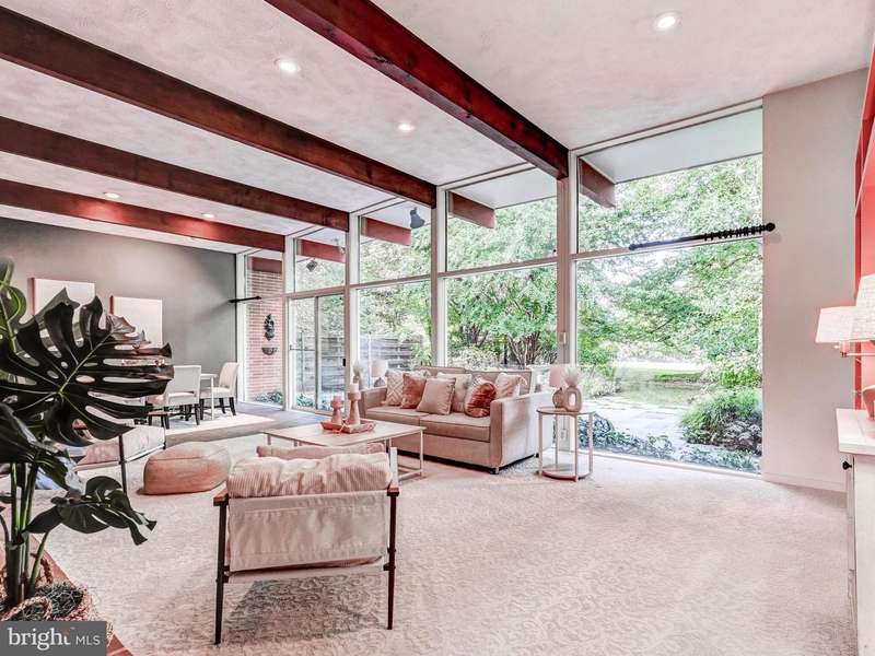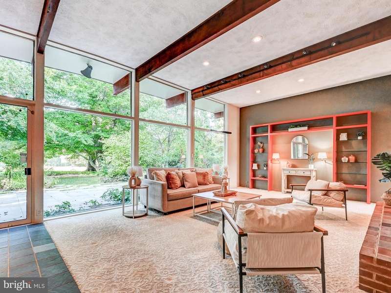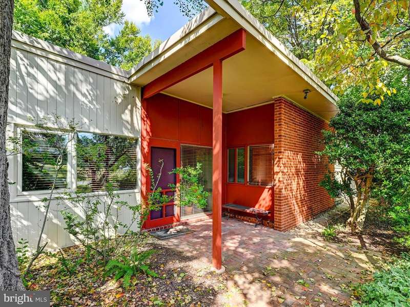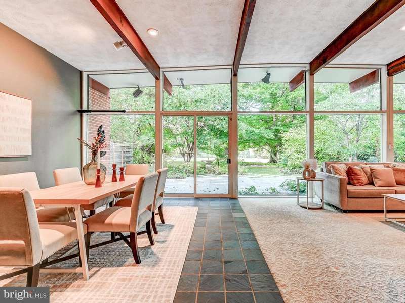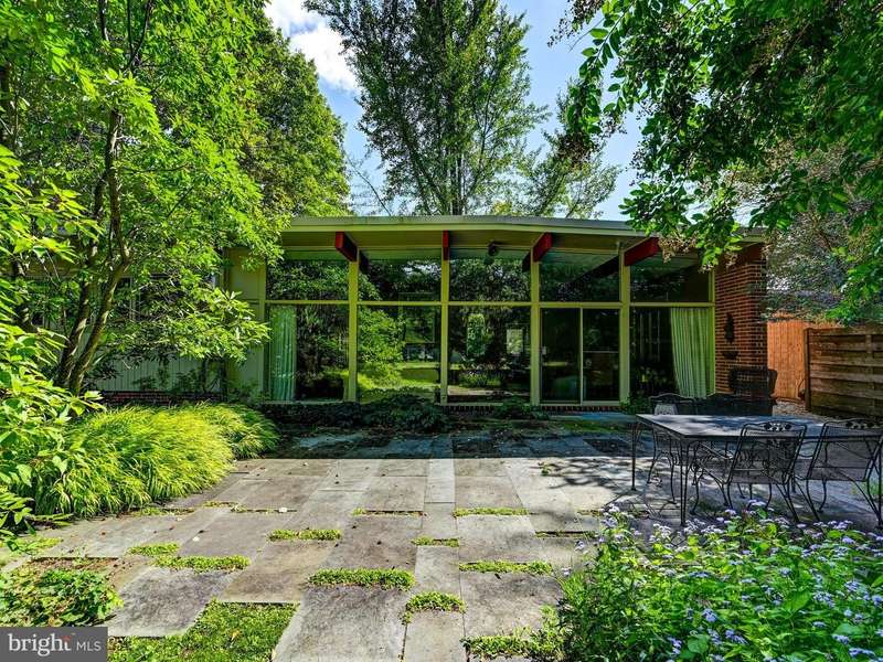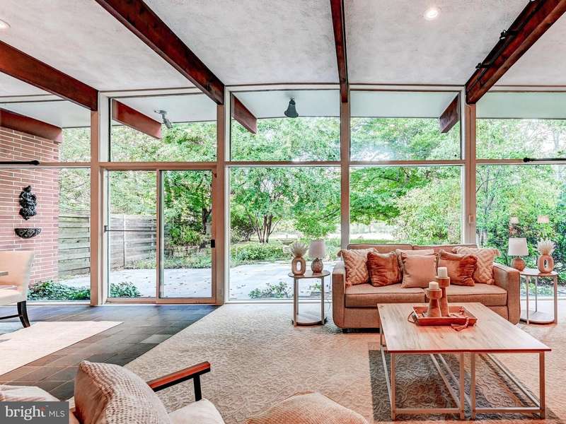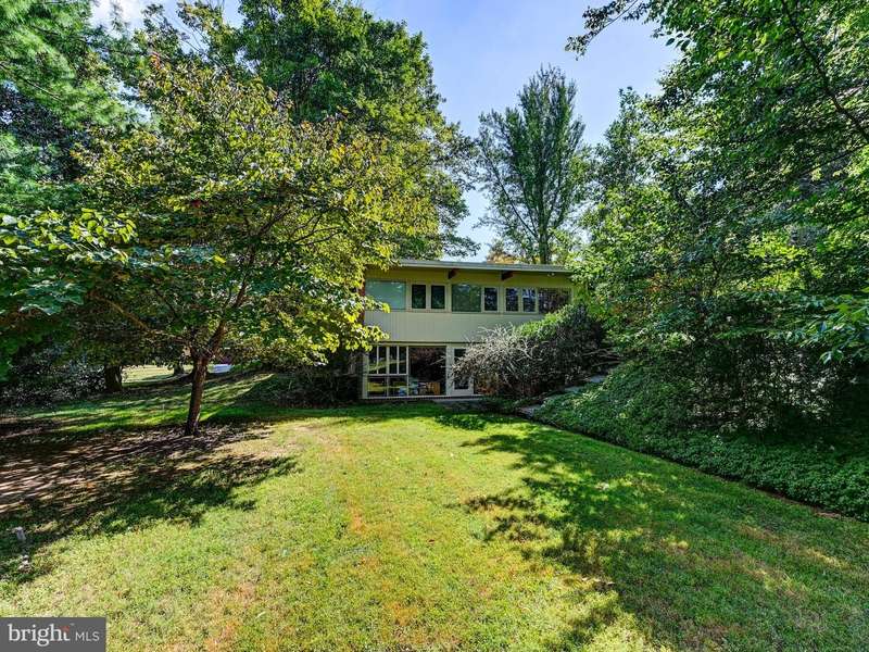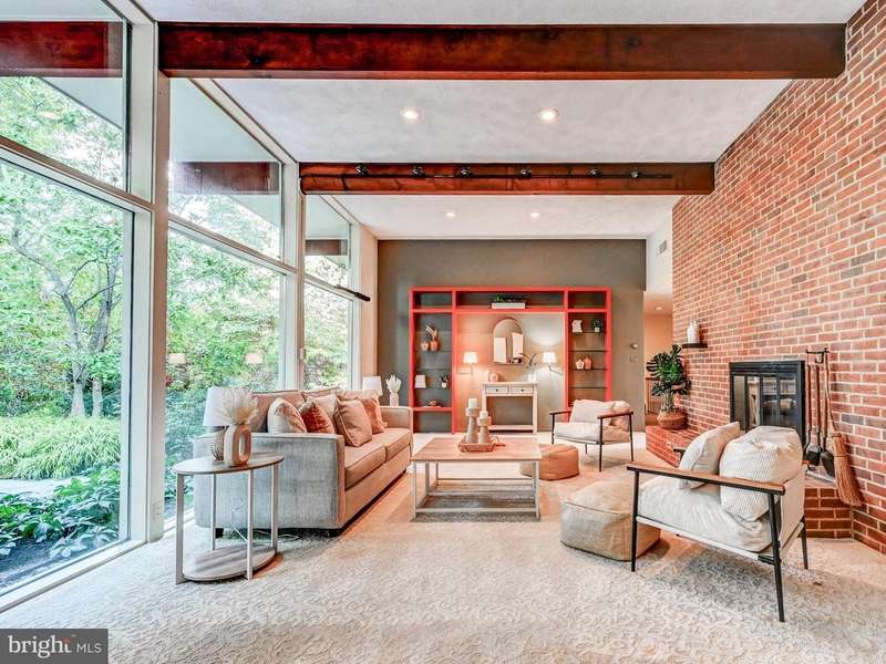 Enjoy easy living in this striking sprawling mid-century modern home with 2 car attached garage on one of the largest corner lots (.97 acres) in the neighborhood. The sun drenched living room & dining room has expansive walls of glass, high beamed ceilings & a brick floor to ceiling fireplace. The eat-in kitchen offers abundant cabinetry, double wall ovens & a convenient main level laundry room. The spacious primary suite features multiple closets & an updated bath with tiled shower. Two additional bedrooms & another full bath complete this level. The bright walkout lower level has lots of windows & includes a large family room with door to rear yard, 4th bedroom currently used as an office & another full bath. A large storage shed provides space for extra storage. The serene parklike rear yard is a wow! There is also an irrigation system & fountain, 3 zones heat & AC replaced 2025. Don't miss this one!