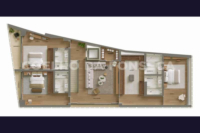 Integração total com a paisagem: O living e as áreas de estar conectam-se por painéis de vidro à varanda, piscina e jardim, maximizando o aproveitamento visual e criando continuidade entre os ambientes.