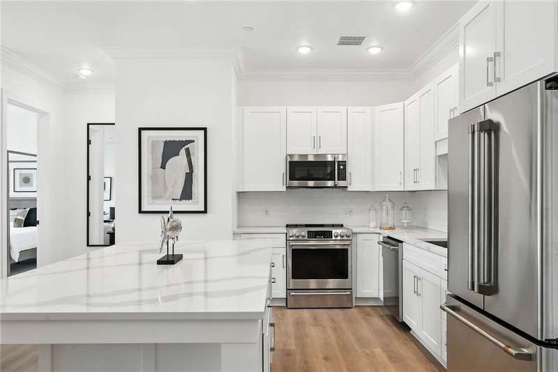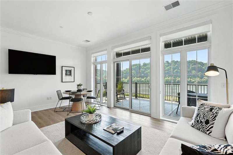 Discover The Brooks, a new resort-style condominium building along the Allegheny River within The River's Edge community. The Brooks condominiums promise an unmatched living experience with breathtaking views. This larger 2nd floor unit, spanning 1,471 sq ft, is located in the north wing of the building. Enjoy breathtaking water vistas from the living area & bedrooms, enhanced by tall windows & spacious covered balcony. A beautifully designed kitchen awaits, showcasing an oversized island, stainless appliances & sleek quartz countertops. Adjacent is a versatile den, perfect as a dining area or home office. Resort-style amenities include a large lobby with water views,event rooms, fitness center, & outdoor infinity pool. One indoor garage space included. HOA fee includes water, sewer, trash, cable, internet, building maintenance/insurance. Property not yet assessed. Photos are of the model unit #305.