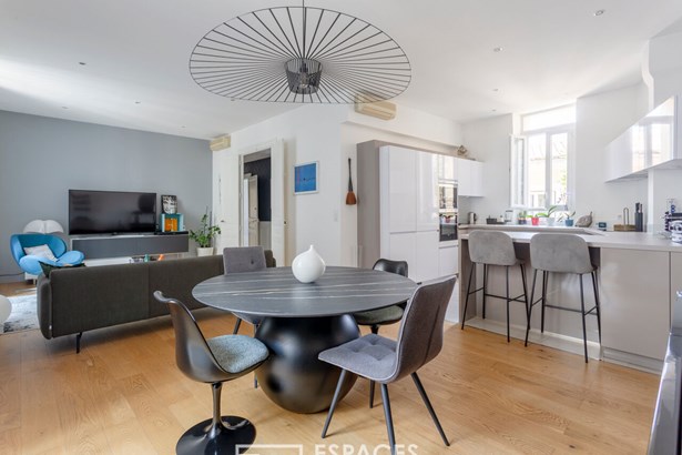 Il se compose d'une piece de vie de 45m2 lumineuse et traversante avec une cuisine equipee ouverte et haut de gamme donnant sur un balcon. Deux chambres spacieuses et une salle d'eau elegante complete l'espace nuit ainsi qu'une buanderie. Vous serez seduit par sa decoration soignee, melant cachet de l'ancien et touches contemporaines.
