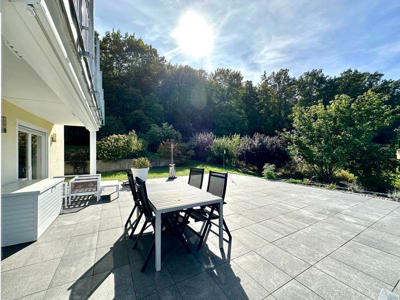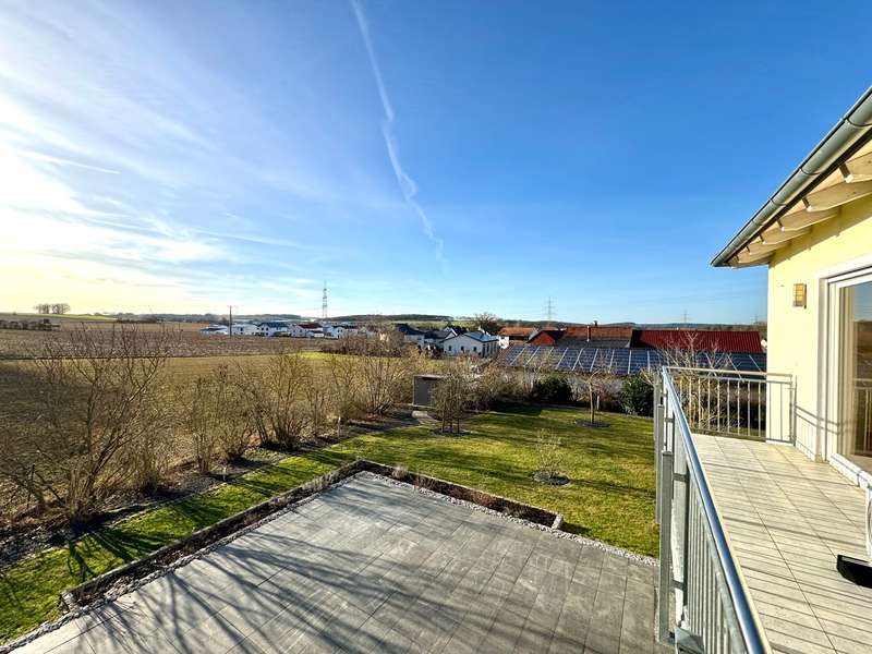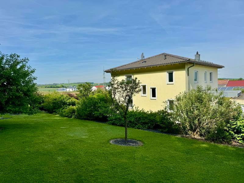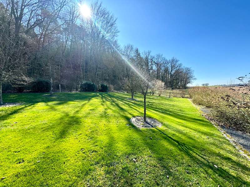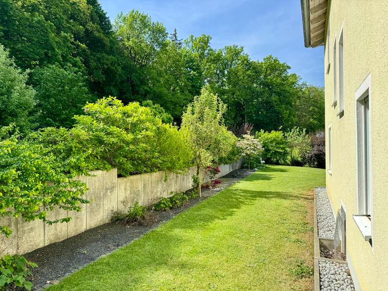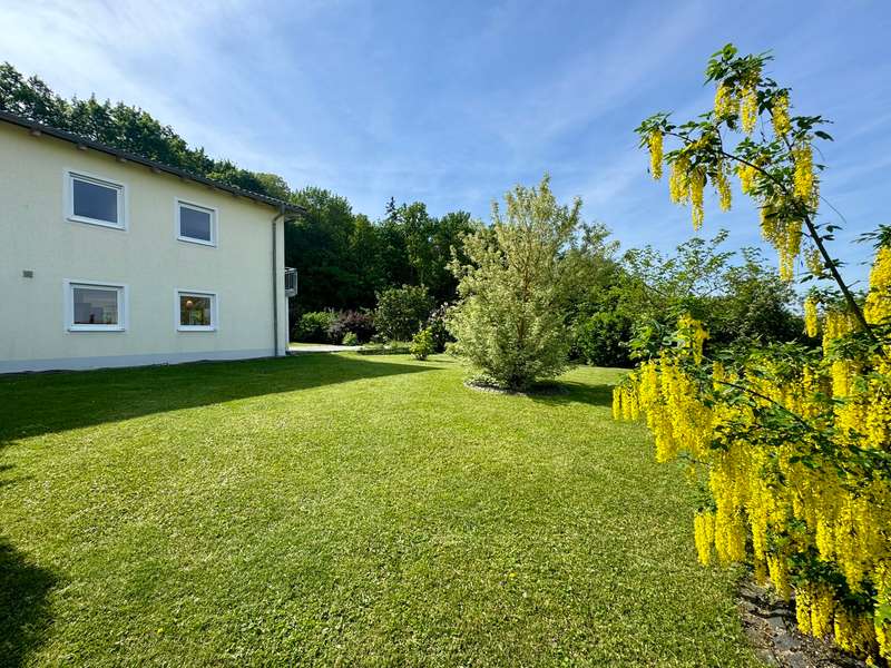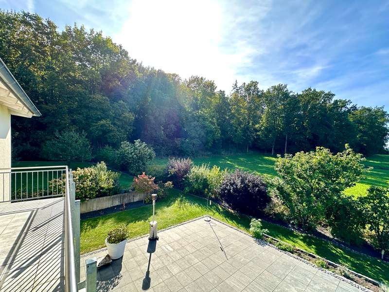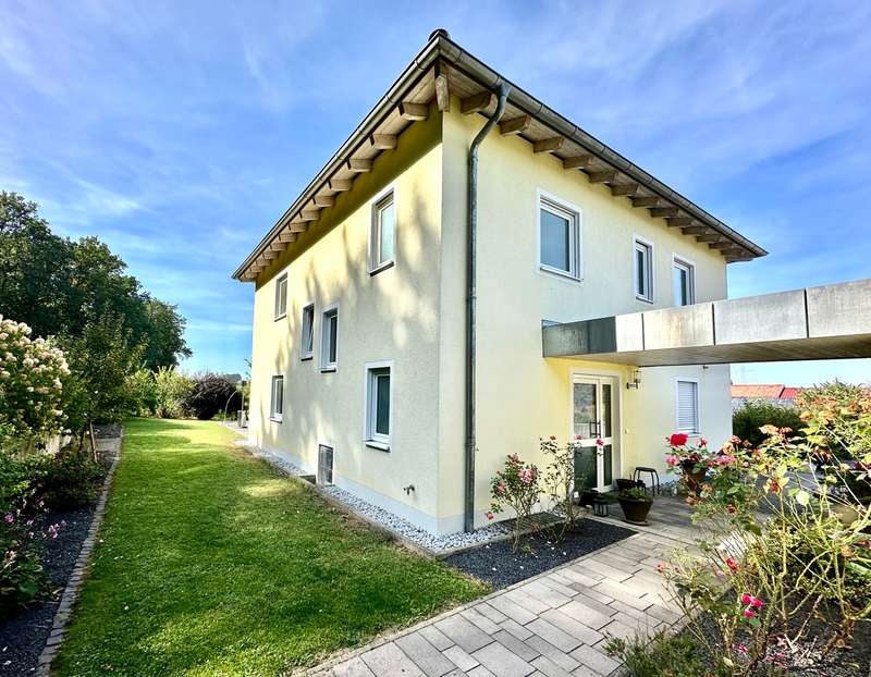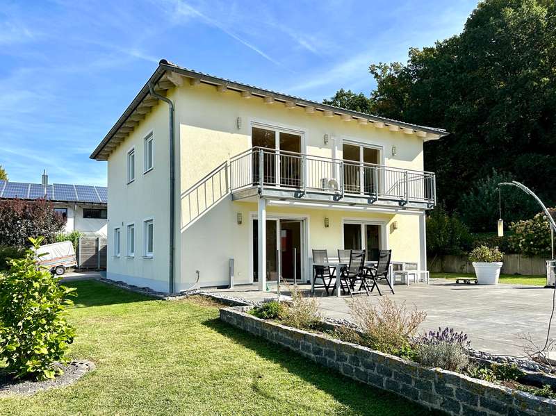 Welcome to your very own personal retreat, a property that is not just a home, but a lifestyle. Wonderfully situated on a nature reserve, this villa estate is a jewel of peace and beauty, surrounded by an idyllic landscape and yet only a few kilometers from the vibrant old town of Regensburg. This exceptional property extends over a generous plot of over 2,200 square meters, which was designed by a renowned landscape architect. It not only offers a breathtaking view of the surrounding nature reserve, but also an incomparable panoramic view of the picturesque landscape. Here you can experience the harmony between nature and luxury. Access to this paradise is granted by an electric roller shutter gate with a long driveway that transforms the property into a private oasis. A spacious garage and paved forecourt provide ample space for your vehicles, while a covered connection between the garage and entrance area ensures dry paths, even in bad weather. The villa-like detached house is presented in immaculate condition with state-of-the-art energy efficiency thanks to solar panels and a well thought-out construction method. With a total of eight rooms on 185 square meters, it offers an optimal room layout for comfortable living in a prime residential location. Upon entering the house, you are greeted by an inviting vestibule that leads to a guest bedroom and a guest bathroom, both with high-quality fittings and attractive tiled décor. The open-plan living areas on the first floor are characterized by high-quality parquet flooring and offer space for a modern fitted kitchen as well as a living and dining room with floor-to-ceiling patio windows that provide plenty of light and direct access to the spacious west-facing terrace. An elegant wooden staircase leads to the bedrooms and children's rooms, all of which are equipped with a wonderful panoramic view and modern amenities. The master bedroom has its own dressing room and access to a large balcony, while a second children's bedroom and a luxurious bathroom with bathtub and floor-to-ceiling glass shower are further highlights of this floor. The house also offers plenty of additional space in the basement, including a large heated hobby room, a laundry room and ample storage space to suit your needs. The extensive garden area comprises two areas: one with valuable plant stocks and one with a meadow orchard, which is managed by an intelligent robotic lawn system. Enjoy the privacy and tranquillity as you stroll through your own orchard or explore the beauty of the adjacent Kreuther Forest. Sale against bid in a bidding process - minimum offer 465,000 euros. Viewing period on Sunday, 07.07.24 from 12.00 to 14.00. Please register in advance for the viewing.