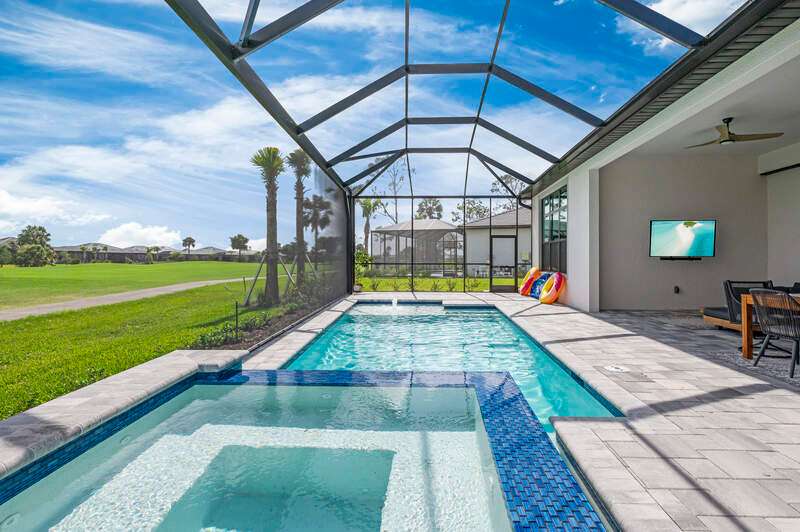 Why wait for new construction? This upgraded 2024 Layton Model is move-in ready. Thoughtfully designed, the sought-after floor plan features 3 bedrooms, 3.5 bathrooms, and a versatile den with French doors and a custom Murphy bed-perfect as a home office, library, playroom, or media room. From the brick-paved driveway and tile roof to the professionally landscaped yard, the curb appeal is undeniable. The oversized 3-car garage includes epoxy flooring, generous storage, and space for a golf cart. Inside, enjoy wood-look ceramic tile flooring, tray ceilings, upgraded lighting, impact glass windows, and smart home technology. The chef's kitchen is a showstopper with sleek white cabinetry, premium KitchenAid appliances, a natural gas cooktop, quartz countertops, a custom backsplash, and a large island with seating plus a cozy cafe area. The spacious primary suite offers a tray ceiling, abundant natural light, a custom walk-in closet, and a spa-like bath with dual vanities, an expansive walk-in shower, and designer finishes. Step outside to your private lanai with panoramic golf course views, invisible screening, and a gas-heated pool and spa-ideal for year-round enjoyment. Located in the highly desirable Terreno at Valencia community-now featuring the Grand Clubhouse, officially open! Residents enjoy access to a stunning community room, card & activity room, elegant event hall, catering kitchen, state-of-the-art fitness center, exercise studio, party pavilion, resort-style pool and spa, and sports courts with pickleball and tennis. This home is in an X Flood Zone (no flood insurance required) and is conveniently located across from a new Publix (opening soon), with easy access to schools, healthcare, shopping, dining, golf, and Gulf beaches. ?Luxury. Location. Lifestyle.