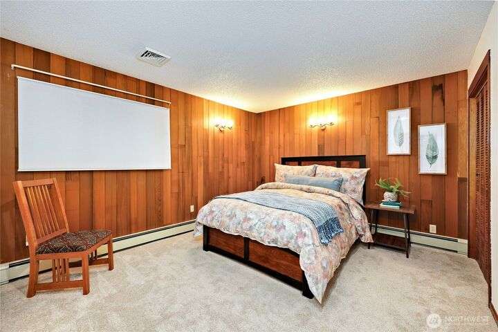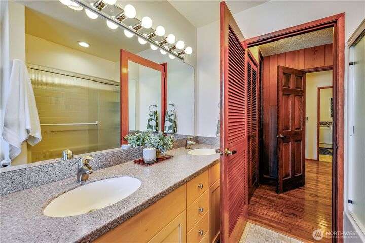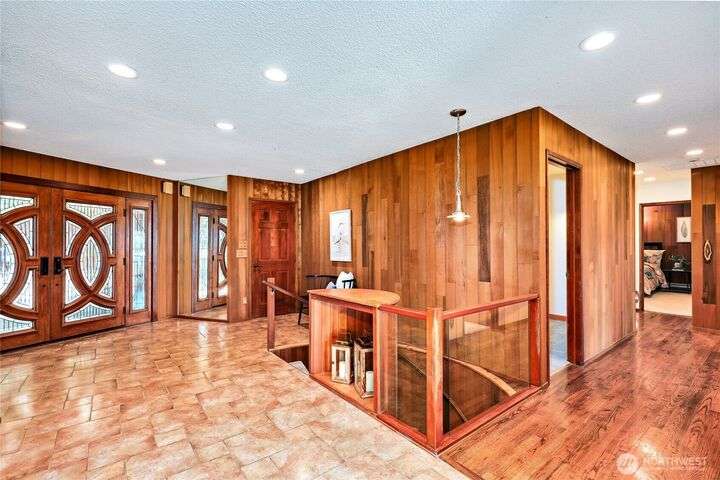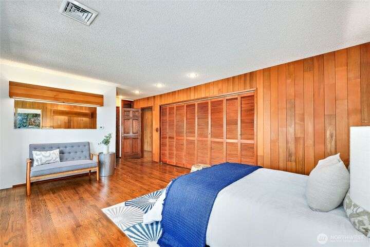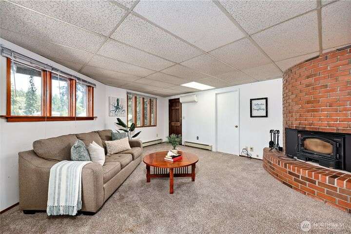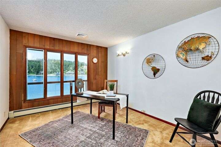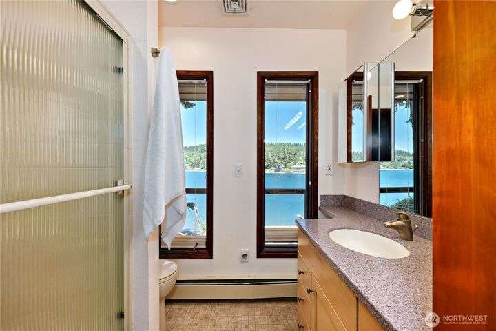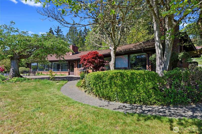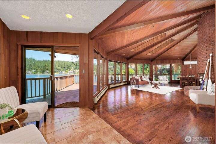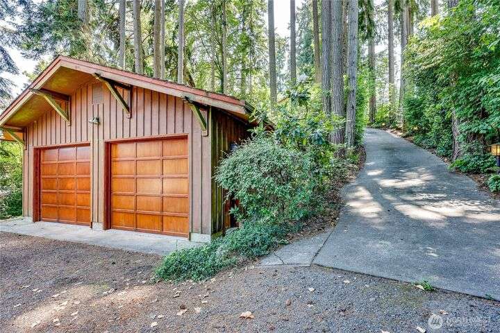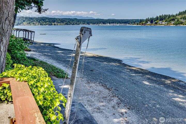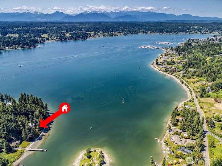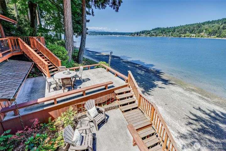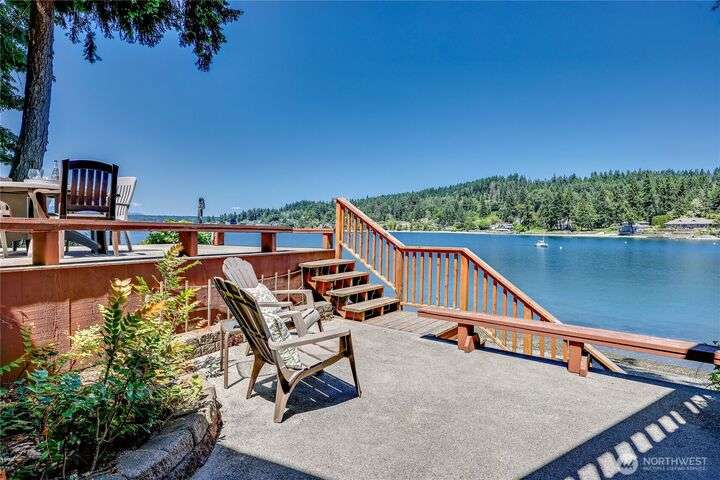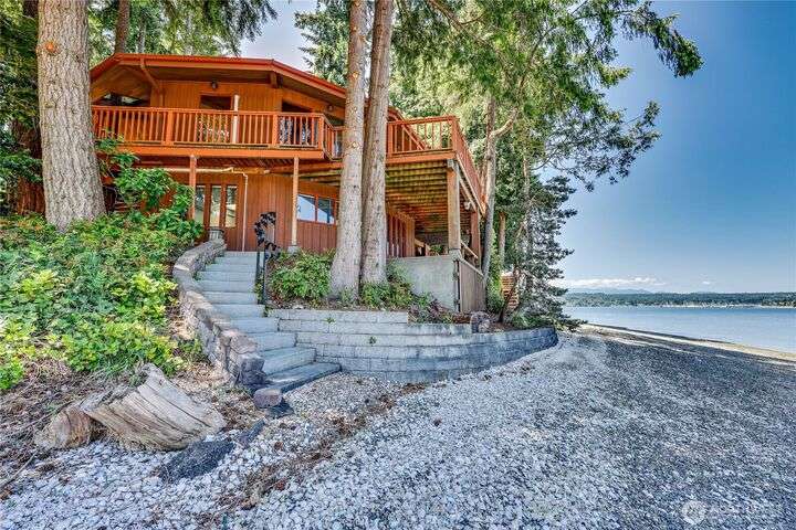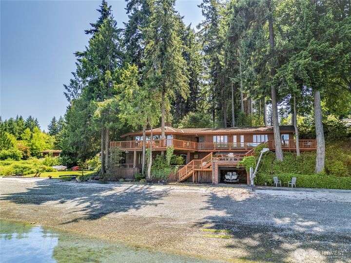 Nestled down a lane in the sought-after Lemolo community, this mid-century home offers breathtaking views of Liberty Bay and direct access to a sandy beach. Wrapped in cedar and filled with character, this home features soaring ceilings, hardwood floors, a dramatic fireplace, and expansive walls of windows that bring the outdoors in. Primary ensuite on main. Lower level is perfect for guests/entertaining. Multiple decks provide the ideal setting for postcard-worthy vistas of Liberty Bay, passing boats, and the Olympic Mtns. Add'l highlights include a boathouse at the water’s edge and a detached two-car garage with shop space. Enjoy a fun lifestyle with endless opportunities for crabbing, swimming, kayaking, paddleboarding, and boating.