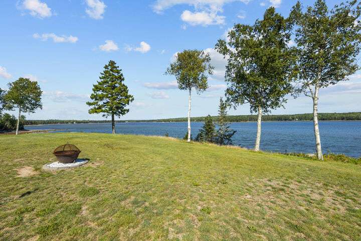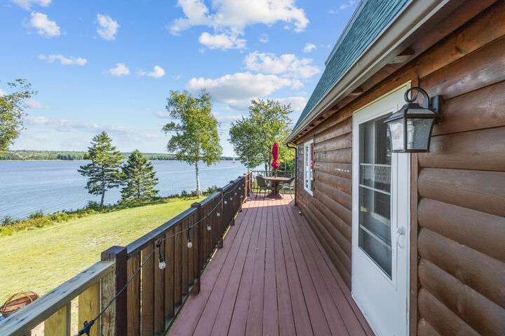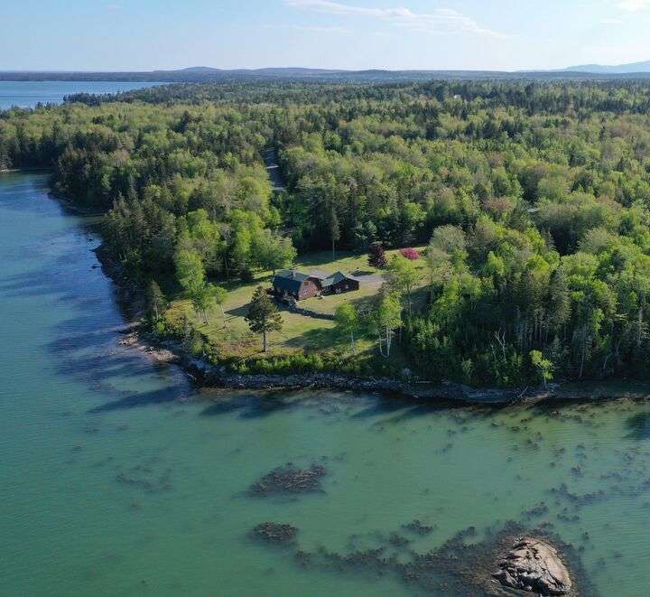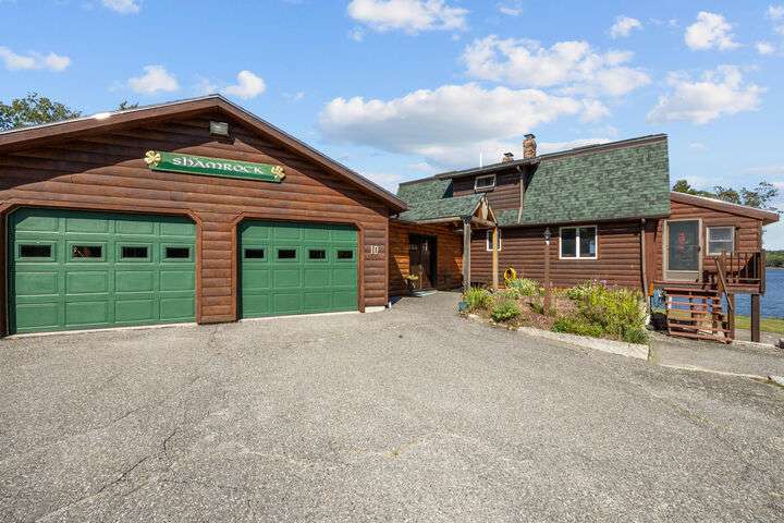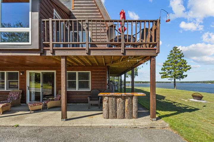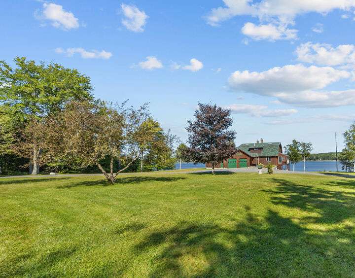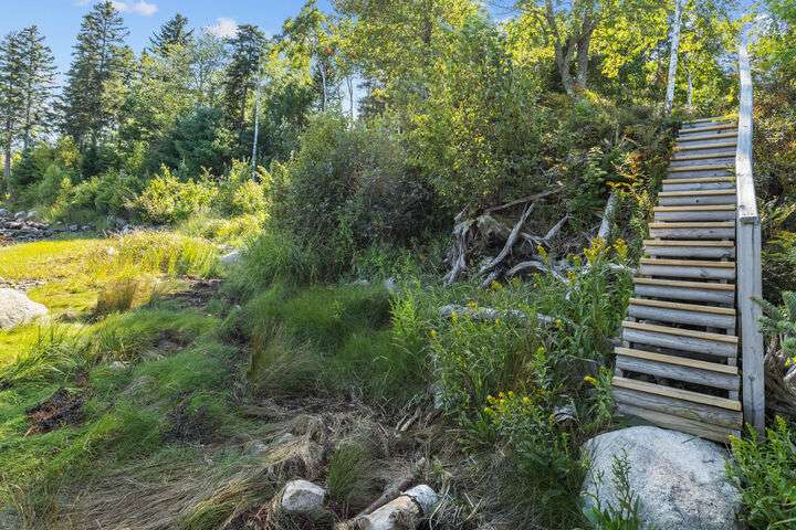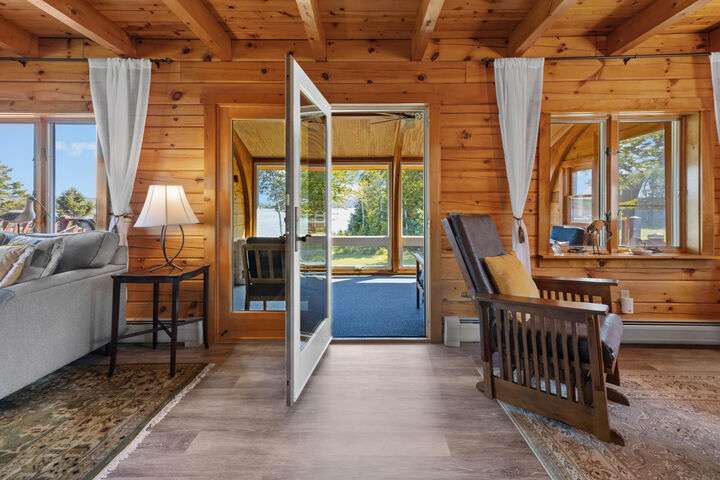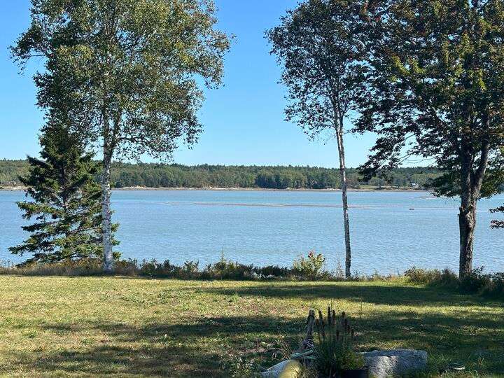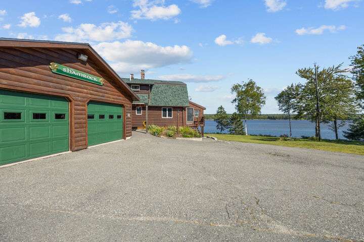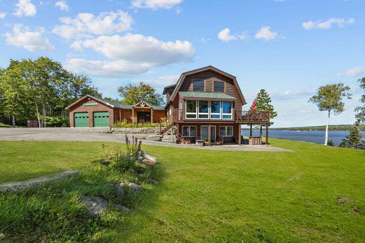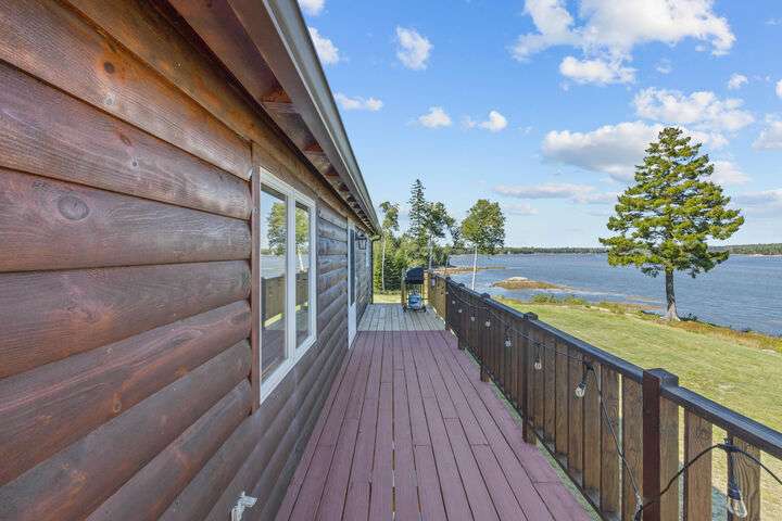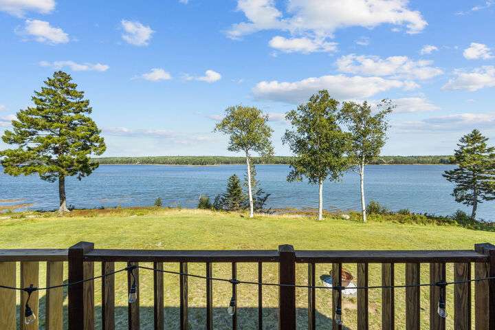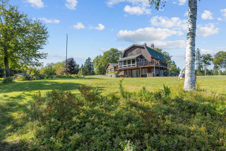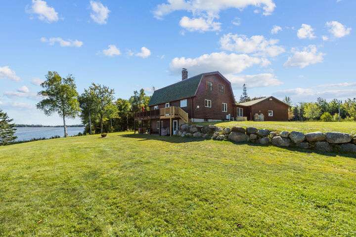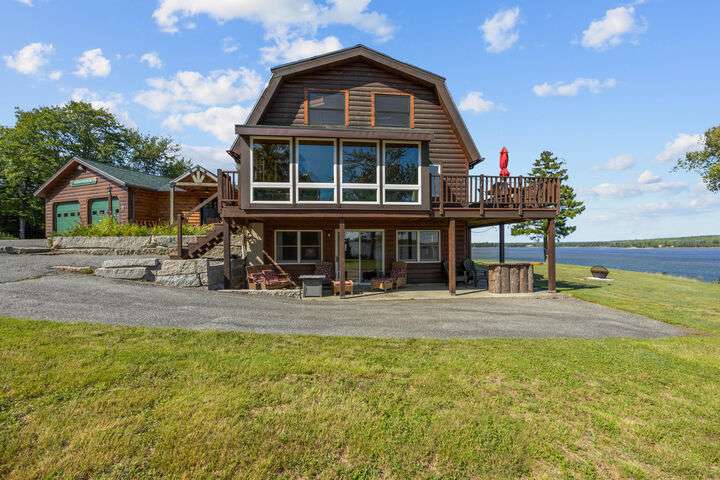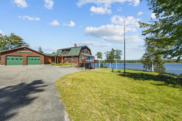 Nestled on 3+ acres with 340 feet of shoreline on Joy Bay, this post and beam log style home offers the perfect balance of rustic charm and stunning coastal views. Enjoy sweeping views of the bay from the wrap around deck or the light filled sunroom with sights of lobster boats passing by in the summer. A private stairway leads directly down to the shore for water access. Inside, the main level features a thoughtful custom kitchen and dining area, a spacious living room, a full bathroom, and sunroom that opens onto the deck. Upstairs, the second floor includes a large primary bedroom, two additional bedrooms and a full bathroom. The walkout basement adds flexible living space with a finished bonus room with a full bathroom and laundry room, offering direct access to an outdoor patio. Currently setup as a guest space and bedroom. Additional highlights include an attached two-car garage with large entryway, paved driveway, and a small charming pond tucked into the landscape. Recent improvements include the renovated kitchen, new flooring on main and second levels, and new roof shingles in 2021. Conveniently located near Gouldsboro Point Boat Launch and approximately 15 miles to Acadia National Park Schoodic Peninsula.