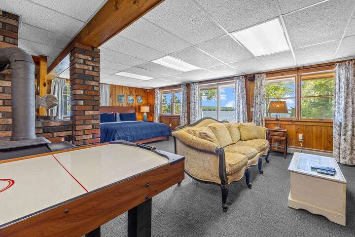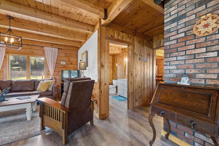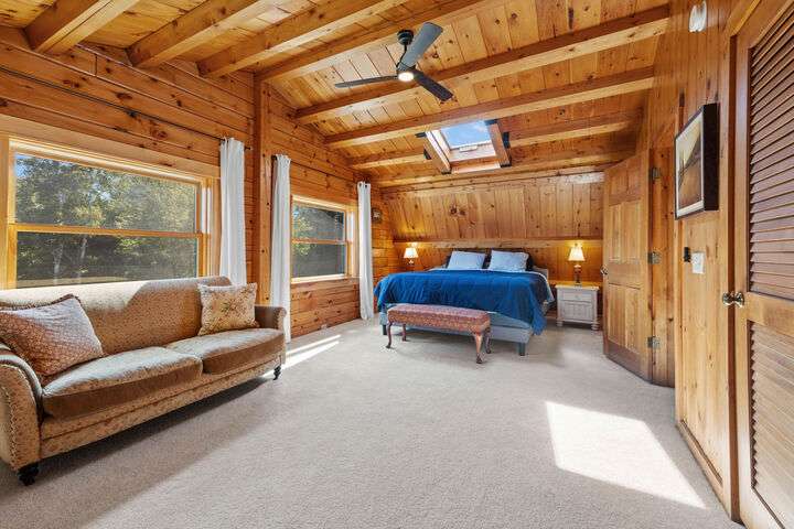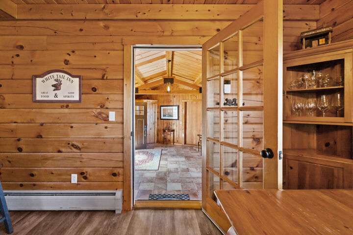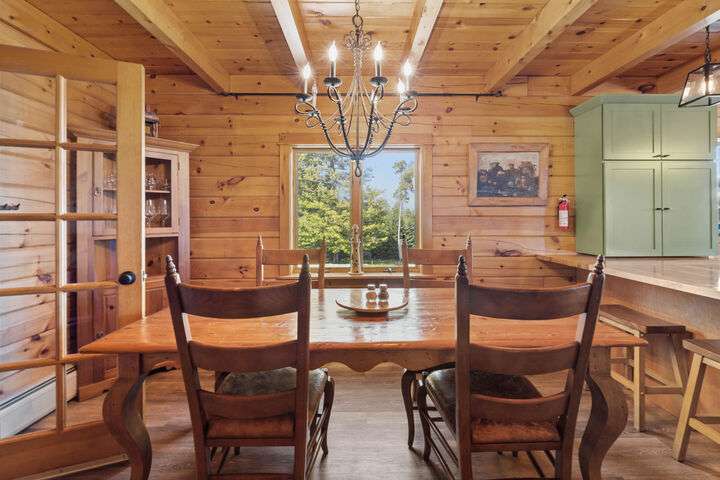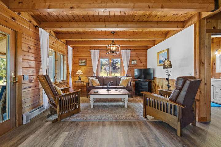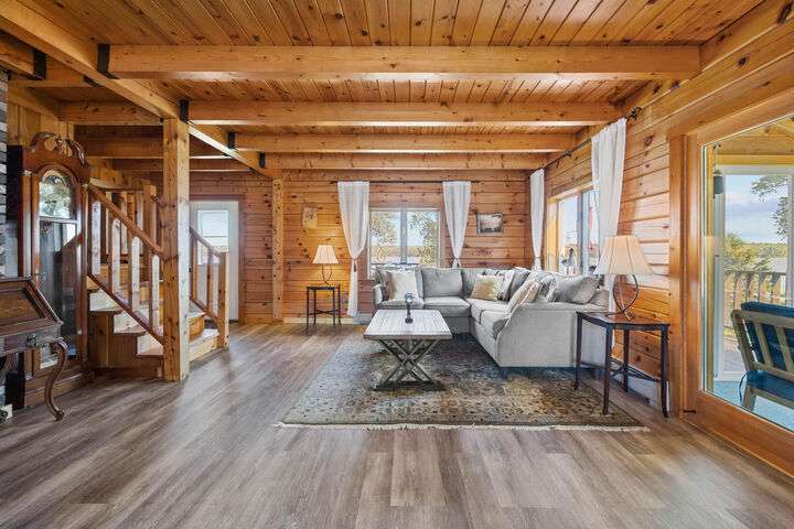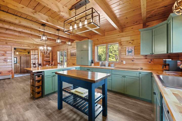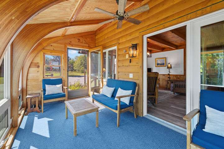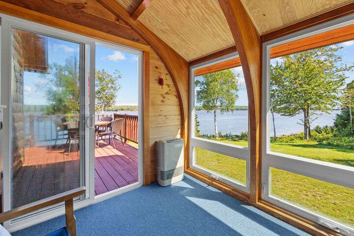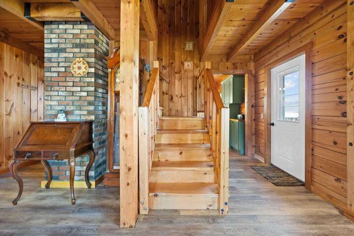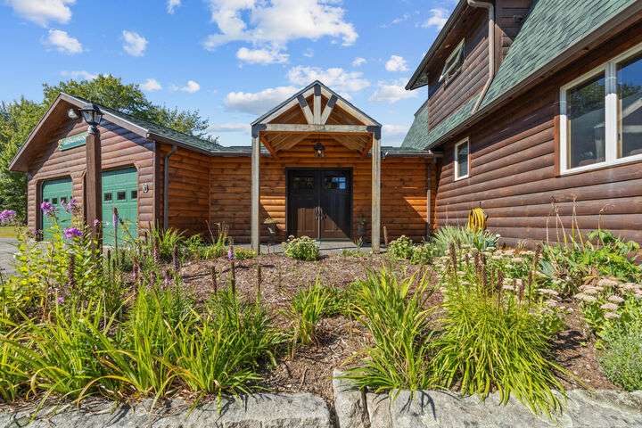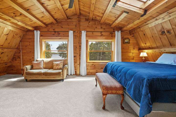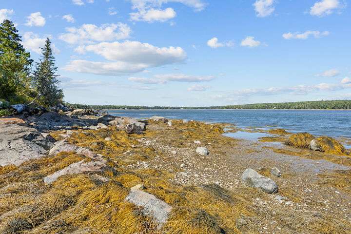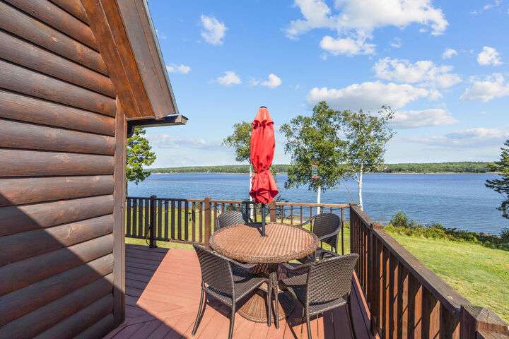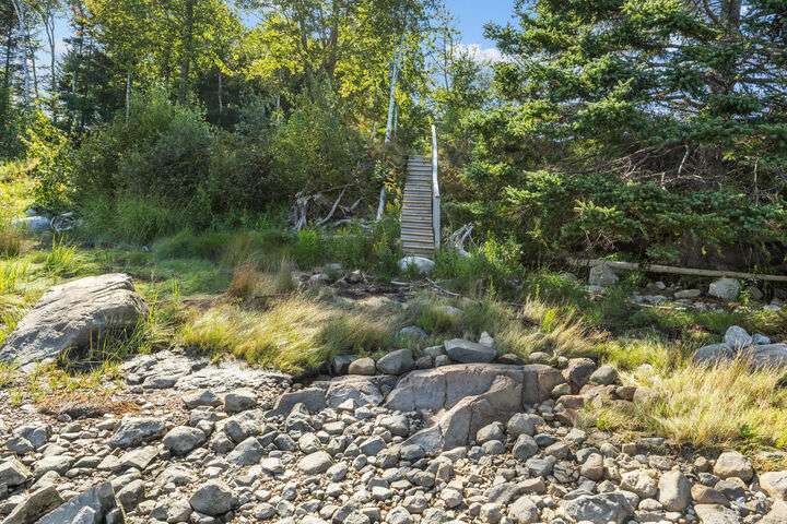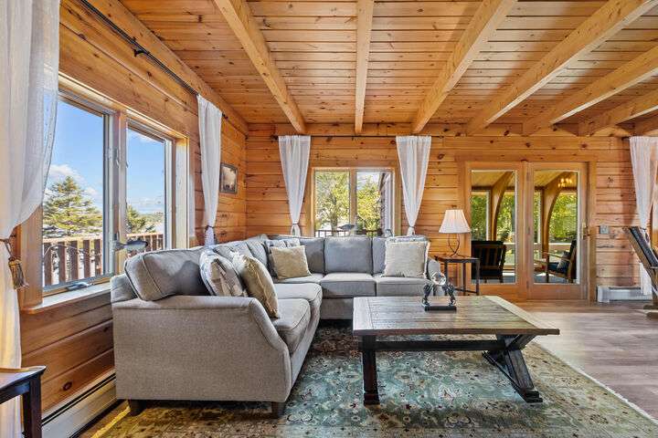 Nestled on 3+ acres with 340 feet of shoreline on Joy Bay, this post and beam log style home offers the perfect balance of rustic charm and stunning coastal views. Enjoy sweeping views of the bay from the wrap around deck or the light filled sunroom with sights of lobster boats passing by in the summer. A private stairway leads directly down to the shore for water access. Inside, the main level features a thoughtful custom kitchen and dining area, a spacious living room, a full bathroom, and sunroom that opens onto the deck. Upstairs, the second floor includes a large primary bedroom, two additional bedrooms and a full bathroom. The walkout basement adds flexible living space with a finished bonus room with a full bathroom and laundry room, offering direct access to an outdoor patio. Currently setup as a guest space and bedroom. Additional highlights include an attached two-car garage with large entryway, paved driveway, and a small charming pond tucked into the landscape. Recent improvements include the renovated kitchen, new flooring on main and second levels, and new roof shingles in 2021. Conveniently located near Gouldsboro Point Boat Launch and approximately 15 miles to Acadia National Park Schoodic Peninsula.