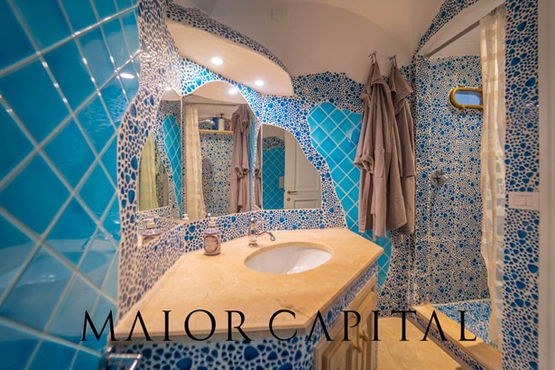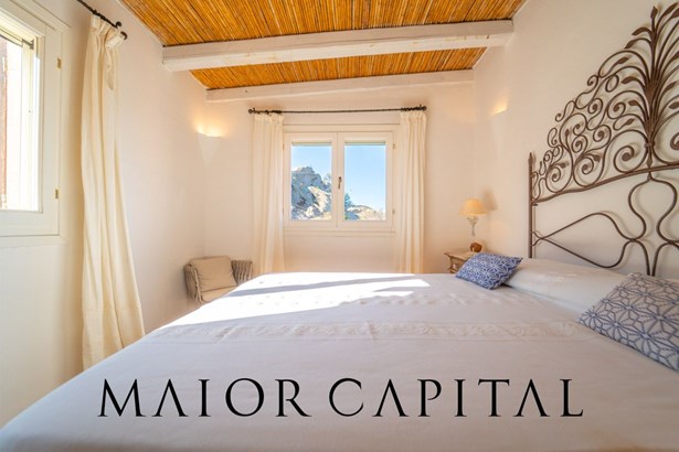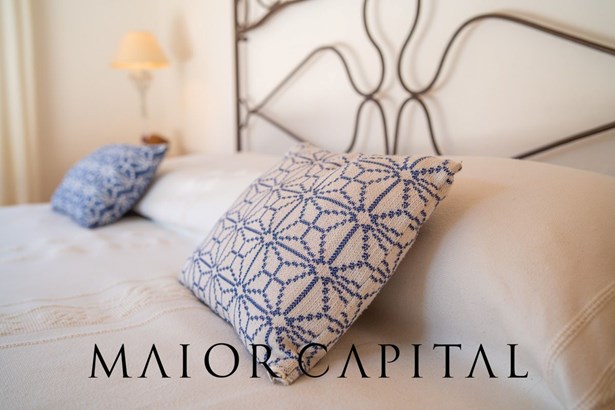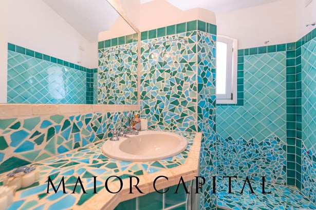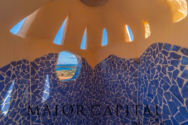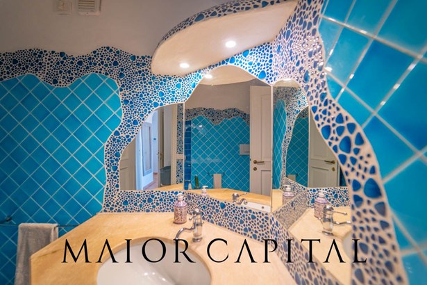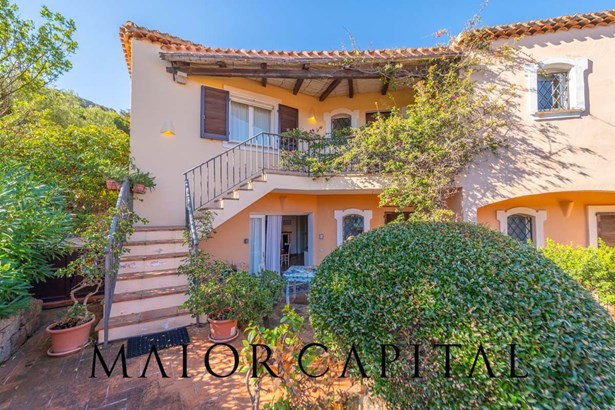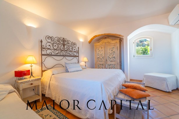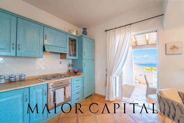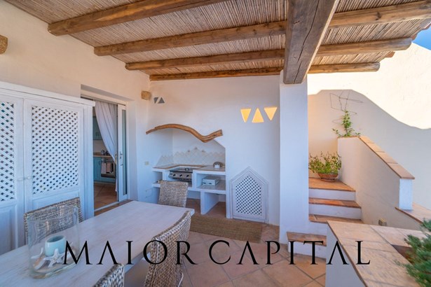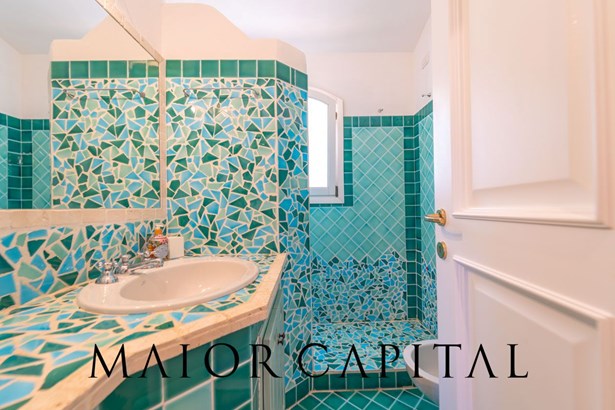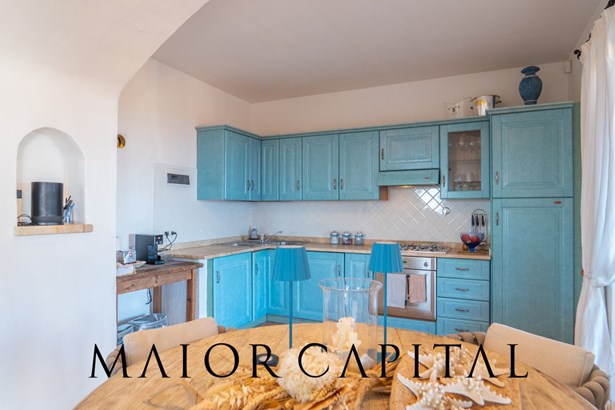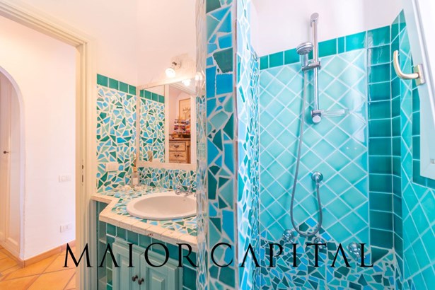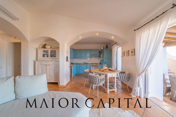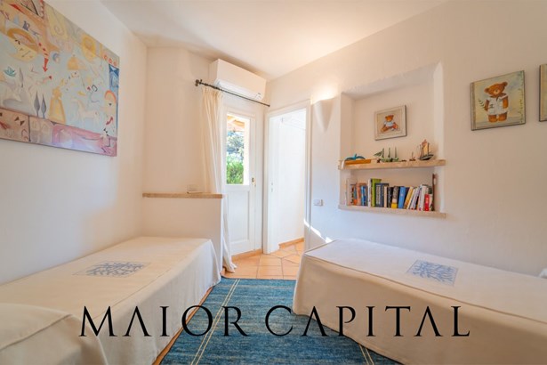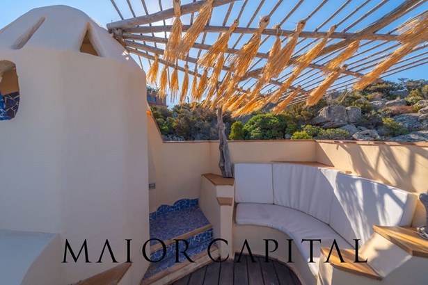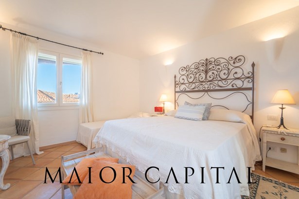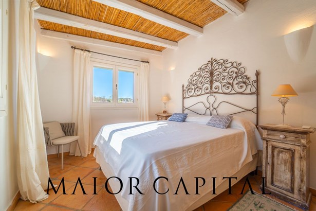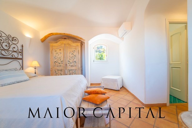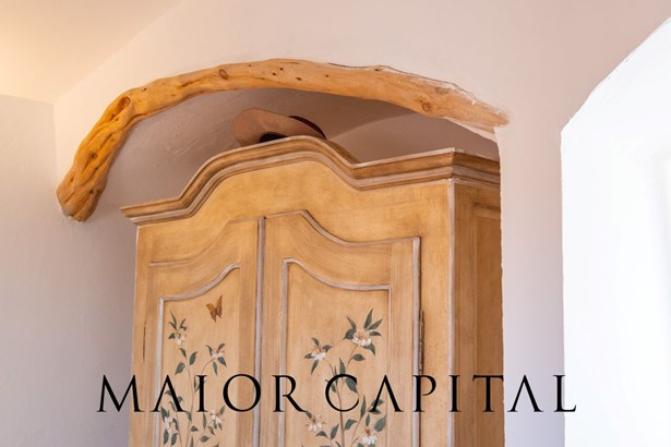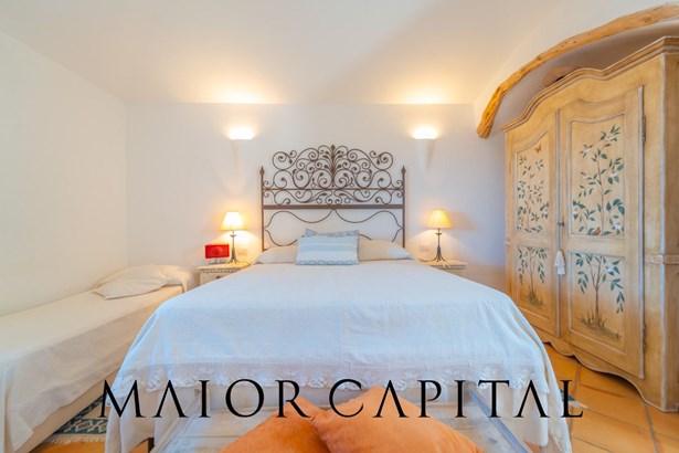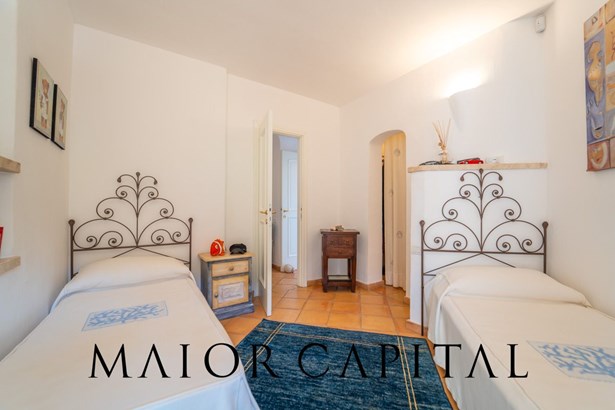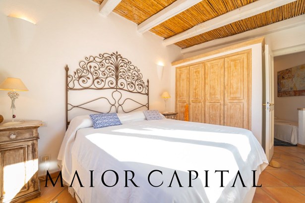 The sleeping area offers three bedrooms: two double and one twin. The furnishings evoke Sardinian tradition, with hand-painted wardrobes and wrought iron details that add timeless elegance. Two refined bathrooms, clad in Cera Sarda, complete the property, adding a touch of fine craftsmanship.