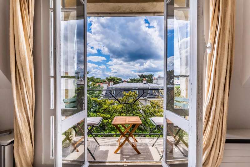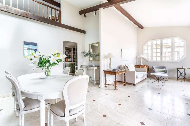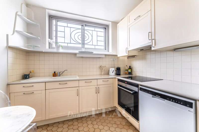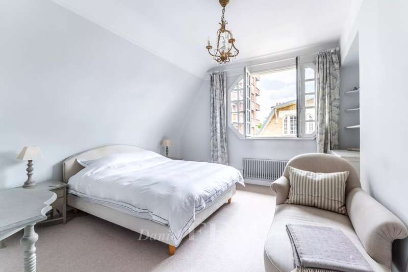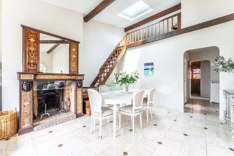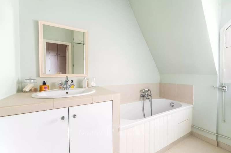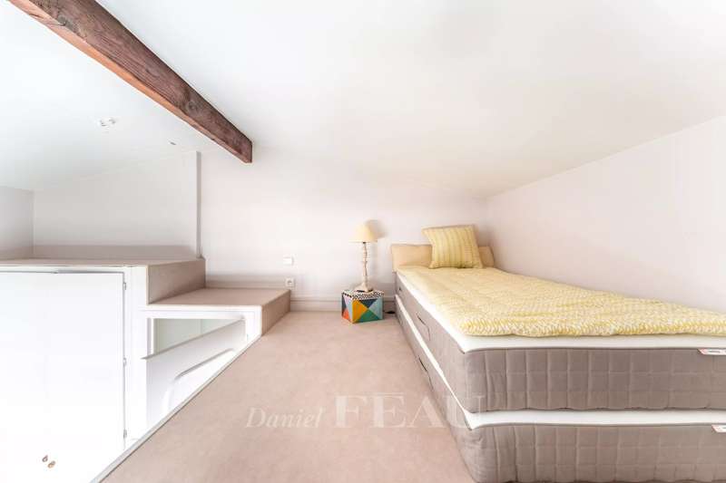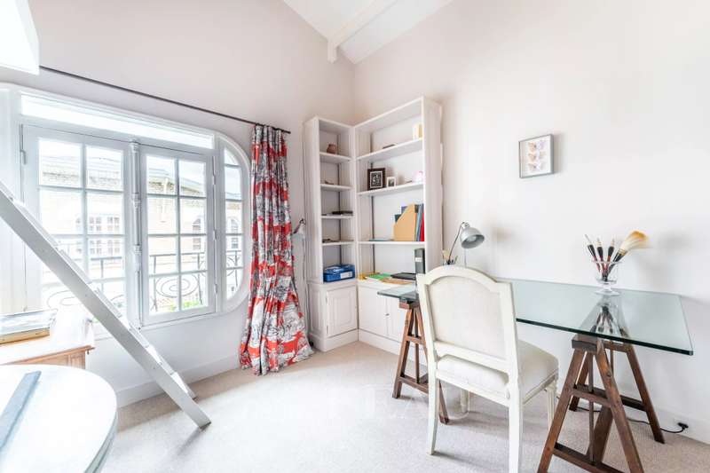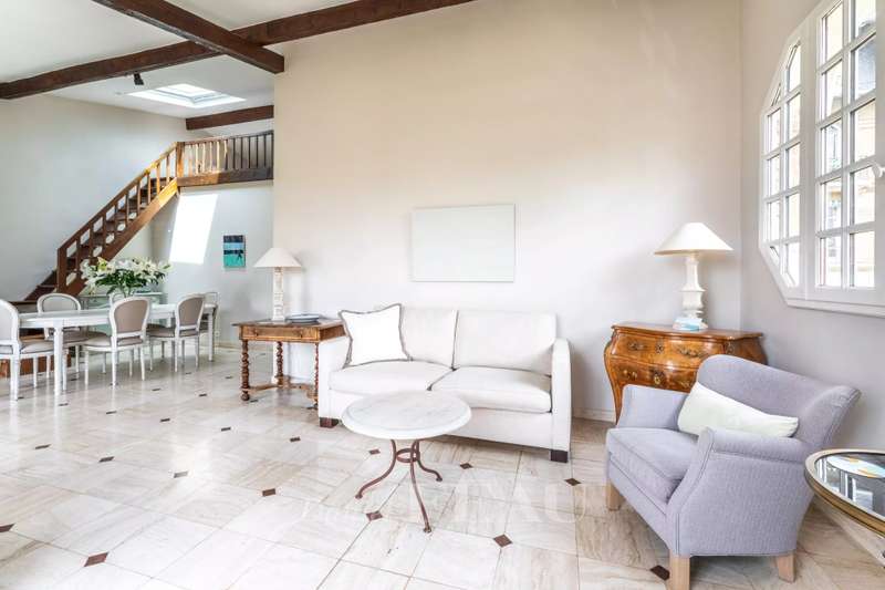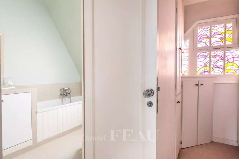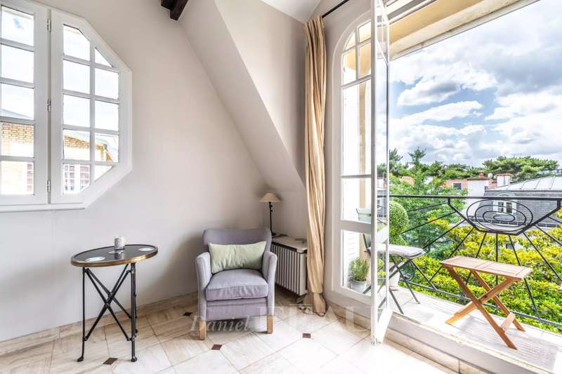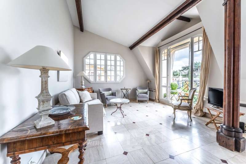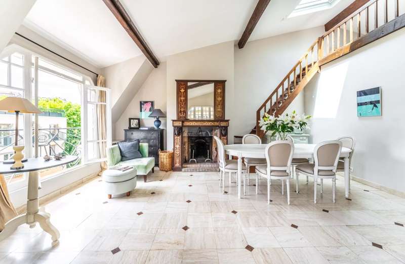 This bright apartment on the 3rd and top floor of a 1930’s private mansion located in a peaceful and sought-after street offers 118 sqm of floor space and 88.71 sqm of living space as defined by the Carrez Law. It includes a spacious living/reception room with a fireplace and featuring exposed beams and a mezzanine opening onto a little south-facing balcony benefiting from no facing neighbours, an equipped kitchen, a spacious master bedroom, a second bedroom with a mezzanine, a bathroom/wc and a shower room/wc. Ample fitted storage space. With a cellar. A superb pied a terre on the south-western edge of the capital.