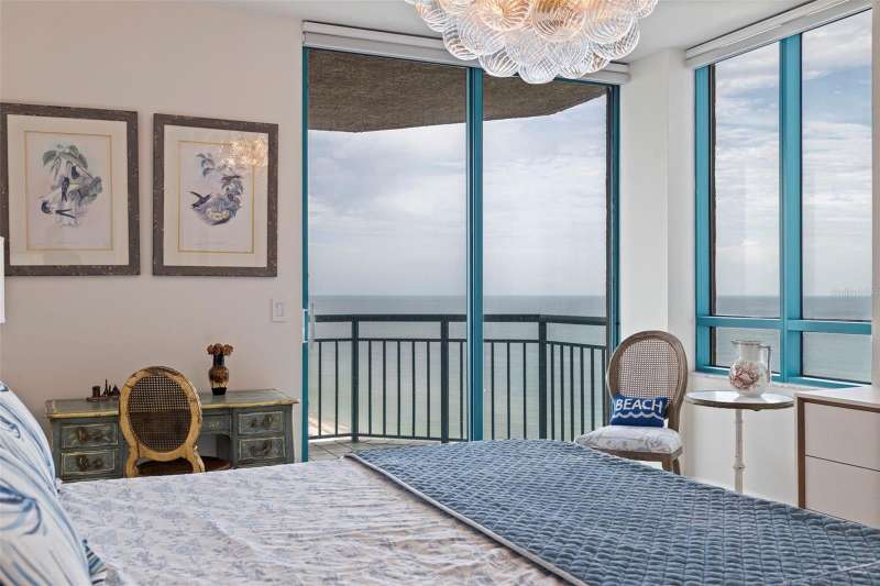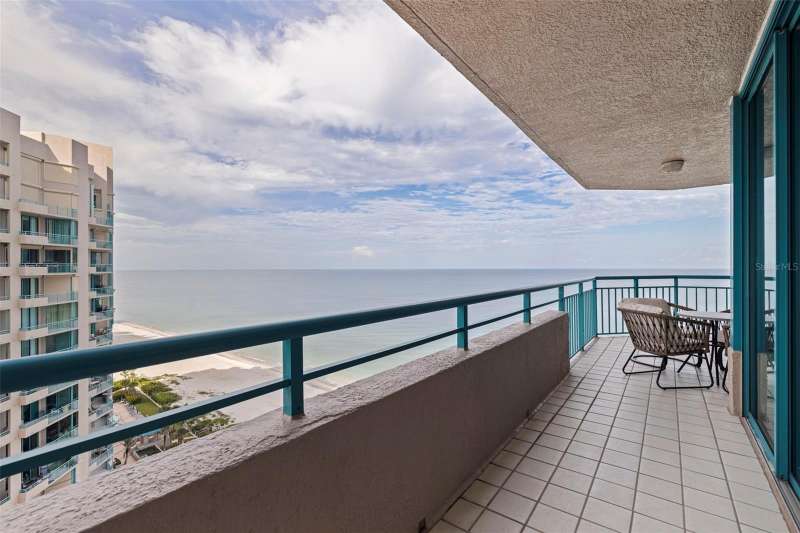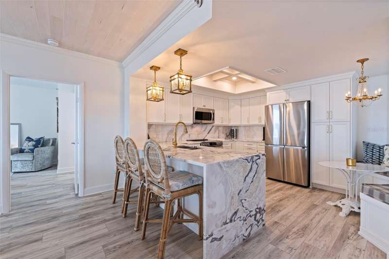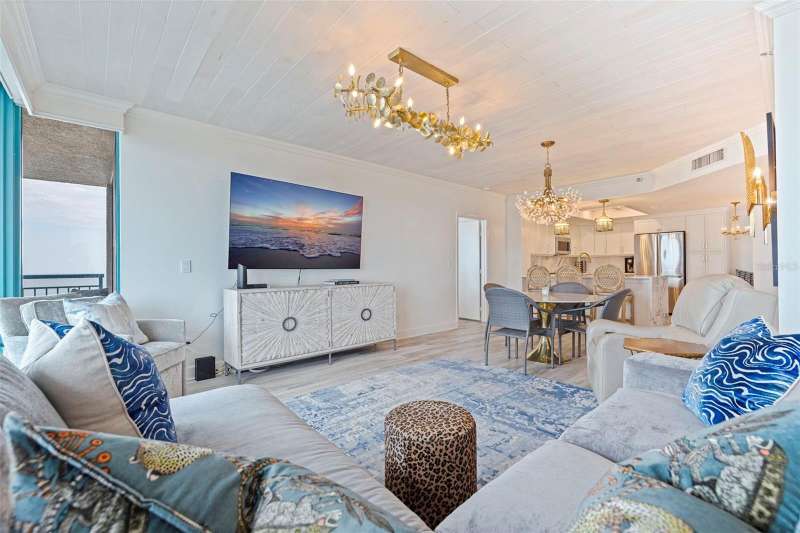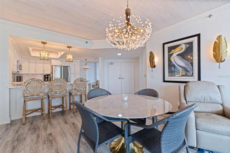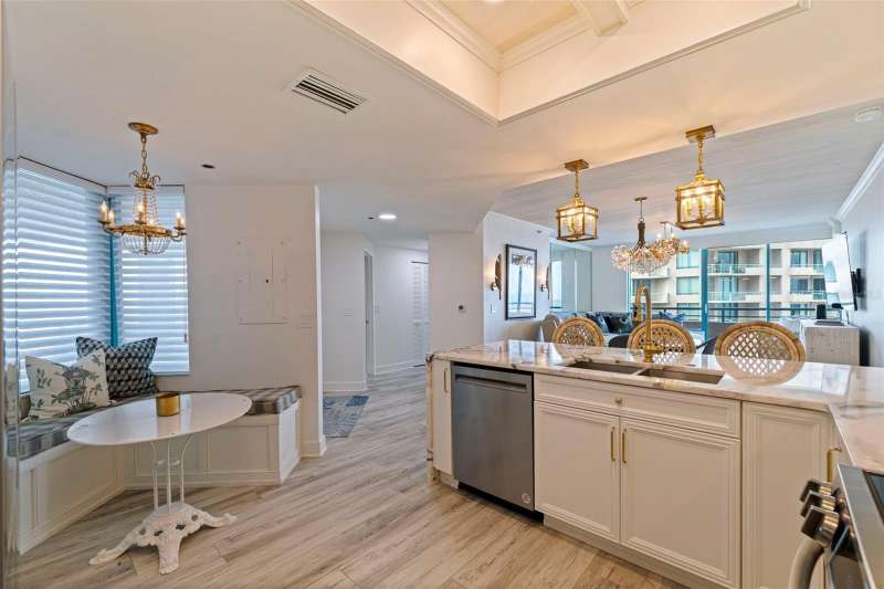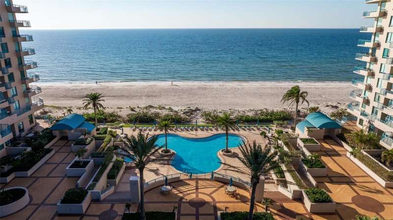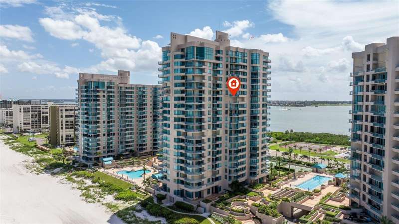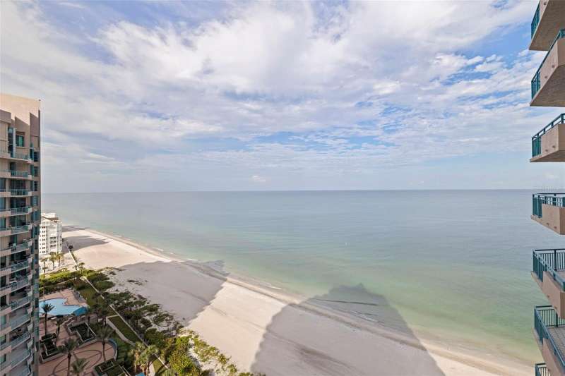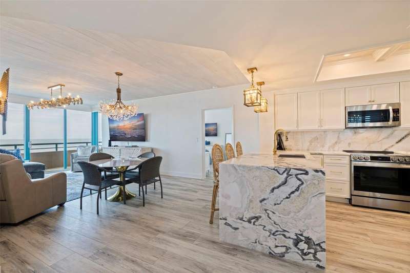 Under contract-accepting backup offers. ELEGANCE BY THE SEA! Step into this tastefully updated condo featuring upscale finishes & situated on the sugary sands of Sand Key Beach. Southwest exposture features views way down the beach with stunning sunsets everyday & Intracoastal views! Living Room & Primary Bedroom have sliders that open to a spacious balcony. Luxury Plank flooring throughout for easy maintenance. Living room has wood detail on the ceiling with crown molding. Kitchen featuries wood coffered ceiling. A gourmet's delight with stainless steel appliances, custom kitchen cabinery with Calacatta Namibia Dolomite countertops, slab backsplash & waterfall edge. Eat-in area with banquette seating & storage. Breakfast bar that opens to the living/dining room. Remote Sun Shades at all windows & doors with custom wood valances. Open floorplan with split bedrooms. Wake up in the Primary bedroom to the sounds of crashing waves & beautiful views of the Gulf. Wood wainscotting, large walk-in closet designed by California Closets & ensuite bath. Custom double vanity with dolomite countertops, & lighted vanity mirrors. Separate marble wet area with huge walk-in shower, bench & linen storage. Guest bedroom also features great views of the Gulf & lalrge walk-in closet. Guest bath has designer wallpaper with marble floors & marble walk-in shower. Designer lighting throughout featuring chandeliers by Visual Comfort, John Richard, Palacek and Currey & Company. A/C condensor, air handler & thermostat 2022. Coveted PRIVATE GARAGE #82 in parking garage. The Ultimar is a world class condo complex on Sand Key of famous Clearwater Beach. Miles of pure white sand. Lush tropical landscaped grounds are expertly maintained. 24 hr guard gated. True Resort Style complex has 3 geo thermal heated pools w/spas, 3 tennis courts, pickle ball, basketball ct, putting green, croquet lawn, grill area, firepit area, shuffleboard, corn hole, gym, steam & sauna, billiards rm, media rm, social rm with catering kitchen and baby grand piano. Walk to great restaurants & shops or catch the Beach Trolley right out in front of the building. A short drive to Tampa & the airport plus all of the sports venues of our championship teams. START LIVING THE FLORIDA BEACH LIFESTYLE TODAY!! Buyer to verify room dimensions. See Video. Call to make an appointment for your private viewing today!