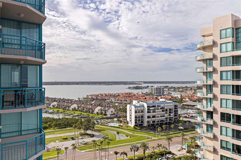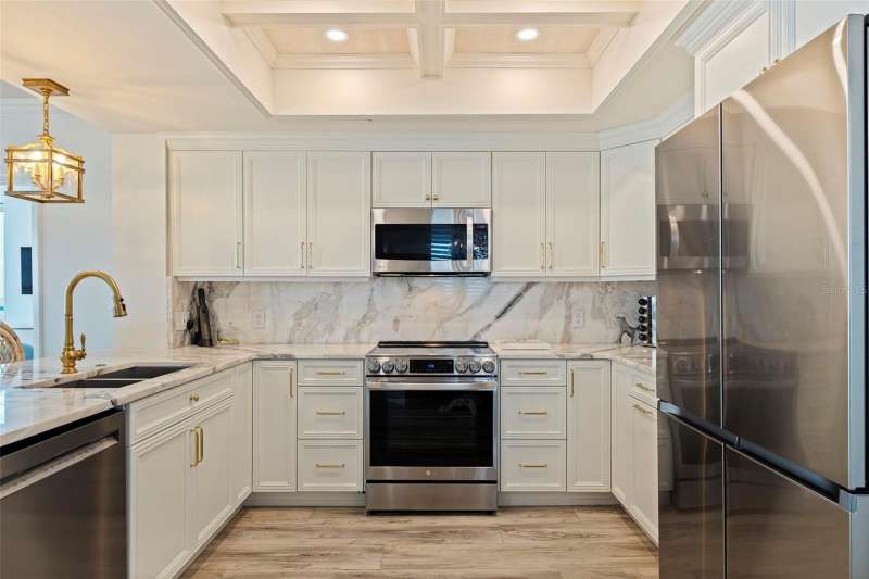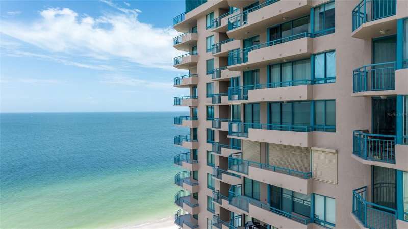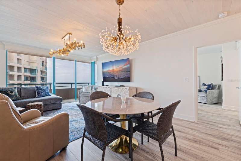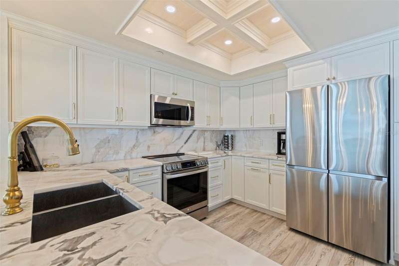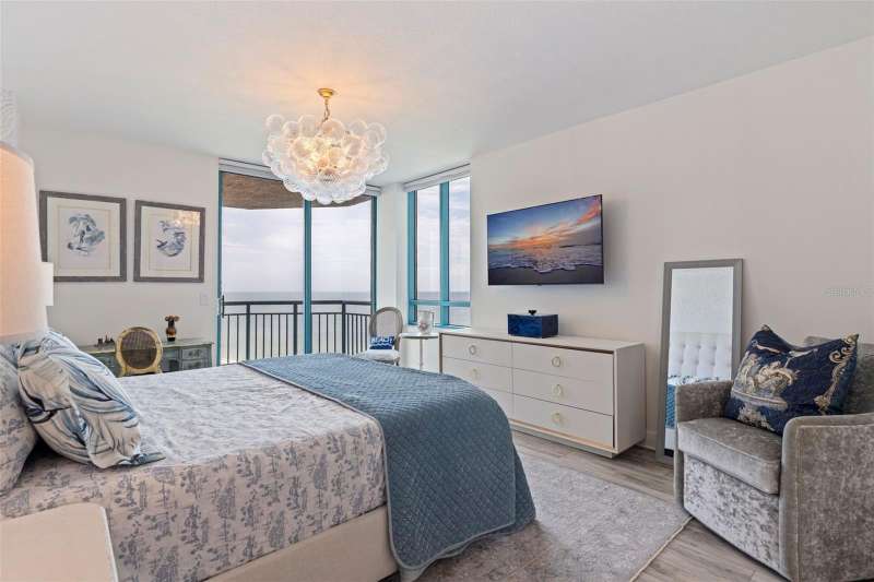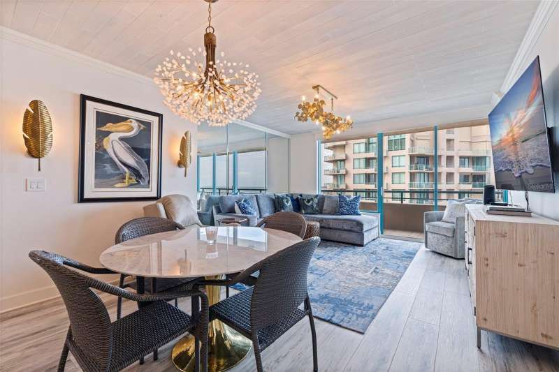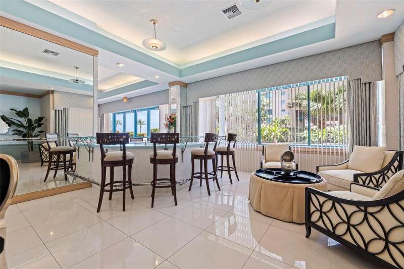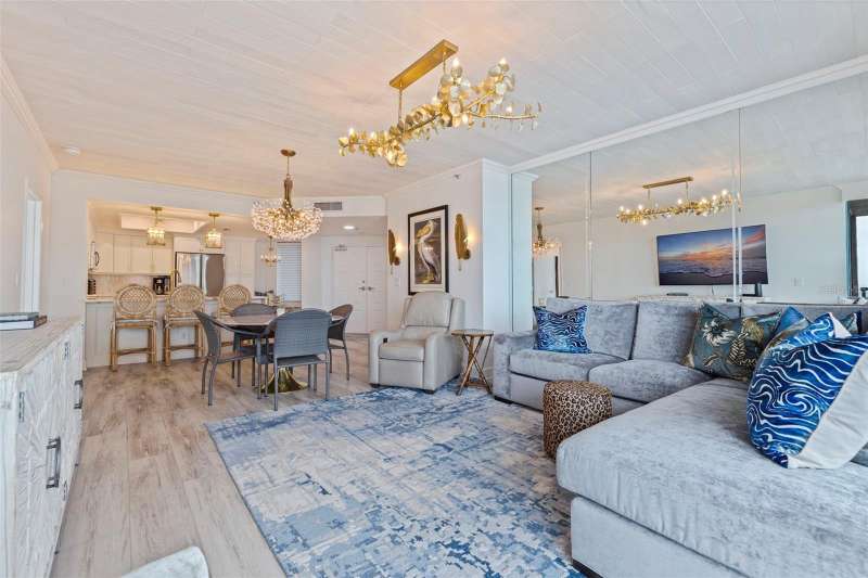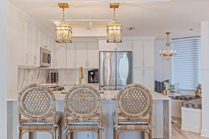 Under contract-accepting backup offers. ELEGANCE BY THE SEA! Step into this tastefully updated condo featuring upscale finishes & situated on the sugary sands of Sand Key Beach. Southwest exposture features views way down the beach with stunning sunsets everyday & Intracoastal views! Living Room & Primary Bedroom have sliders that open to a spacious balcony. Luxury Plank flooring throughout for easy maintenance. Living room has wood detail on the ceiling with crown molding. Kitchen featuries wood coffered ceiling. A gourmet's delight with stainless steel appliances, custom kitchen cabinery with Calacatta Namibia Dolomite countertops, slab backsplash & waterfall edge. Eat-in area with banquette seating & storage. Breakfast bar that opens to the living/dining room. Remote Sun Shades at all windows & doors with custom wood valances. Open floorplan with split bedrooms. Wake up in the Primary bedroom to the sounds of crashing waves & beautiful views of the Gulf. Wood wainscotting, large walk-in closet designed by California Closets & ensuite bath. Custom double vanity with dolomite countertops, & lighted vanity mirrors. Separate marble wet area with huge walk-in shower, bench & linen storage. Guest bedroom also features great views of the Gulf & lalrge walk-in closet. Guest bath has designer wallpaper with marble floors & marble walk-in shower. Designer lighting throughout featuring chandeliers by Visual Comfort, John Richard, Palacek and Currey & Company. A/C condensor, air handler & thermostat 2022. Coveted PRIVATE GARAGE #82 in parking garage. The Ultimar is a world class condo complex on Sand Key of famous Clearwater Beach. Miles of pure white sand. Lush tropical landscaped grounds are expertly maintained. 24 hr guard gated. True Resort Style complex has 3 geo thermal heated pools w/spas, 3 tennis courts, pickle ball, basketball ct, putting green, croquet lawn, grill area, firepit area, shuffleboard, corn hole, gym, steam & sauna, billiards rm, media rm, social rm with catering kitchen and baby grand piano. Walk to great restaurants & shops or catch the Beach Trolley right out in front of the building. A short drive to Tampa & the airport plus all of the sports venues of our championship teams. START LIVING THE FLORIDA BEACH LIFESTYLE TODAY!! Buyer to verify room dimensions. See Video. Call to make an appointment for your private viewing today!