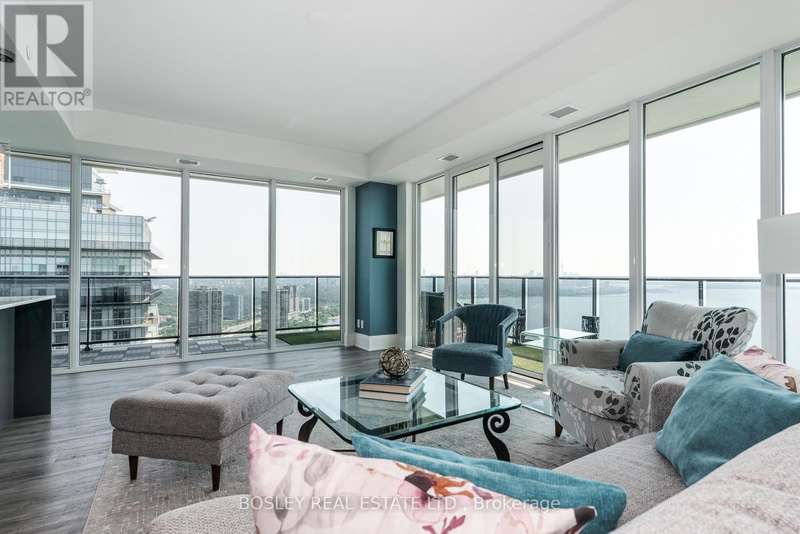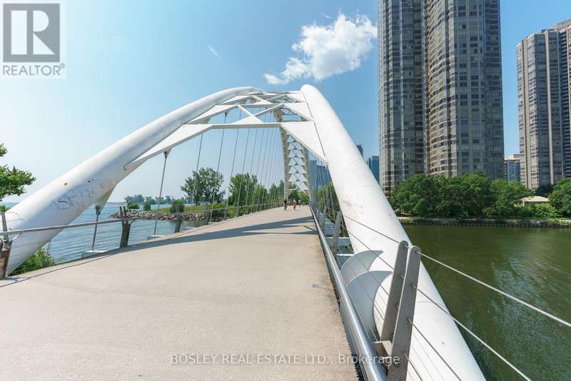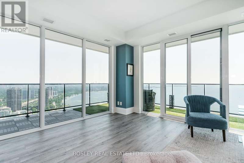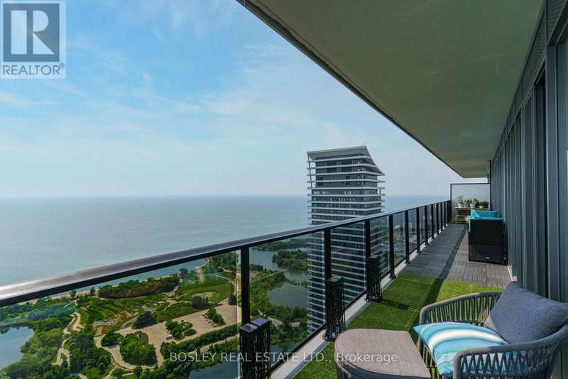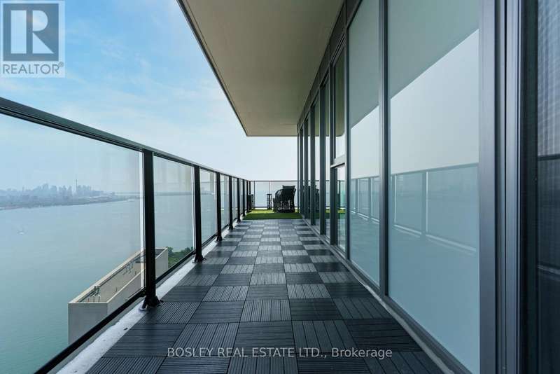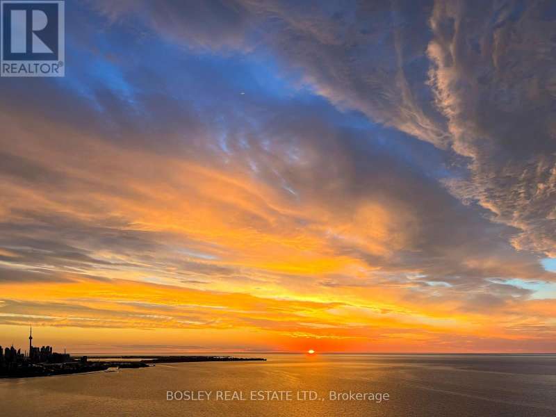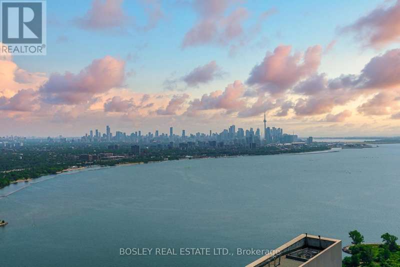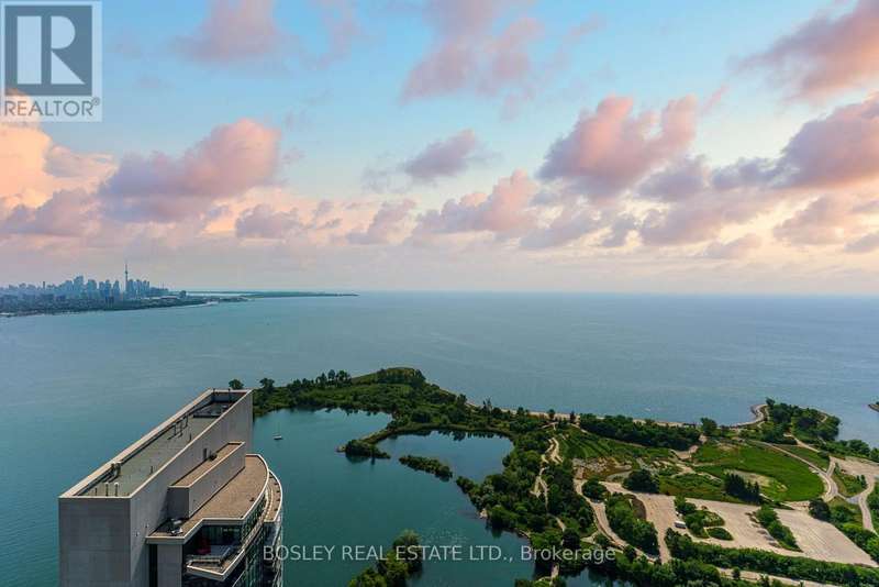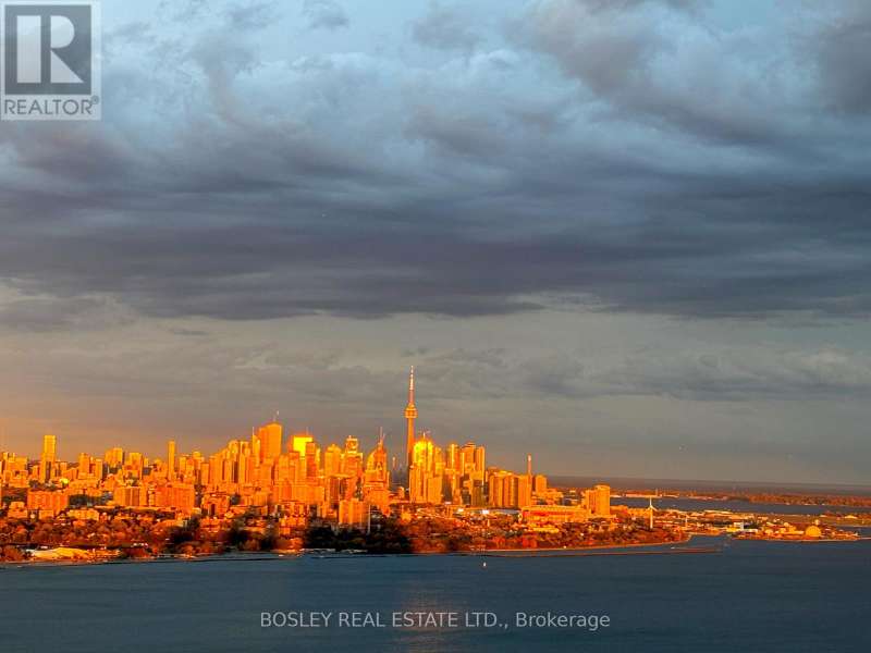 Humber Bay Shores is a coveted Toronto waterfront enclave where the tranquility of lakeside calm meets urban ease & upscale living. Steps to the Martin Goodman Trail and a vibrant dining & patio scene. Metro, Shoppers, LCBO & major banks are all walkable. With TTC at your door and a future GO station planned, access to downtown & beyond is seamless. Rising 56 storeys, Vitaon the Lake is a 3-year-old building offering refined amenities including 24/7 concierge, 5 high-speed elevators & on-site management. The 5th floor features a fully equipped fitness centre with cardio, weights, yoga studio, saunas, a stylish party room & private dining room with walkouts to the pool, sundeck & BBQ terrace. Two guest suites, ample visitor parking, underground car wash and pet wash stations provide daily convenience. THE VIEW!! You'll be swept away upon entering this expansive 1,544 sq ft south/east corner suite, where unobstructed & breathtaking views stretch over Lake Ontario, the Mimico Yacht Club, and the glittering Toronto skyline & iconic CN Tower. Floor-to-ceiling windows bathe the interiors in natural light, while a tiled wraparound corner balcony extending the full length of the suite on both ends, offers magnificent sunrise-to-sunset vistas. The foyer with recessed ceiling, double closets, guest powder room & walk-in pantry, opens to a chefs kitchen with quartz backsplash, custom 11-foot quartz island & premium Thermador & Liebherr appliances. The open-concept living, dining and den features 9-foot smooth ceilings, wide-plank luxury floors and custom 7-inch baseboards throughout. The split-bedroom layout includes two elegant 4-piece ensuites with quartz counters & porcelain tile. The primary bedroom offers dual walk-in closets & south-facing balcony access; second bedroom features a walk-in closet & east-facing balcony access. Laundry room with stacked appliances, chest freezer, sink, cabinetry & closet storage. Includes 1 locker & 2 side-by-side parking spots.