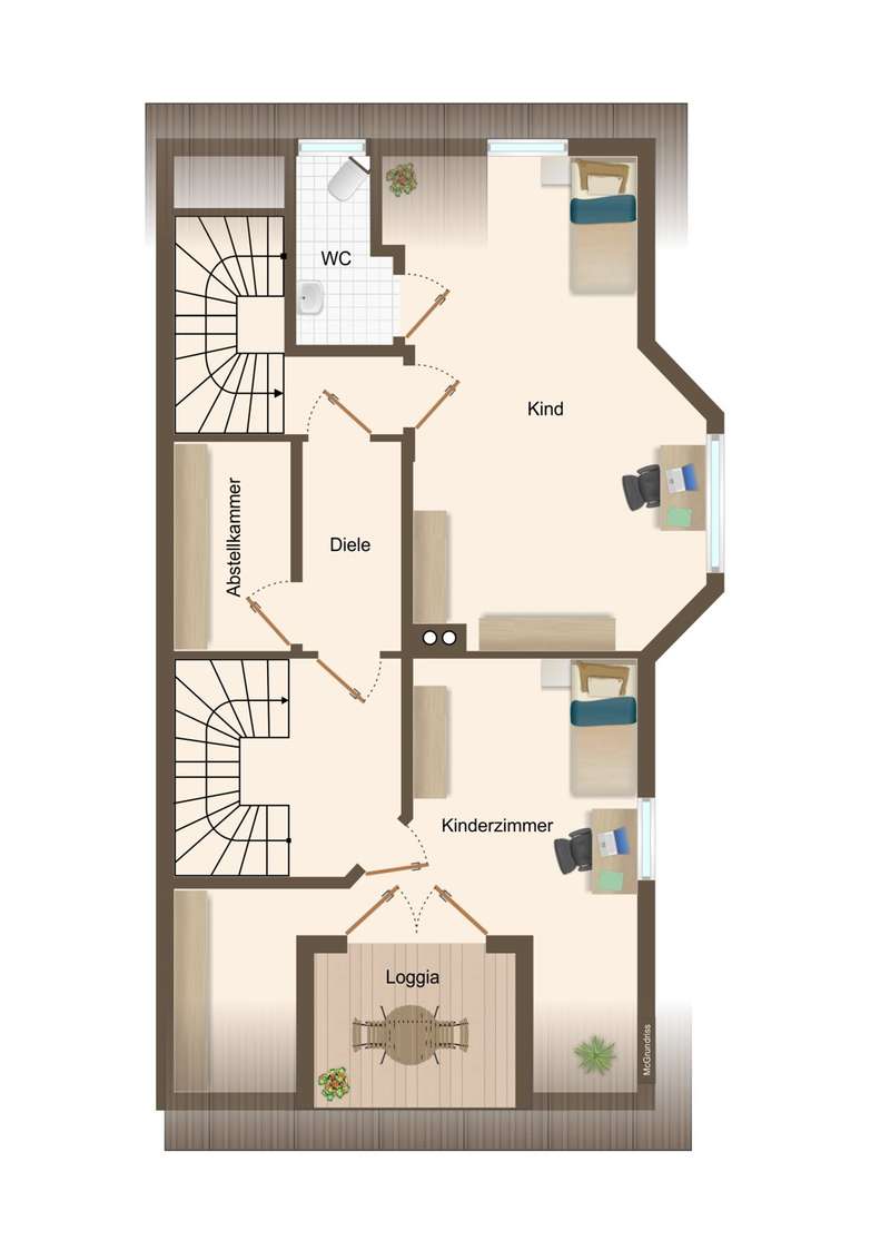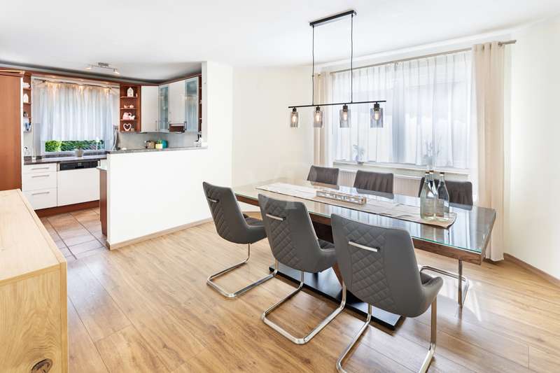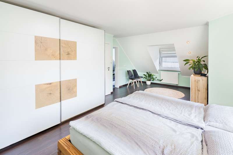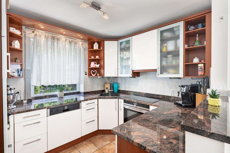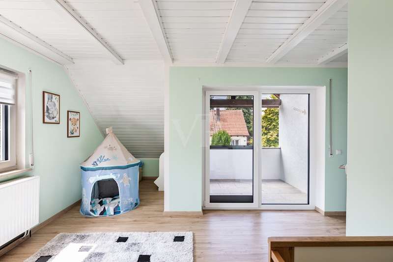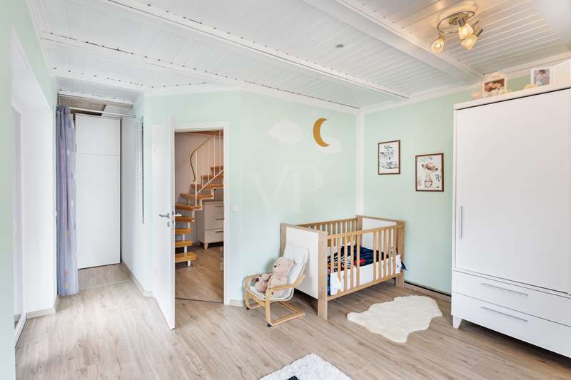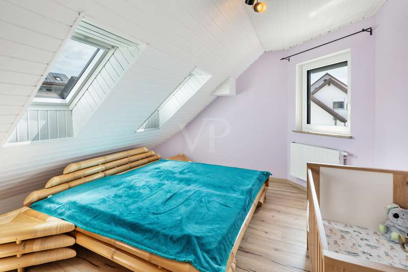 This charming end terraced house from 1989 impresses with a living space of approx. 161 m² on a plot of approx. 249 m². It combines spaciousness, comfort and flexible usage options - ideal for families or couples with space requirements. The total of 4.5 rooms are optimally divided: Three bedrooms and a smaller guest room provide retreats with privacy. Three modern bathrooms offer a high level of everyday comfort and are perfect for families or guests. A special highlight is the converted attic, which is ideal for use as an additional living, work or hobby area. On the first floor, a fireplace in the living area creates a cozy atmosphere, especially in the cooler months. The kitchen is modernly equipped and offers plenty of storage space as well as high-quality electrical appliances. An additional kitchen connection on the upper floor extends the possible uses. Two outdoor areas - a terrace and a covered loggia - invite you to linger and offer sunny retreats. The lovingly landscaped garden is easy to maintain and has a garden shed with a water connection - practical for hobby gardeners or additional storage space. Another plus point is the versatile hobby room in the basement, which is suitable for sports activities or as a workshop, for example. The garage with electric sectional door offers space for a vehicle. The house is located in a mature residential area with good public transport connections and short distances to shopping facilities, schools, nurseries and medical care. The energy certificate was not yet available when the offer was made and will be submitted at a later date. If you have any questions or suggestions, please do not hesitate to contact us!