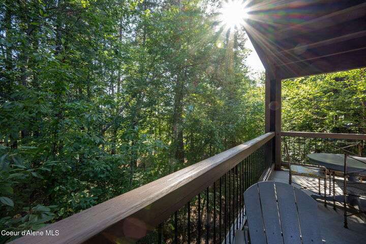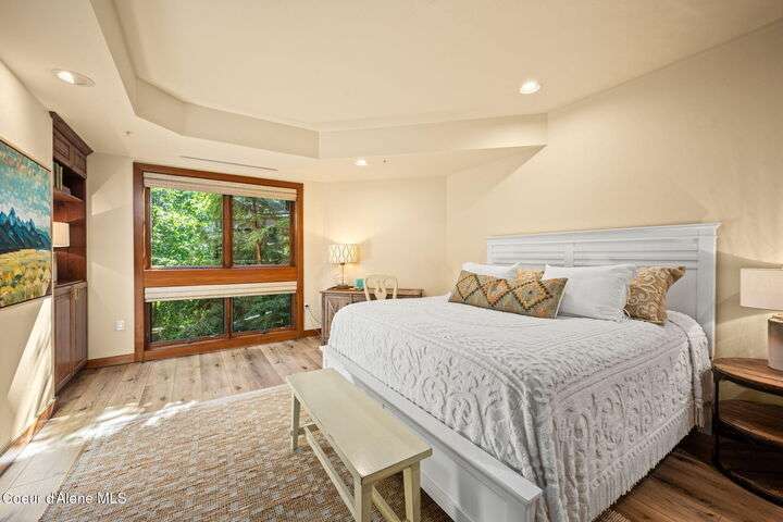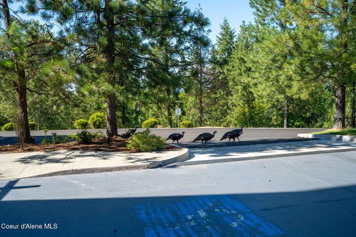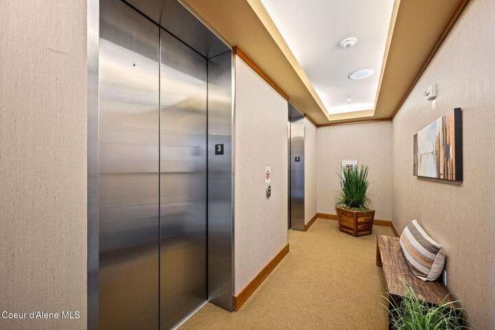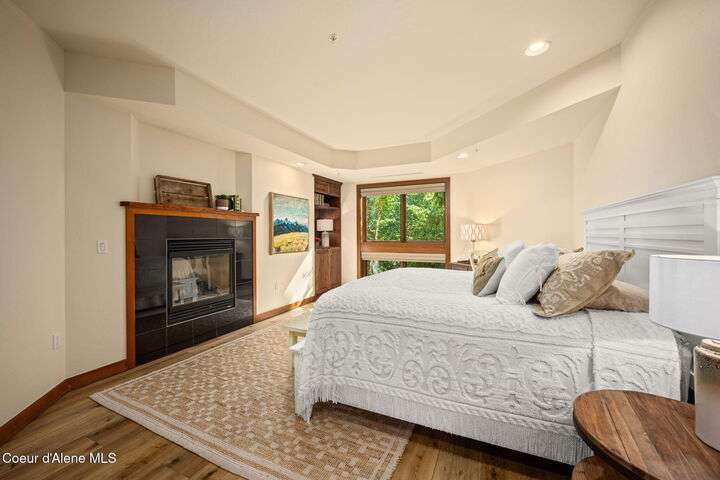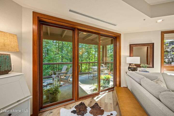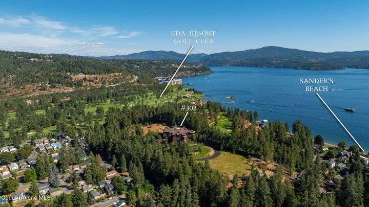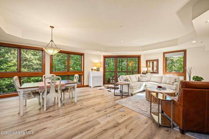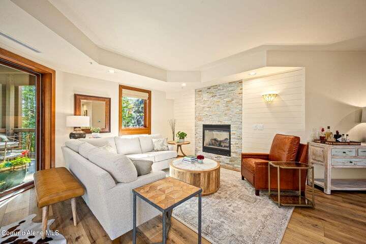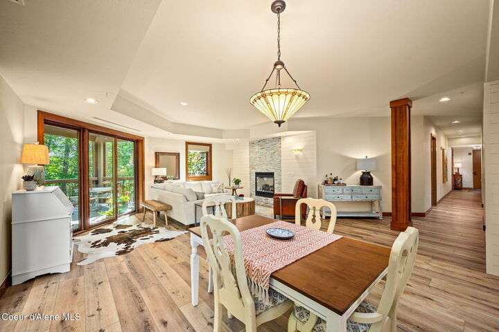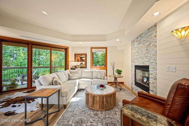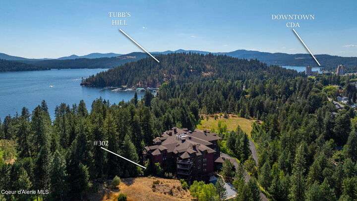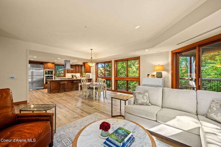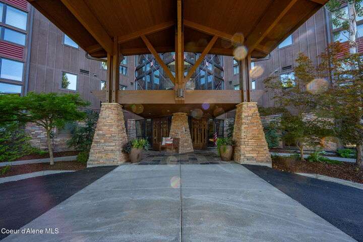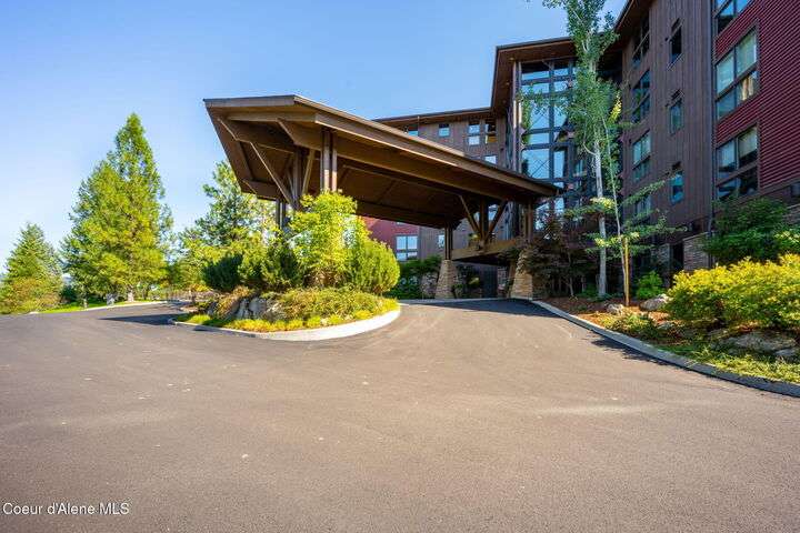Overlooking the Sanders Beach neighborhood and Coeur d'Alene Resort golf course on a lush 10-acre hilltop is RidgePointe, a modern lodge style 6-story condominium complex only one mile from downtown Coeur d'Alene. A secure and private gated entry opens to a charming, paved road through beautifully maintained grounds with strolling wild turkeys and deer, peaceful forest and sweeping territorial views. Enjoy single story living in this newly renovated 2128 SF, 3-bedroom, 2-bathroom condo featuring waterproof LVP flooring throughout, a gourmet kitchen with Electrolux appliances, Sub Zero refrigerator & freezer, wine fridge, spacious granite countertops and eating bar. The open concept living room with gas fireplace, dining area and sliding glass doors to a large, covered deck with barbecue hookup is an entertainer's dream. A gracious master suite features a gas fireplace, large walk-in closet, en-suite bathroom with granite countertops, soaking tub with forest views, roomy tile walk- in shower and luxury Toto bidet toilet. Ample closet space, wood wrapped windows, automatic window shades, laundry room with sink, tile counters, storage cabinets and brand-new Electrolux washer and dryer. Enjoy your own private 2-car garage inside of the central security door, a fitness center with his and her locker rooms, each with wet & dry sauna, community rec-room with billiard table and deck and a private walking trail through the tranquil forest to Sanders Beach. RidgePointe offers the best of both worlds: convenient access to shopping, restaurants, and I-90 in a peaceful setting only one mile from downtown activities.