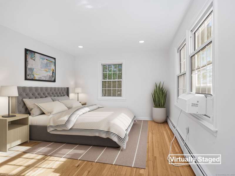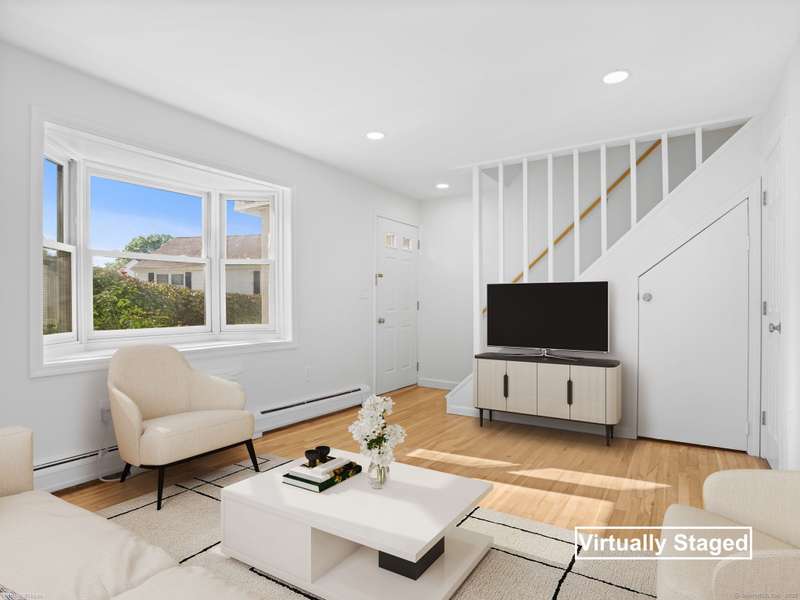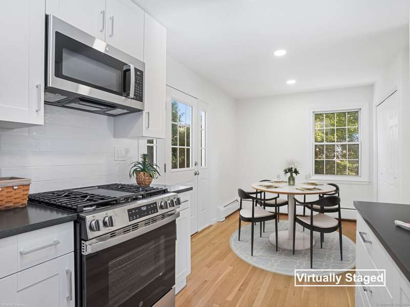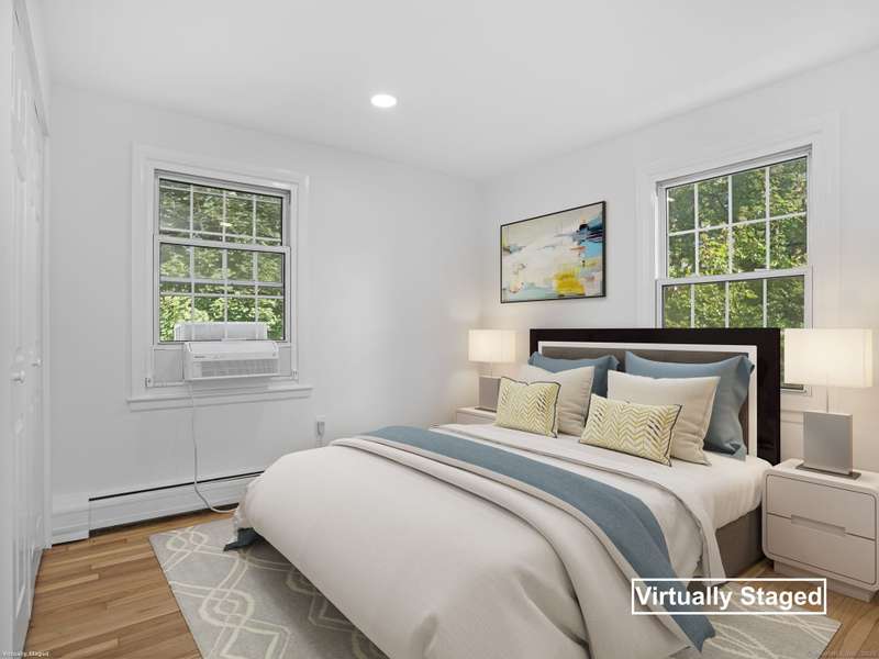 Beautifully renovated with refinished hardwood floors and recessed lighting throughout, this sun-filled end-unit townhouse blends comfort with a fresh, modern feel. The main level showcases a stunning brand-new kitchen with crisp white cabinetry, stainless steel appliances, granite countertops, and a subway tile backsplash. The adjoining breakfast nook opens to a private deck and backyard, creating an ideal spot for both everyday living and entertaining. A chic powder room with penny tile flooring, a laundry closet with washer/dryer, and two convenient storage closets add thoughtful functionality. Upstairs, two spacious bedrooms share an elegantly redesigned full bath with penny tile flooring and a striking walk-in shower framed by sliding glass doors. A hallway linen closet adds extra storage, while brand-new air conditioners ensure comfort year-round. The home also includes one assigned parking space (#58), additional guest parking, and a storage area in the neighboring building's basement. Rent covers heat, hot water, sewer, trash pickup, and grounds maintenance. Ideally located near shopping, schools, parks, the train station, and major commuting routes, this home offers the perfect blend of privacy, style, and convenience.