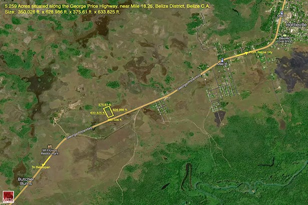 This 5.259 acre property is located at Mile 18 1/4 on the George Price Highway, Belize District. The property can be accessed via the highway down a dirt road and due to its size offers potential owners the flexibility of using the property for cultivation, commercial or residential purposes.The property measures 350.026 ft. x 628.986 ft. x 375.61 ft. x 633.825 ft. and offers 350 ft of street frontage along a dirt road. It’s approximately 382 ft (127yards) off the Highway which allows for privacy and quiet. The property is approximately 2 miles from Hattieville Village and 15 miles from Belize City.The George Price Highway is well-traveled daily experiencing continuous traffic heading West to Belmopan and East to Belize City. Being just outside Hattieville Village limits, property offers the possibility for commercial or residential use.Contact us for more information.