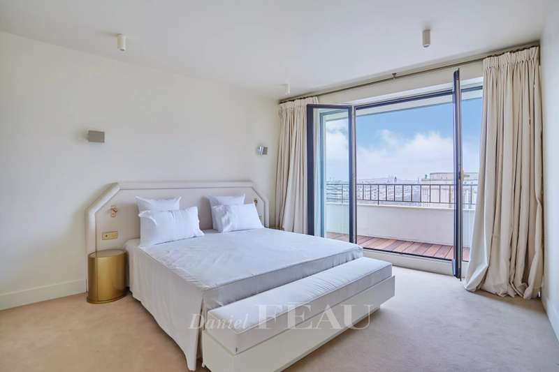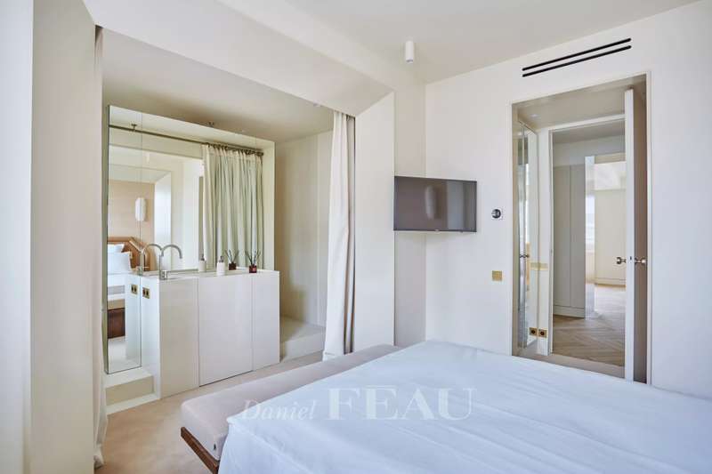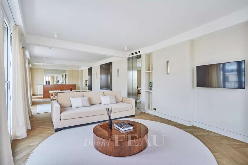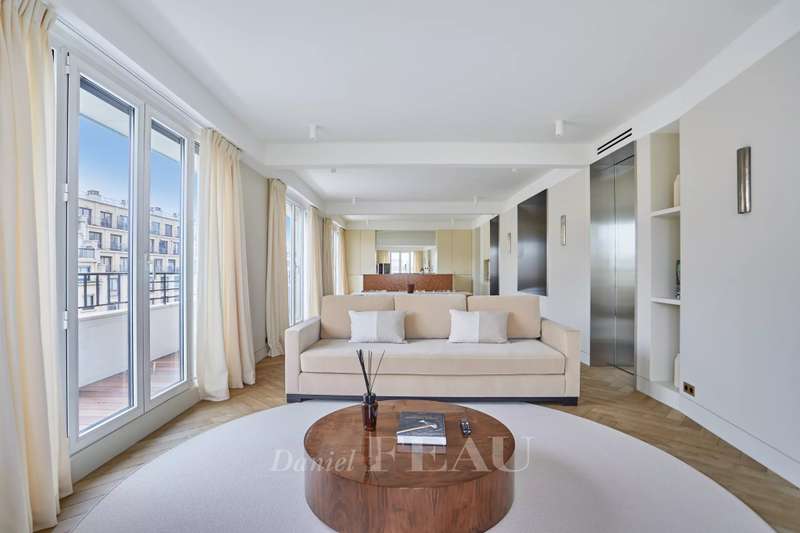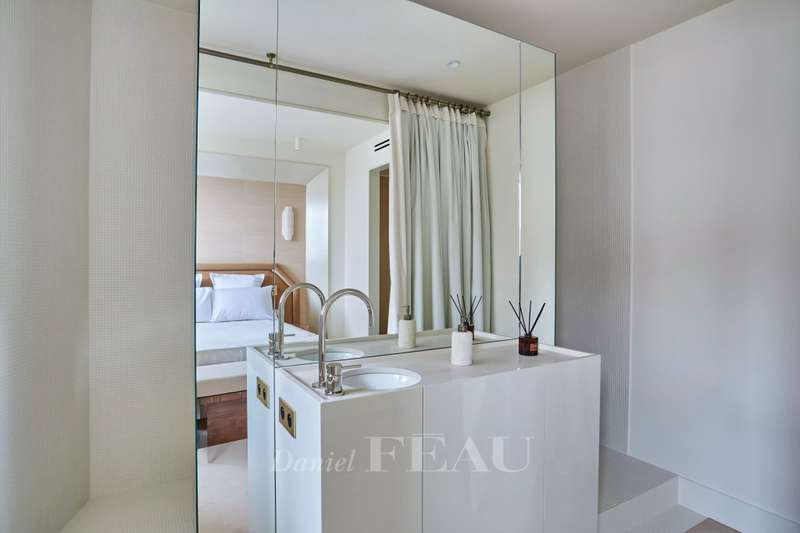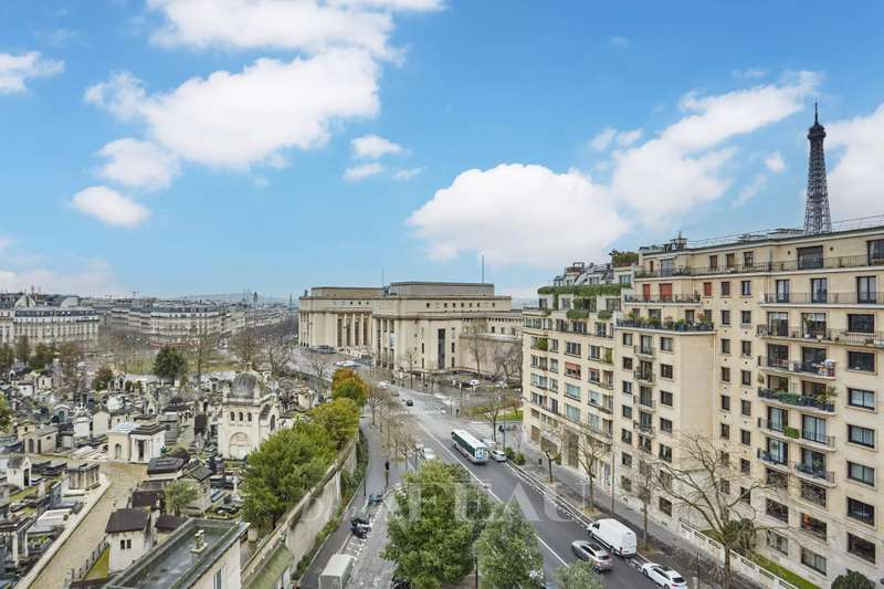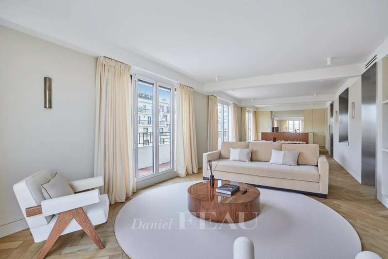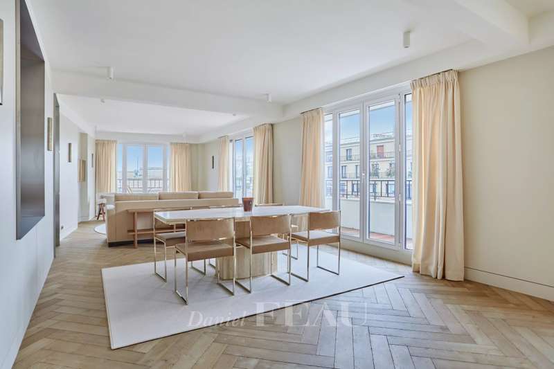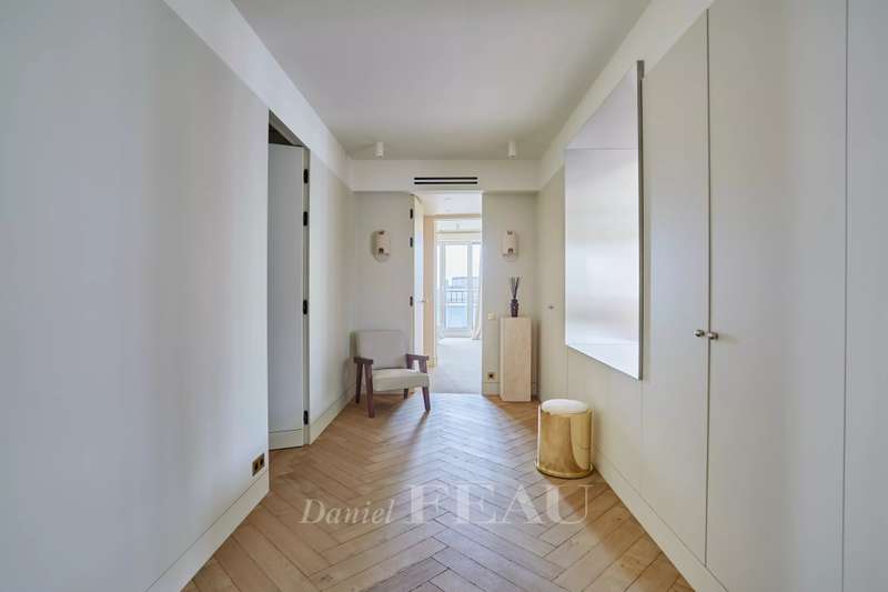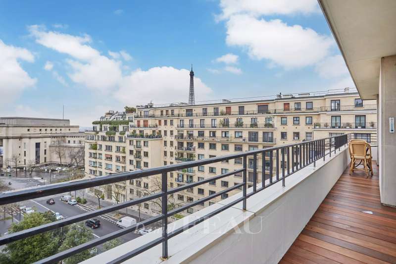 This exceptional 123 sqm apartment is on the 7th floor of a relatively recent building located a stone’s throw from Place du Trocadéro. Commanding open views, it includes a spacious living/reception room/kitchen/diing room opening onto a continuous balcony, two suites with shower rooms and dressing rooms, and a guest wc. Air-conditioning. Sold fully furnished. With a cellar and a parking space.