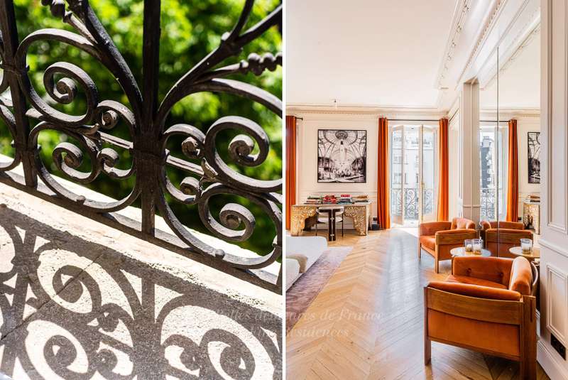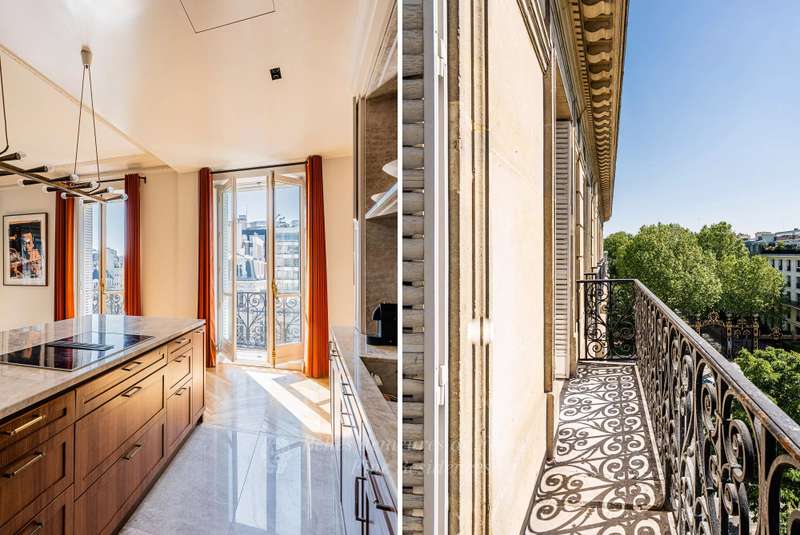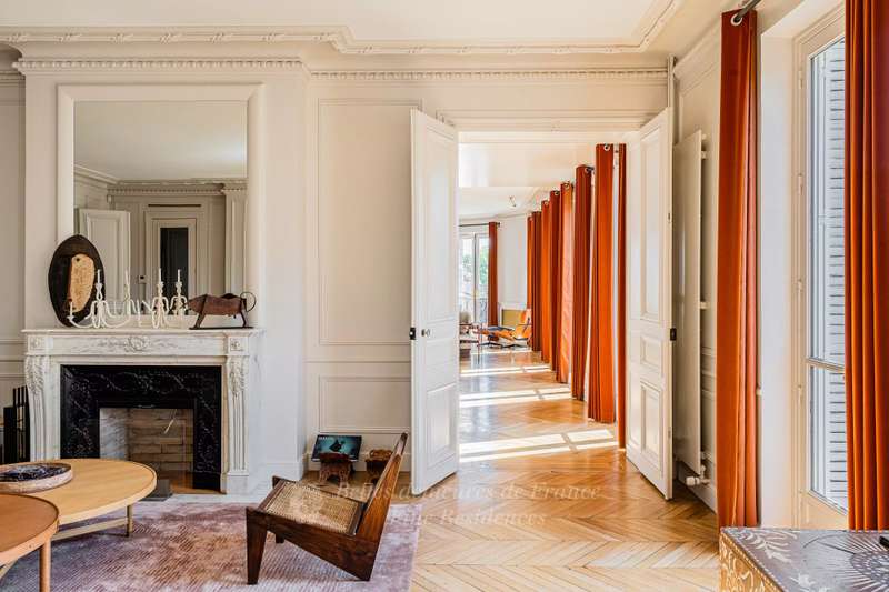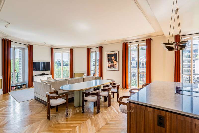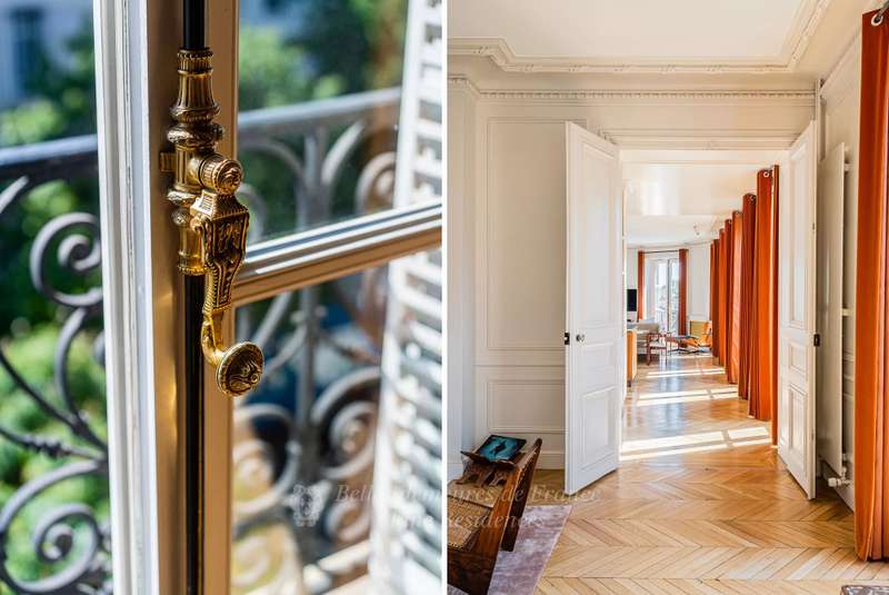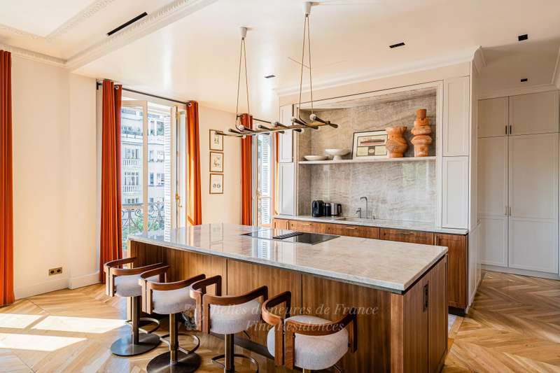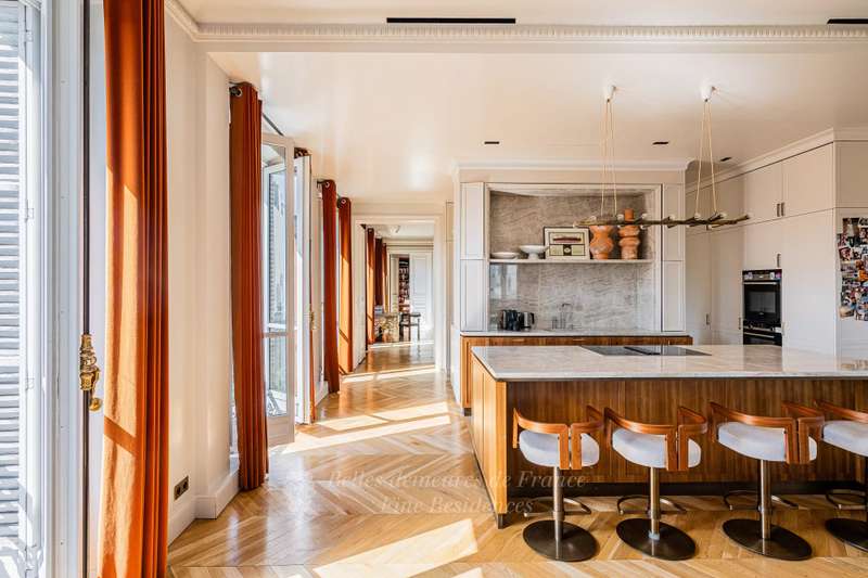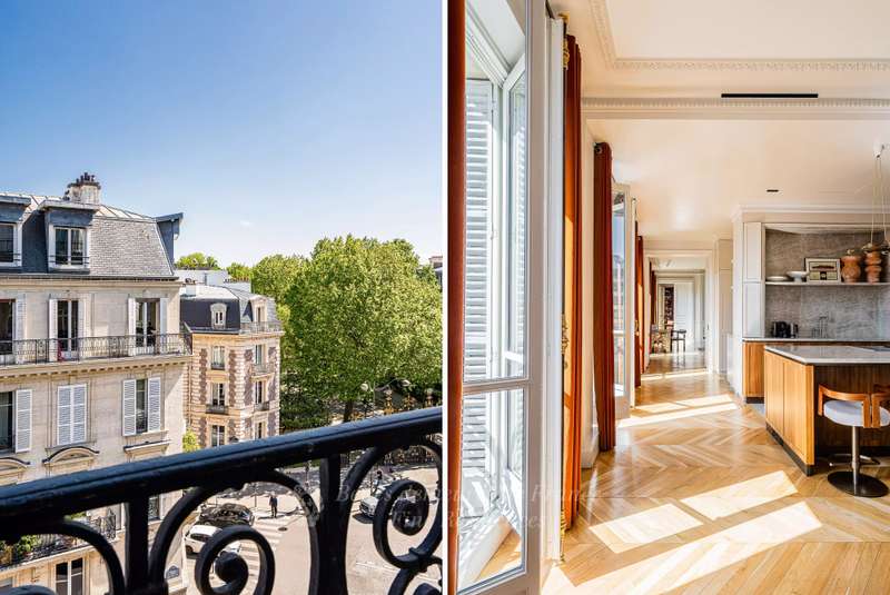 Leafy Parc Monceau. This near 400 sqm apartment on the 4th floor of a fine early 20th century freestone building has been renovated throughout in a tasteful contemporary style, and is in mint condition. Enjoying views of the park’s iconic railings and avenue Hoche, it includes an entrance hall, a living/reception room, a magnificent 72 sqm kitchen/dining room with a fireplace, a spacious master suite with a bathroom and a dressing room, four further bedrooms with bathrooms, a recreation room and a study.