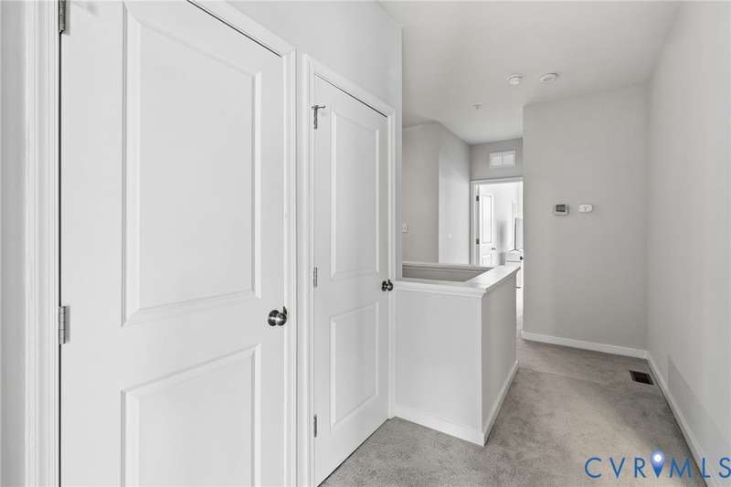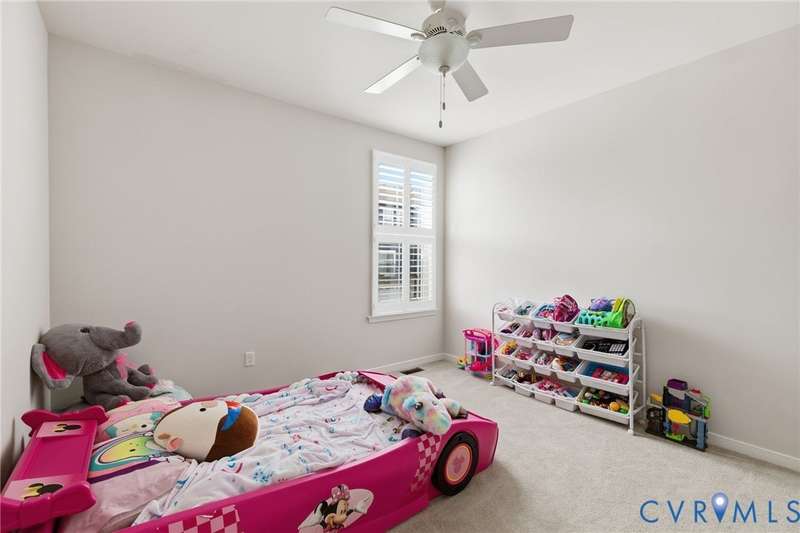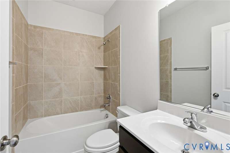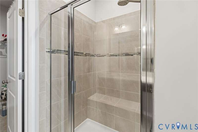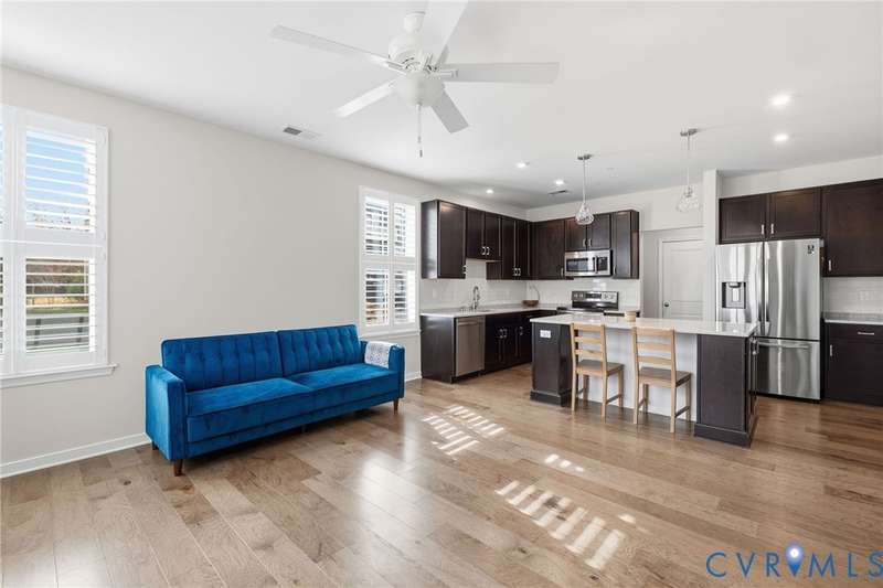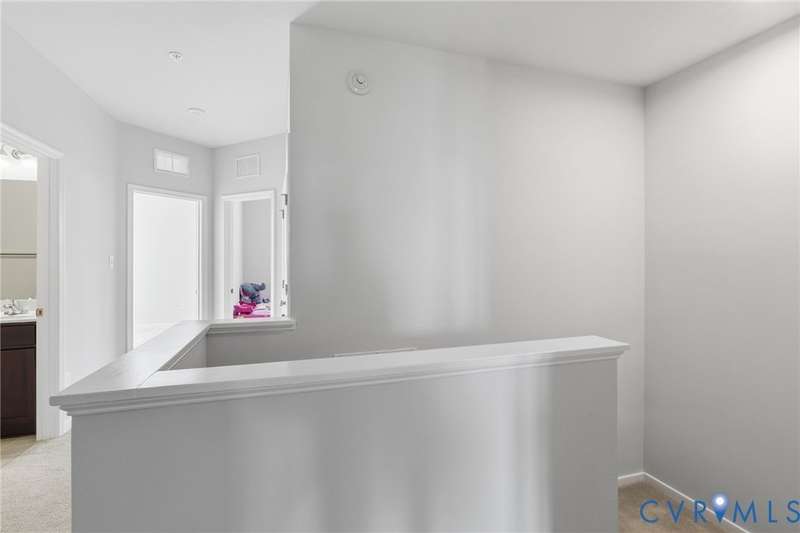 Welcome to this beautifully maintained 3 bedroom ground level end unit in the highly sought-after Cosby High School district, offering extra sunlight throughout thanks to additional windows and timeless plantation shutters on every window. Enter from the covered front stoop into an open great room with engineered hardwood floors, recessed lighting & a ceiling fan. The space flows into a stunning kitchen with quartz countertops, a center island, 42""Â? cabinetry, stainless steel appliances, tile backsplash, pendant lighting & recessed lighting. A convenient half bath and access to the rear-entry garage-where the hot water tank, electrical panel & cable box are located-complete the first level. Upstairs, the spacious primary suite includes two walk-in closets and an ensuite with a tiled walk-in shower, glass door, double quartz vanity & tile floors. Bedroom two features its own walk-in closet, while bedroom three includes a double-door closet and access to the rear balcony with Trex-style decking, outdoor lighting & GFCI outlet. A full hall bath with tile flooring and tub/shower, a linen closet, a laundry closet with stacked washer/dryer & a utility closet housing the American Standard heat pump and Aprilaire damper finish the level. With 3 bedrooms, 2.5 baths, 1,510 sq ft, ground-level entry, generous storage & a prime end-unit location, this home blends comfort, efficiency & modern style in the heart of Chesterfield.