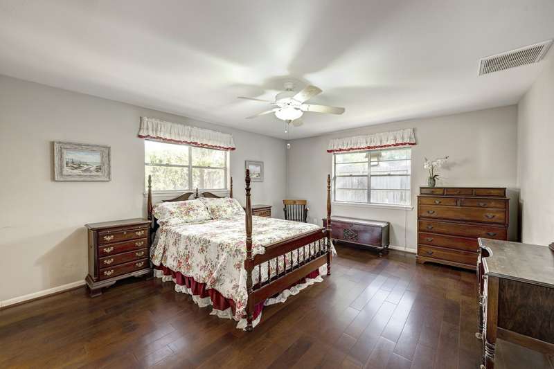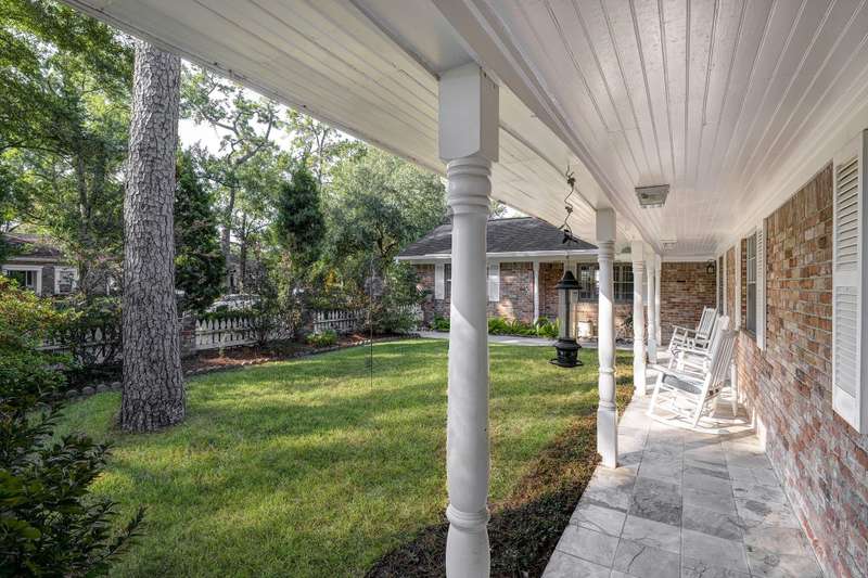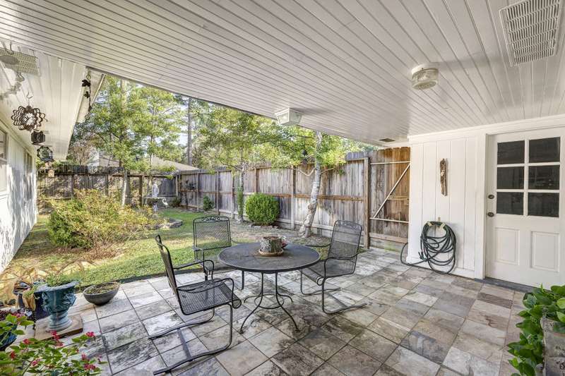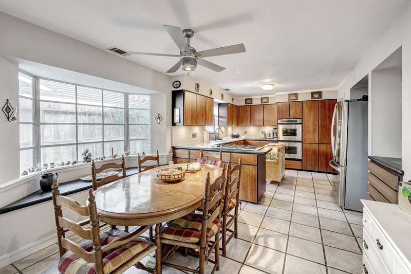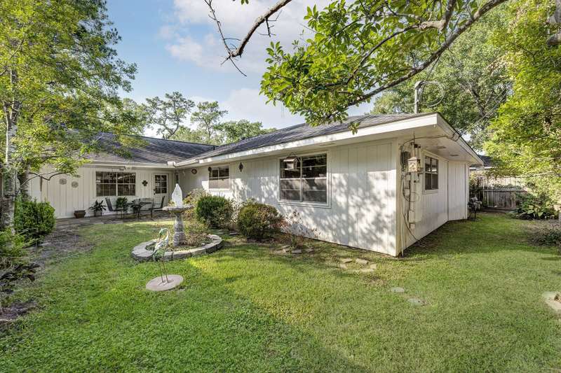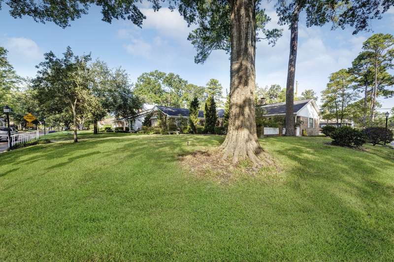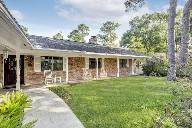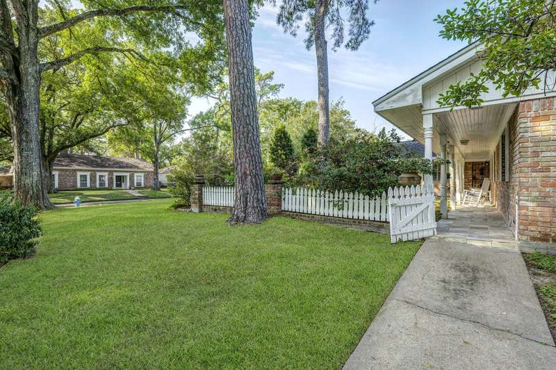 Such an inviting & charming home sitting up high on a beautiful, elevated corner lot w/wide covered porch to sit & relax under a cozy canopy of trees! Sidewalks lead to front & side of front porch. Enter home into large family rm w/high cathedral, beamed ceiling, tall brick fireplace w/gas logs, wall of blt-ins, & 3 large windows w/views of front & back yards! Formal living has surrounding windows viewing front yd & dining room opens to breakfast & kitchen w/slate counters, subway tiles, under counter lighting, & handsome smooth front, stained cabinets w/great pull-out drawers, gas cooktop, & SS dbl convection ovens. Primary is spacious w/sitting area. Engineered wood & tile flrs, 4 fans, shutters, AC/Heat ‘19, hardi-plank most of back. Rear covered slate patio, & garage w/blt-ins! Large side yard. Beautiful Park in woods at end of street! Bayou Trails near exit to BGP. Close to Beltway 8, Memorial, Medical & City Centre! All info per Seller