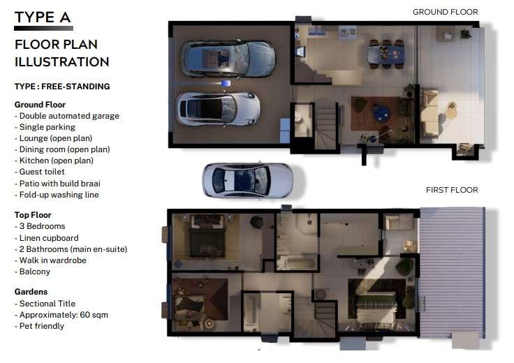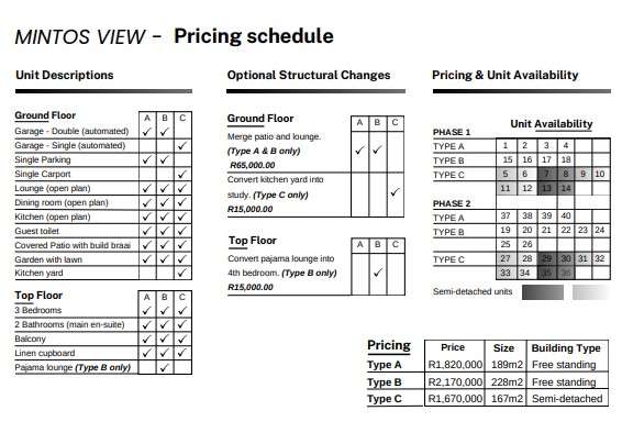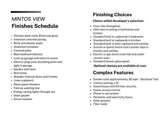 Welcome to Mintos View, a new development in Cashan. Type A The Property has 3 Bedrooms, 2 Bathrooms. Main Bedroom has an En-Suite Bathroom and walk-in Wardrope and Linen Cupboard. Enjoy your coffee on the balcony with stunning views There is a Open plan Lounge, Kitchen and Dining area. Guest Toilet downstairs. The house is fitted with Energy-saving lights and solar geysers The property has a Double Garage and single open parking. On the outside there is a covered Patio with Built-in Braai. You also have your own Pet-friendly private garden with a fold-up washing line. The property has Fibre connectivity. Optional upgrades are available! Security is top notch with a 24/7 security access control. Phone-in/out system for visitors Don’t miss out; buy your home today in Mintos View. Call us today for this prime property