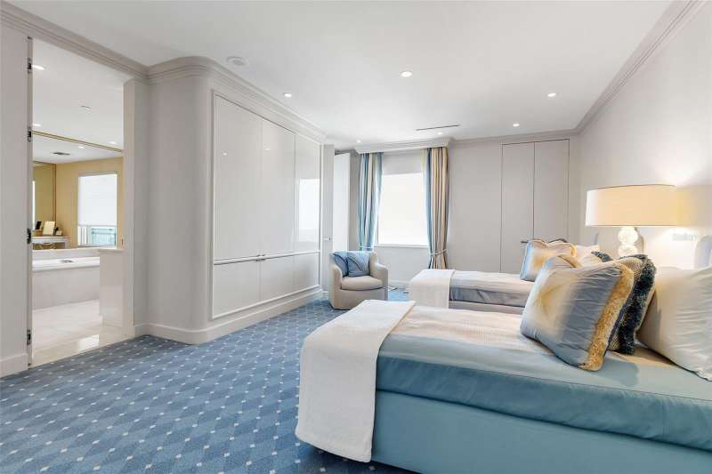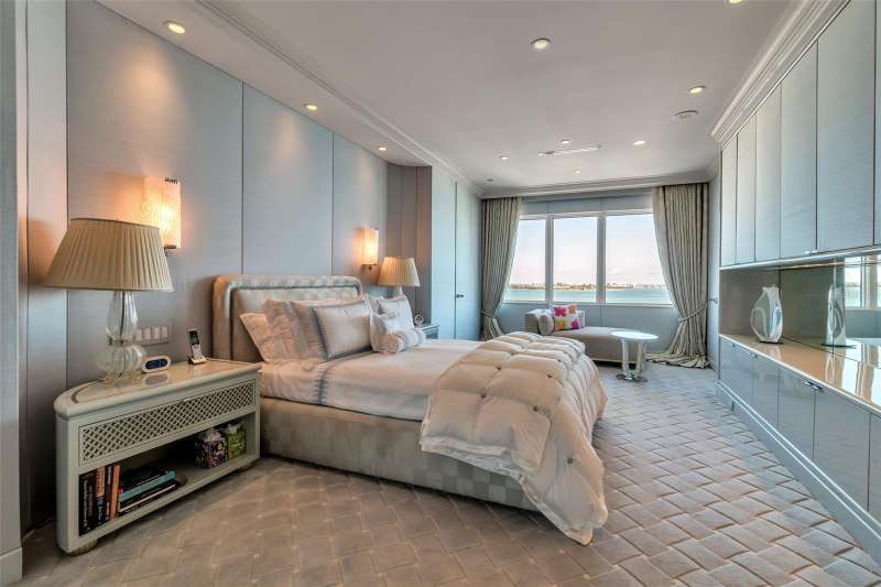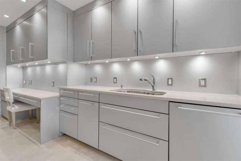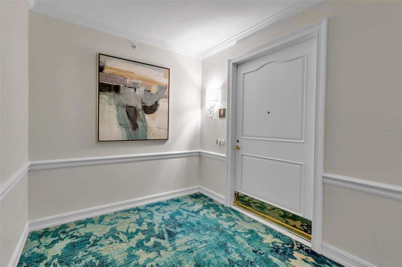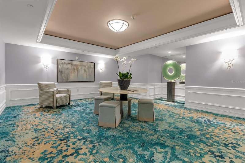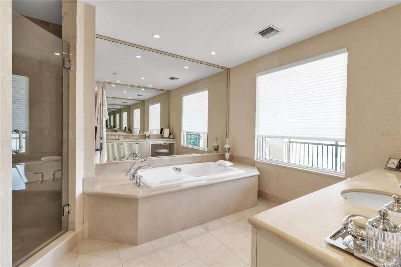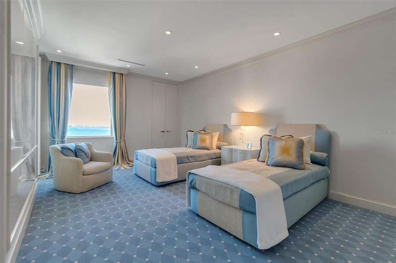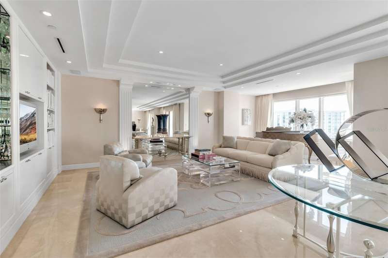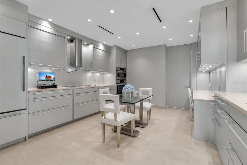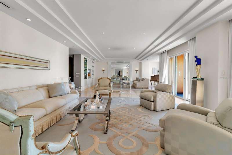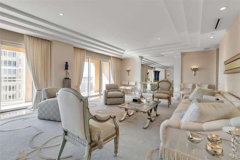 Perched high above exquisite Sarasota Bay, Ritz-Carlton Residences #1202 harmonizes a breathtaking display of scale, privacy, dramatic views, and exceptional design. Internationally renowned interior designer Geoffrey Bradfield paid the utmost attention to every detail as he masterfully crafted this sanctuary. The glamor unfolds gracefully as you enter the condo’s serene foyer featuring a beautifully architected gold-leafed ceiling, upholstered silk walls, and a custom lighting plan. Situated just off the foyer is a custom walk-in closet and a powder room finished with ultra-suede walls and modern stainless steel and glass pedestal sink. Crema Marfil marble flooring which runs throughout the condo’s public spaces leads you into a Grand Salon with a stunning tiered ceiling, gracious windows overlooking Marina Jack and the Ringling Causeway, fabulous lacquered cabinetry, and architectural moldings and accent columns. The large eat-in kitchen features sleek Poggenpohl cabinetry providing more than ample storage for any host or chef as well as a built-in desk area. The appliance package is top notch: Sub-Zero refrigerator/freezer, Gaggenau cooktop with a stainless steel and glass hood, Bosch double wall ovens, and a Miele dishwasher. The kitchen's custom lighting plan accents the textured walls and marble flooring. Both bedrooms offer marvelous custom appointments. The master suite features elegant lacquered custom cabinetry, silk upholstered walls, and lacquered moldings. The master bath’s ceiling is gold-leafed, the walls are marbled, and it is fitted with an oversized Kohler Jacuzzi tub, a glass-surround shower, and Venetian glass mirrors and vanities. The spacious walk-in closet also features custom millwork with lacquered columns and a Crema Marfil marble floor. The guest suite is similarly appointed with custom lacquered cabinetry, a large walk-in closet and a full bath with a large vanity. Throughout the condo, you will find opulent hardware and doors fitted with invisible sash hinges, linear air conditioning diffusers, and motorized window shades, as well as a spacious laundry room. The residence offers two large balconies perfect for viewing Sarasota’s radiant sunsets. While living at the Ritz Carlton Residences you will enjoy a resort-style pool with a panoramic sun deck and private dock for convenient drop-off and pick-up. Additional resident amenities include secured climate controlled storage, a private residential entry separate from the hotel, and an elegantly appointed private club room. Hotel living offers access to in-room dining, 24-hour concierge, car valet service, a newly completed spa (2024), and access to popular dining venues Jack Dusty and Rufa. Gracefully positioned along Sarasota’s scenic bayfront, ownership at 1111 Ritz-Carlton Drive #1202 presents an extraordinary opportunity for a life full of refinement and sophistication in a city featuring world-class beaches, stylish boutique shopping, acclaimed dining, and a vibrant cultural scene.