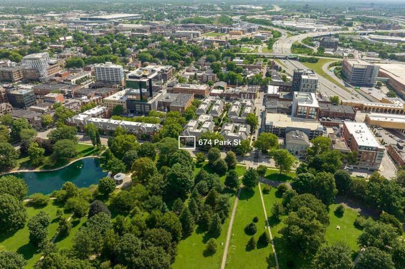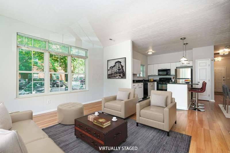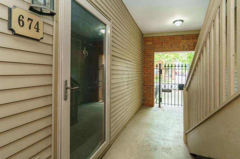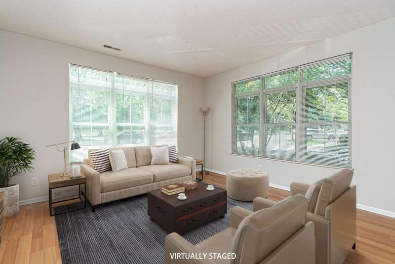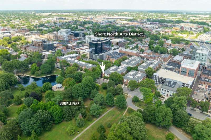 Welcome to this stylish, updated corner unit overlooking iconic Goodale Park - all on the ground floor with no stairs for easy living. Inside, enjoy 9' ceilings, new insulated Pella windows, a new HVAC system (2022), and durable LVP flooring throughout. The open-concept kitchen includes a large island with breakfast bar, granite counters, tile flooring, and a mix of stainless and black appliances. Both bathrooms have been refreshed with new tile, modern vanities, and updated tub/shower surrounds. The unit offers two spacious bedrooms, including a private owner's suite, plus in-unit laundry (washer/dryer stay), generous storage, and two dedicated parking spaces. Community perks include 24/7 on-site fitness and unbeatable walkability. Just steps to the energy of Short North's High Street --home to top-tier restaurants, coffee shops, boutiques, rooftops, happy hours, and nightlife - and right across from 33 acres of Goodale Park, with walking paths, pickleball and tennis courts, a gazebo, ball courts, a pond with a fountain, and a free Sunday summer concert series. Pet-friendly, park-side living with modern comforts and urban access - this is the lifestyle you've been waiting for.