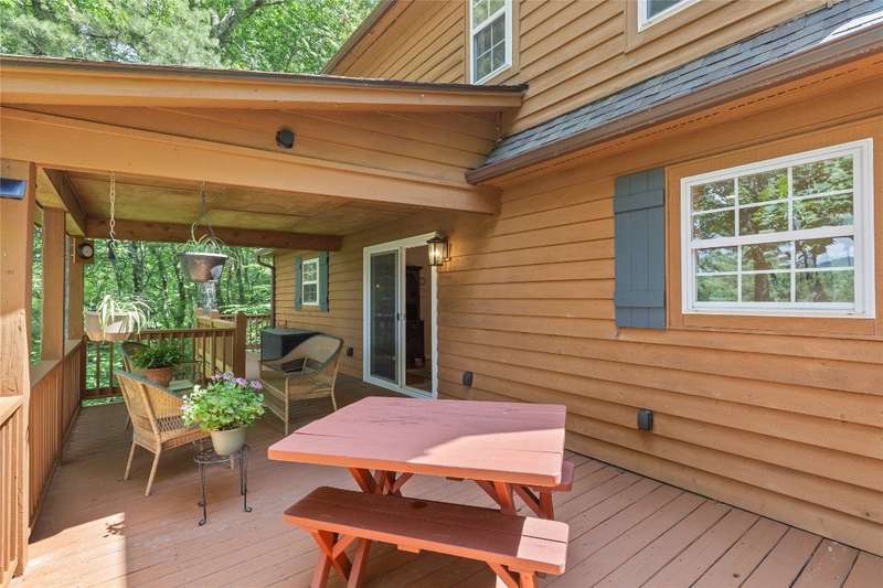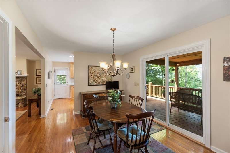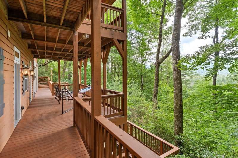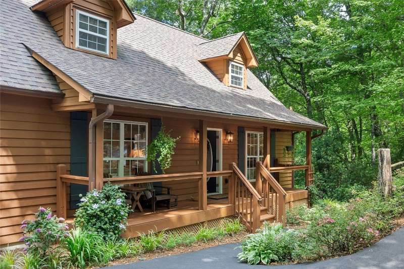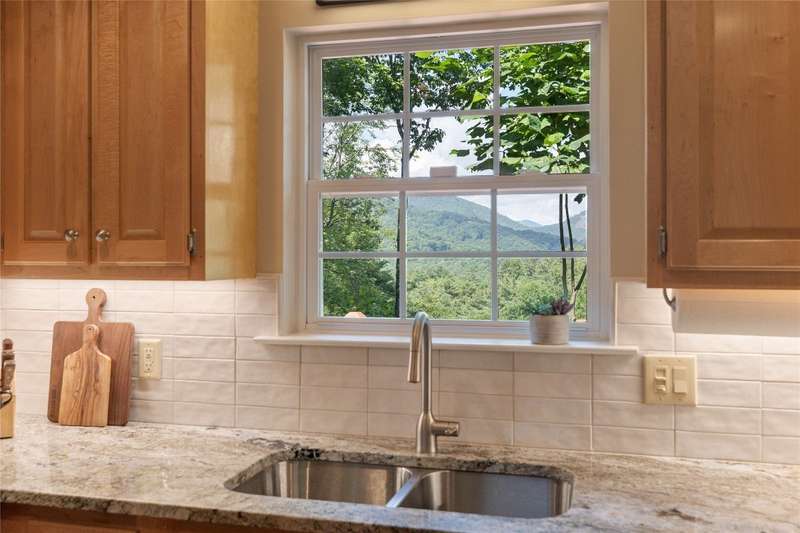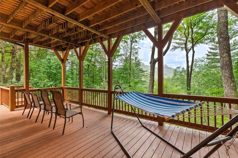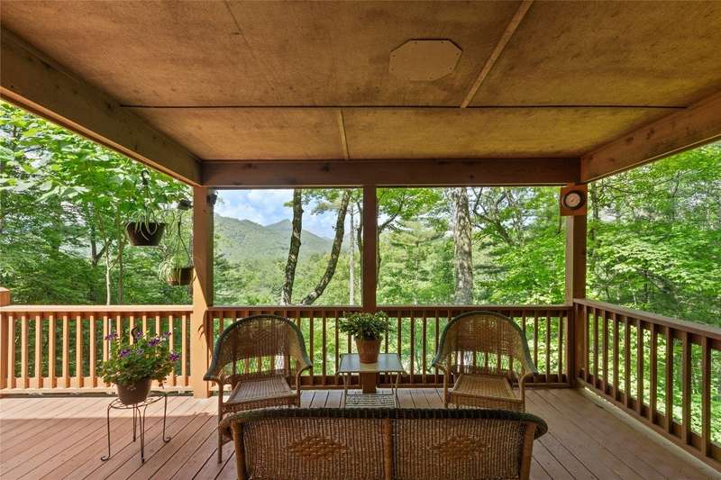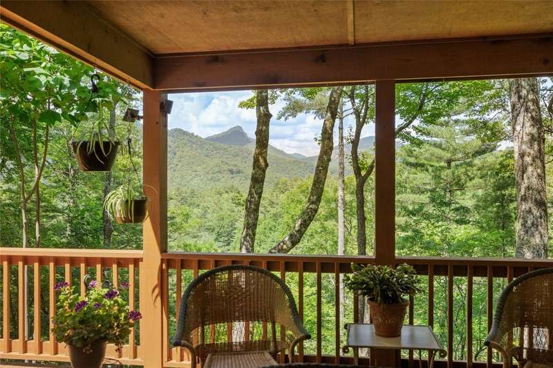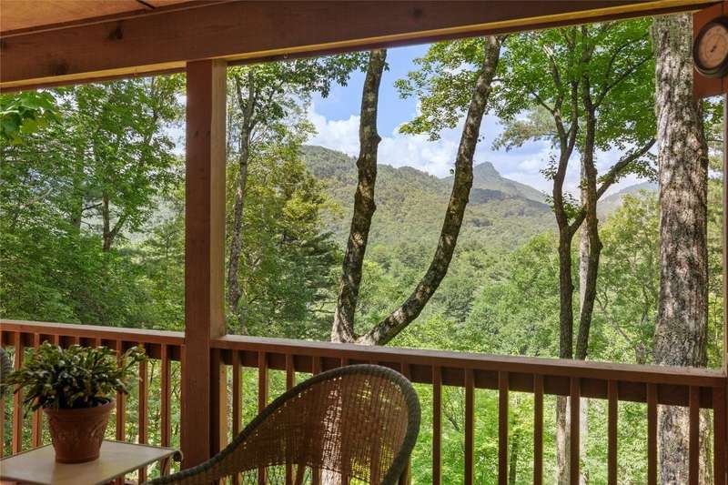 Perfectly positioned in the heart of the Highlands Cashiers Plateau, this inviting mountain retreat offers timeless charm and sweeping year-round views of both Chimney Top and Rock Mountains. Set on 1.09 acres with a canopy of mature hardwoods, the property combines natural beauty with exceptional privacy. Inside, the home welcomes you with a warm and spacious living area anchored by a striking stacked stone fireplace, ideal for cozy mountain evenings. The main level features a well-appointed primary suite designed for convenience and comfort. A beautifully refreshed kitchen flows into the dining area, where large windows frame the mountain landscape. A thoughtfully placed powder room completes the main floor. Upstairs, two guest suites each offer private baths and tasteful updates, creating a peaceful space for family or visitors. The walk-out lower level extends the living space with an oversized family room, its own fireplace and kitchenette, a dedicated home office, laundry area, and a half bath. A spacious workshop rounds out the level, offering ample room for hobbies or storage. Two levels of outdoor decks provide the perfect vantage points to take in the breathtaking mountain vistas and surrounding forest canopy, ideal for morning coffee, afternoon gatherings, or quiet evenings under the stars. Throughout the home, solid oak floors and premium porcelain tile underscore the quality craftsmanship and attention to detail. Immaculately maintained and carefully styled, this home reflects pride of ownership at every turn. The rear of the property directly adjoins Sapphire National Golf Club.