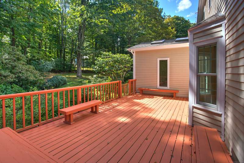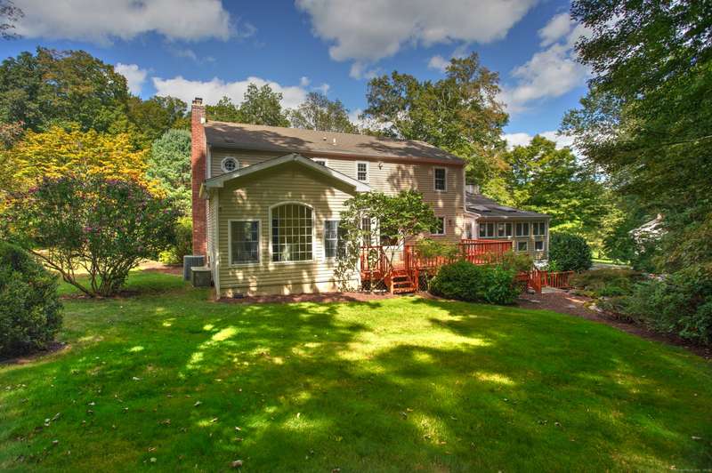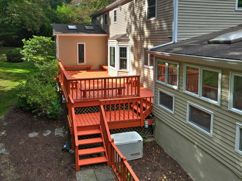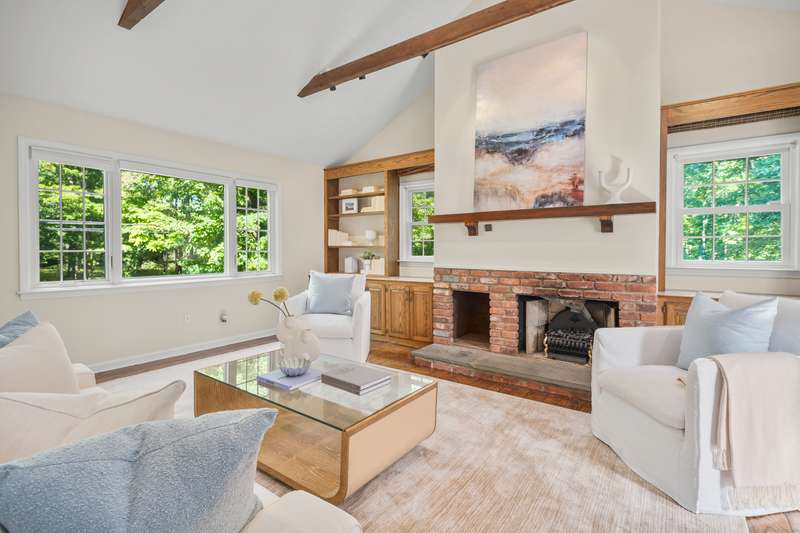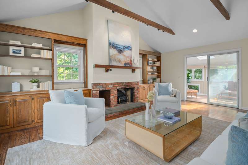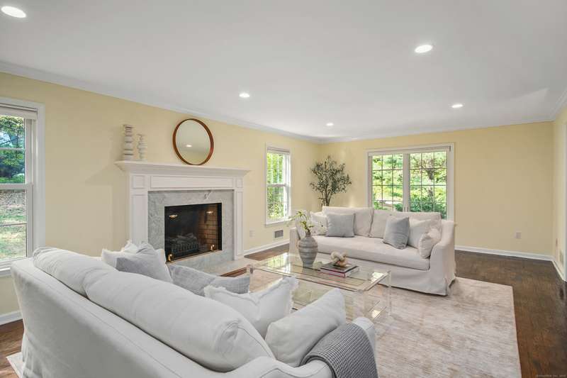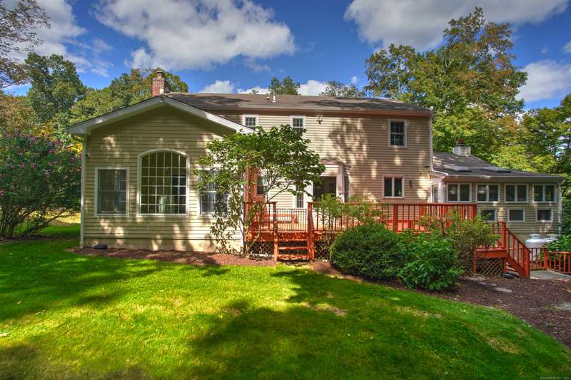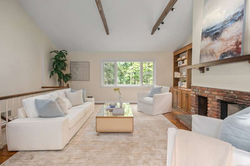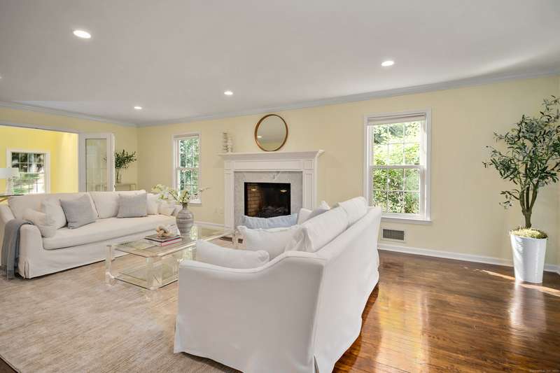 Sophisticated South Wilton living awaits! Welcome to this spacious and inviting colonial, perfectly situated in one of Wilton's most desirable locations. Inside, you'll find generously sized rooms designed for both everyday living and effortless entertaining. The large living room and oversized family room-complete with cathedral ceilings, exposed beams, and fireplaces-offer cozy retreats for gathering on winter nights. A versatile bonus room with skylights and striking Palladian windows overlooks the private backyard, making it an ideal home office, den, or music room. The sun-filled primary suite is large enough for a sitting area and features its own private bath, while three additional bedrooms provide plenty of space for family and guests. The finished lower level offers flexibility for an in-law suite, recreation room, or additional living space, with direct access to the three-car garage. A bright sunroom with skylights and an expansive deck extend the living space outdoors, p