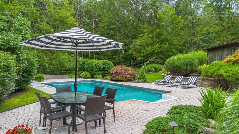 Architecturally distinct contemporary provides privacy with a backyard oasis on 2+ acres at the end of a cul-de-sac in Bulford Farms! This beautifully designed 2 story offers 4 beds, 5 baths, open floor plan, vaulted ceilings, walls of windows, luxury kitchen & baths, and a master suite with fireplace. Enjoy a pristine pool, water feature, fenced yard, lush landscaping, and expansive deck & patio. Don't miss this rare opportunity to own a one-of-a-kind Shavertown home!