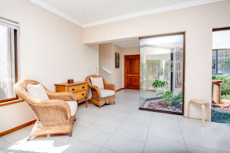 Tranquil Oasis in a Secluded Complex, Perfectly Positioned in Khyber Rock Welcome to this modern and beautifully renovated gem, ready for you to move in and enjoy. This home features two sun-drenched bedrooms and third one currently utilized as a study, which can easily be reverted back with minor adjustments. You’ll find two stylish bathrooms, alongside a spacious open-plan dining and lounge area, artfully separated by a soaring gas fireplace. The chef’s kitchen is a culinary delight, equipped with Caesarstone countertops, a high-end SMEG oven, and a gas hob. Each bedroom is fitted with air conditioning, while the main suite boasts a luxurious en-suite full bathroom with a double vanity. The automated double garage contains an off-grid-friendly inverter and battery pack, seamlessly connected to multiple solar panels on the roof, making this property highly energy-efficient. The meticulously landscaped gardens are distinctively divided, offering unique outdoor experiences that enhance the charm of this stunning home. You’ll relish lush garden views from every angle. Executive spacious two bedroomed home with home office and servants quarters/flatlet to suite the distinguished business couple . Block away from Country Club Johannesburg and within 2 kilometers of Buccleuch interchange. Also 25 minutes from O.R.T and 10 minutes from Sandton CBD. Private with excellent security in a small complex. With very low levies and the added security of Khyber Rock, this property is an enticing option for residents. Conveniently located near highways, hospitals, excellent schools, and the vibrant Sandton CBD, it perfectly combines tranquility and accessibility.