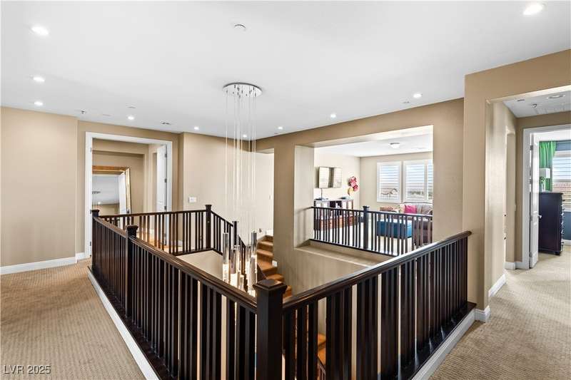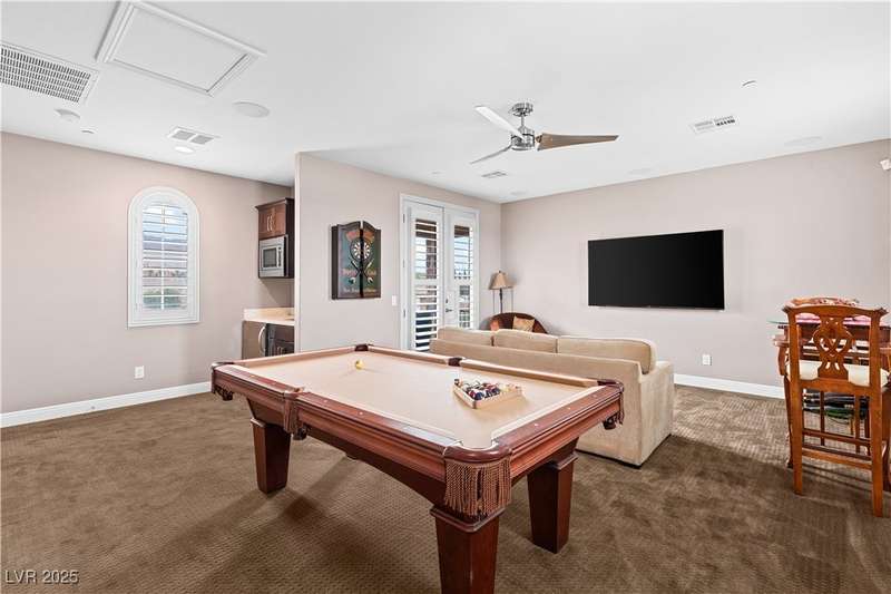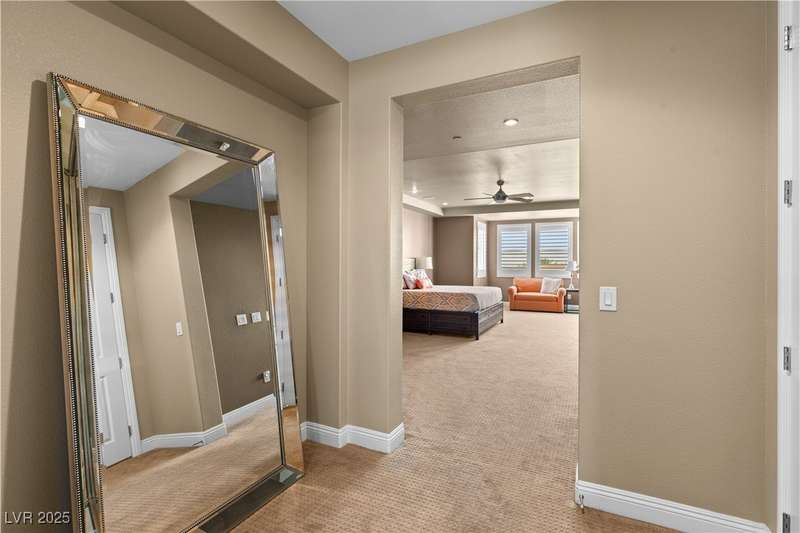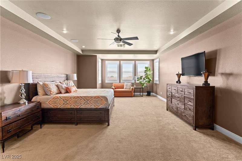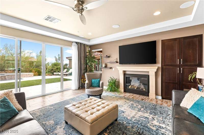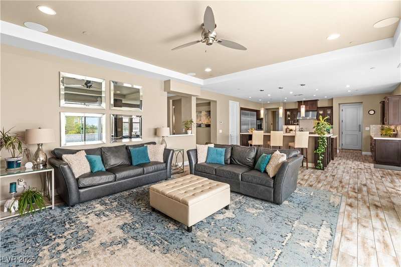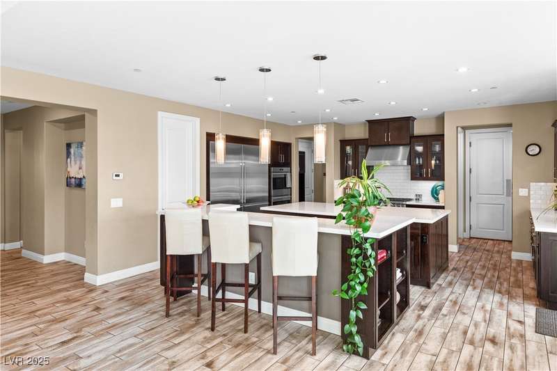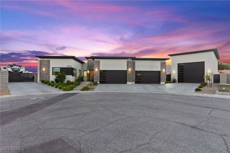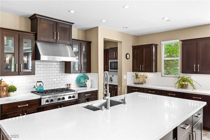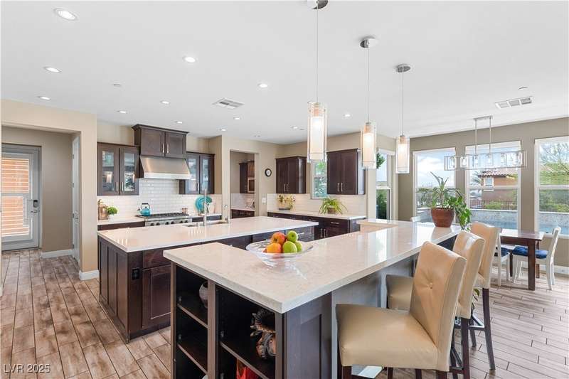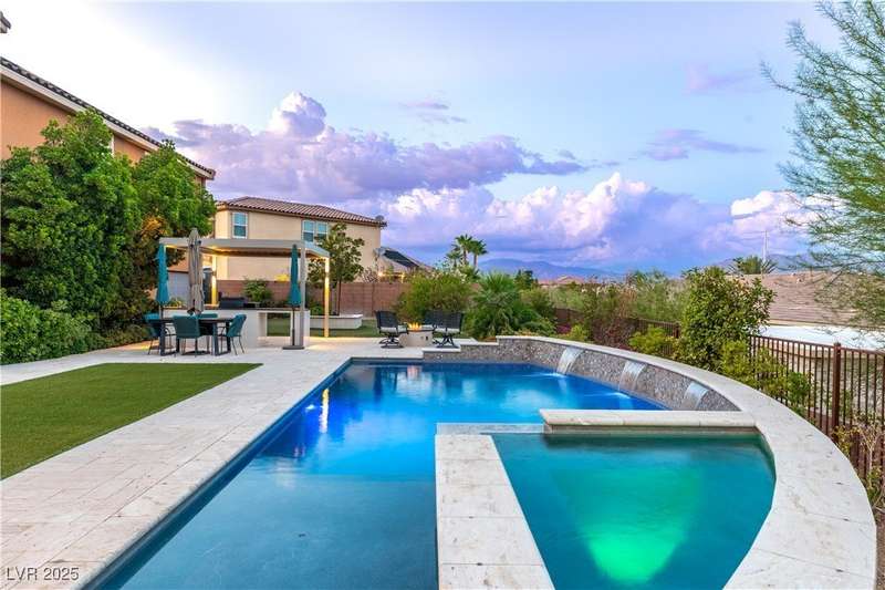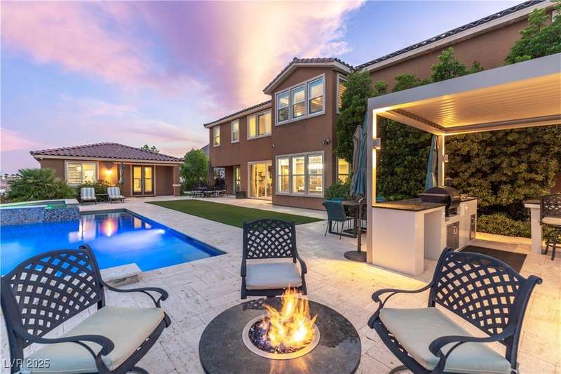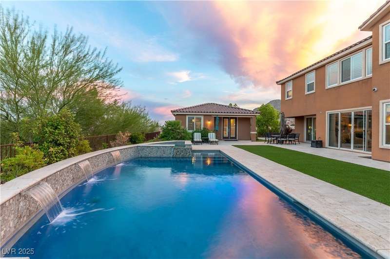 Welcome to a truly extraordinary estate in the heart of Lone Mountain, built for entertaining, comfort & sweeping Strip views. On a half-acre lot, this two-story home features a rare 630-sq ft casita w/double-door entry, Murphy bed, kitchenette, living room & full bath-ideal for guest or multi-generational living. The main home boasts plantation shutters, custom lighting & refined finishes. A gourmet kitchen shines w/dual quartz island, Sub-Zero fridge, Wolf appliances, two dishwashers, double oven & dual pantries. Flexible dual-primary layout: downtains suite w/spa bath & backyard access; upstairs suite w/retreat, loft, reading nook & balconies. Additional spaces: media room w/wet bar, office, formal living/dining, & family room w/tray ceilings. The backyard offers a saltwater pool w/solar heat, pull-thru garage, outdoor kitchen, travertine, fireplace lounge, sports & basketball courts, putting green, plus RV gate & 4-car epoxy garage. Owned solar panels enhance efficiency.