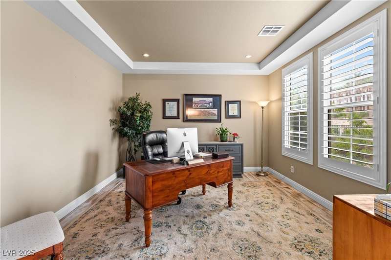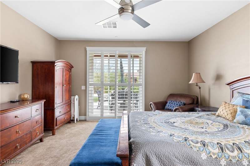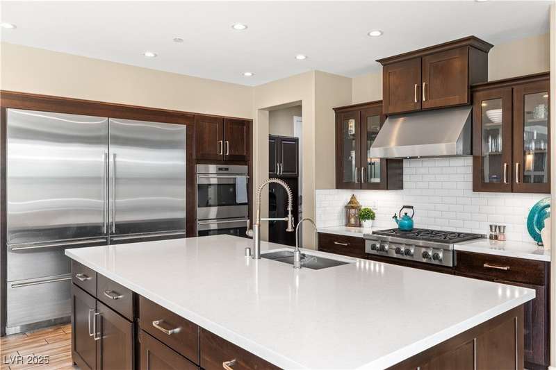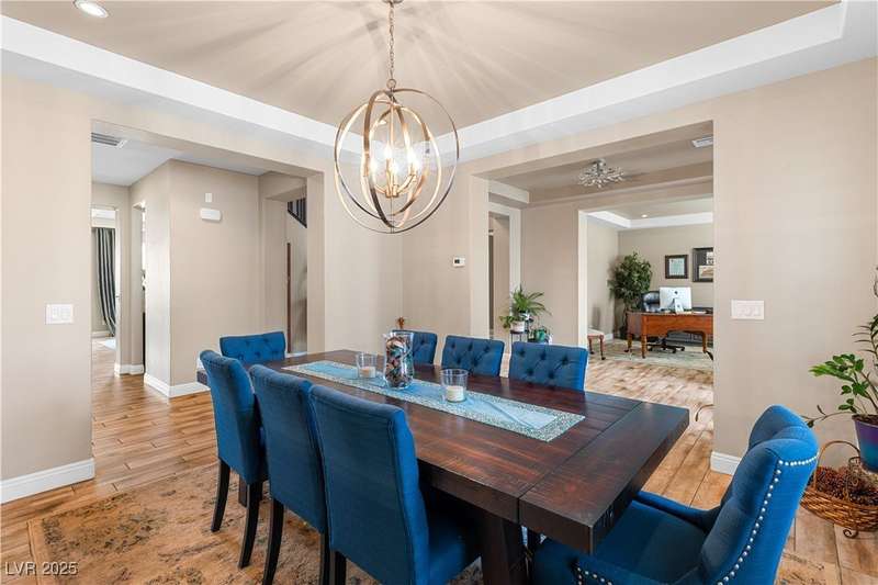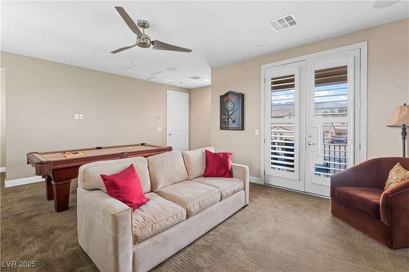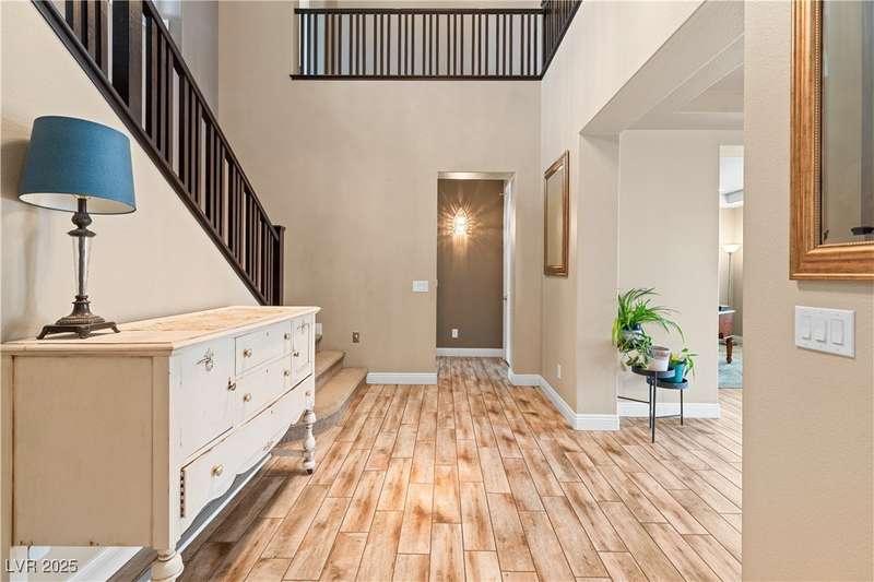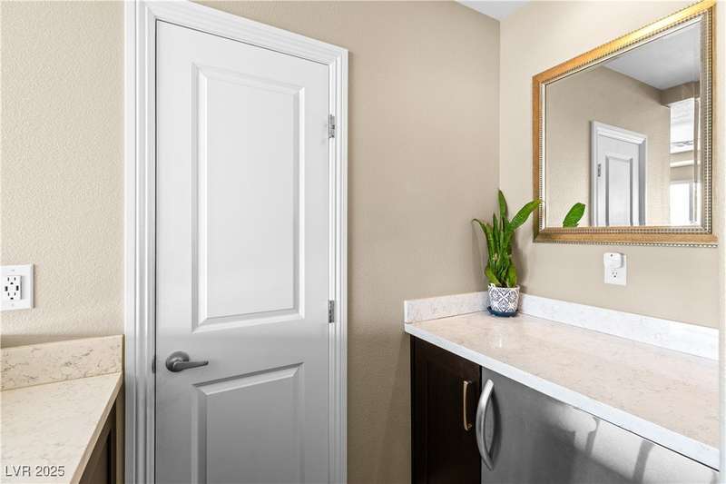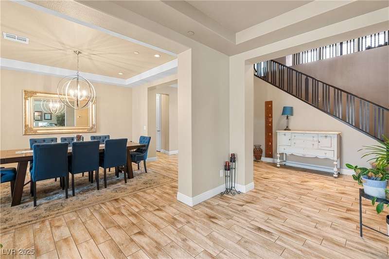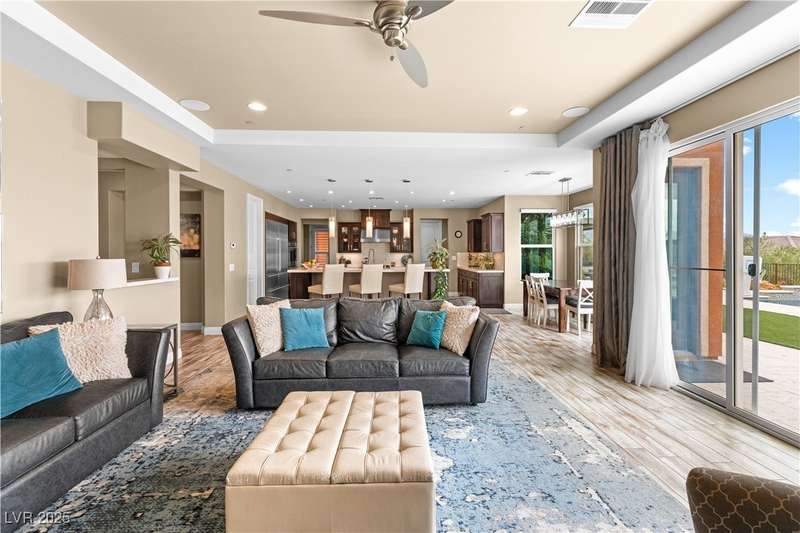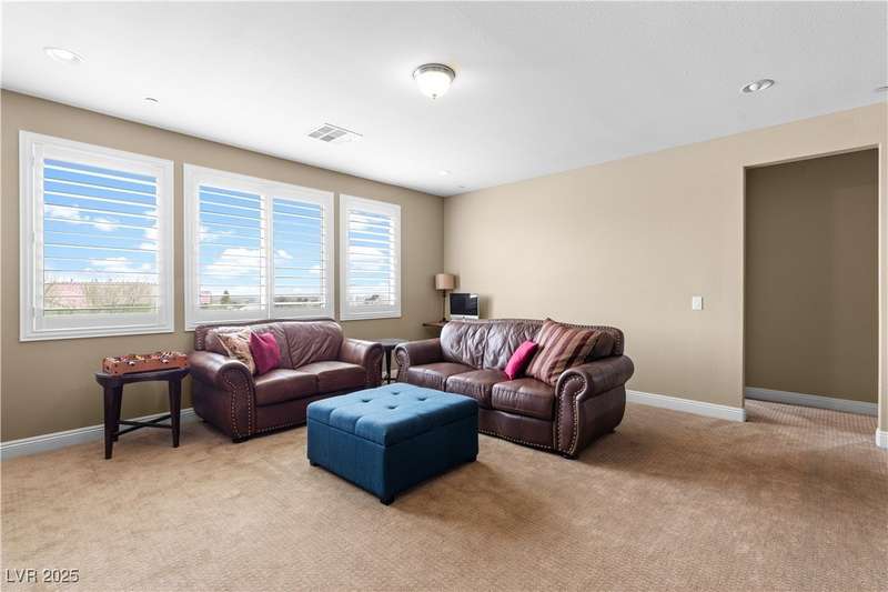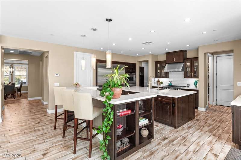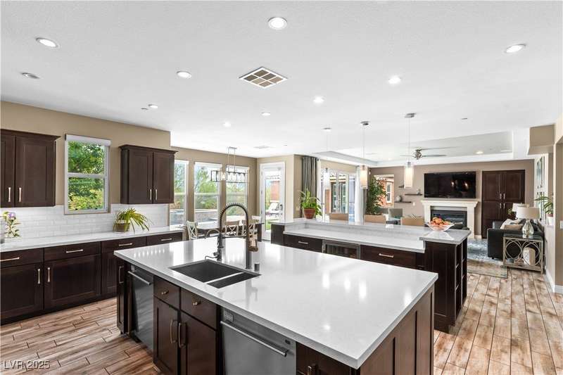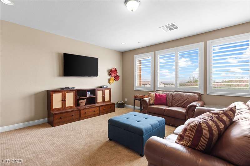 Welcome to a truly extraordinary estate in the heart of Lone Mountain, built for entertaining, comfort & sweeping Strip views. On a half-acre lot, this two-story home features a rare 630-sq ft casita w/double-door entry, Murphy bed, kitchenette, living room & full bath-ideal for guest or multi-generational living. The main home boasts plantation shutters, custom lighting & refined finishes. A gourmet kitchen shines w/dual quartz island, Sub-Zero fridge, Wolf appliances, two dishwashers, double oven & dual pantries. Flexible dual-primary layout: downtains suite w/spa bath & backyard access; upstairs suite w/retreat, loft, reading nook & balconies. Additional spaces: media room w/wet bar, office, formal living/dining, & family room w/tray ceilings. The backyard offers a saltwater pool w/solar heat, pull-thru garage, outdoor kitchen, travertine, fireplace lounge, sports & basketball courts, putting green, plus RV gate & 4-car epoxy garage. Owned solar panels enhance efficiency.