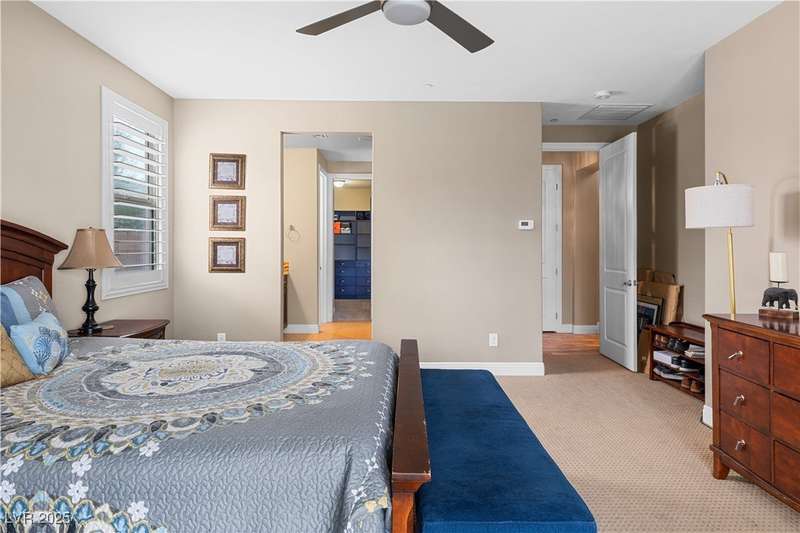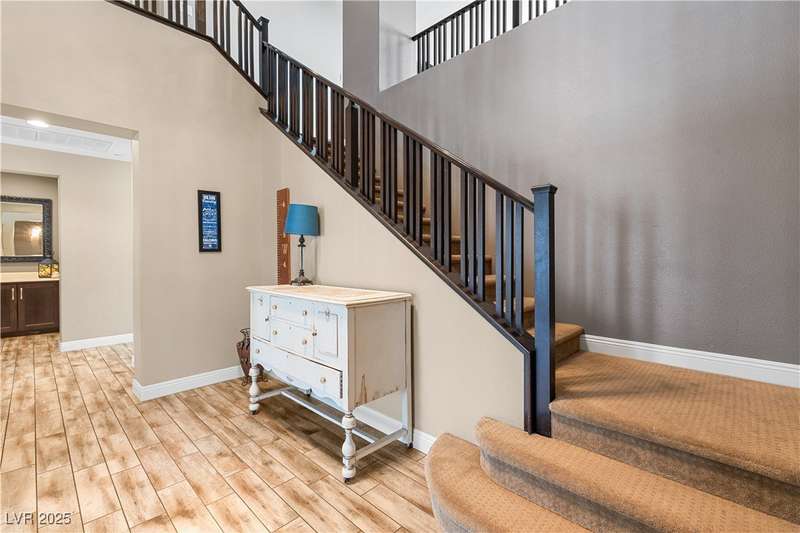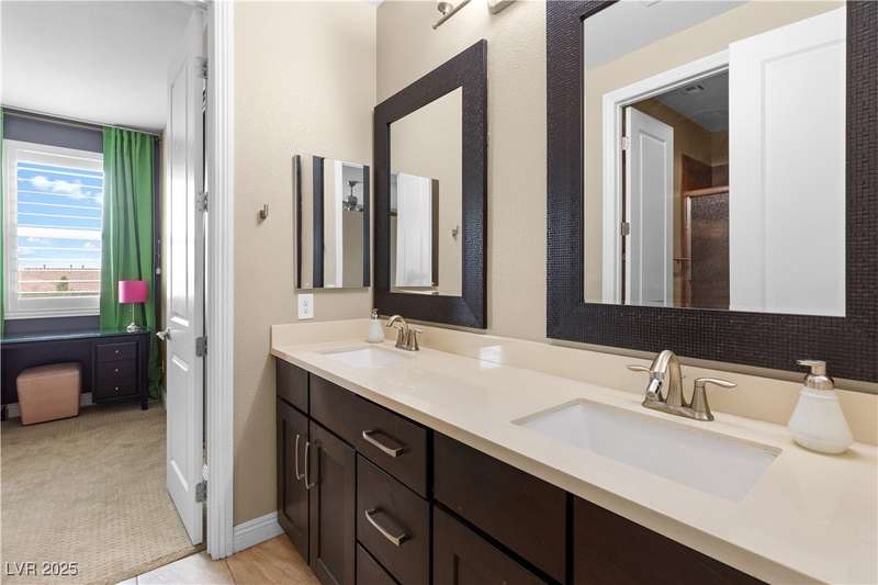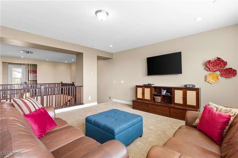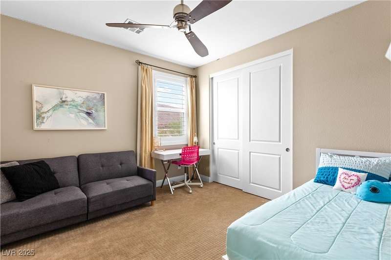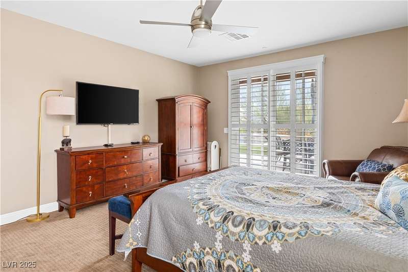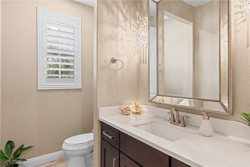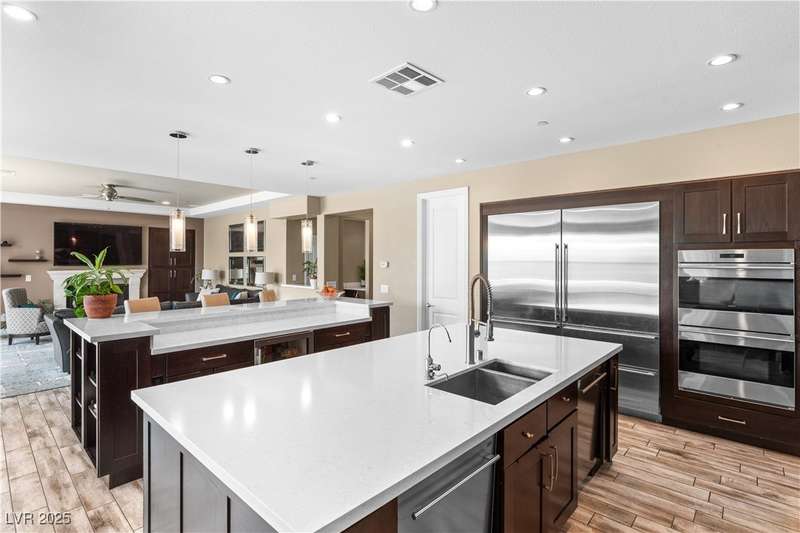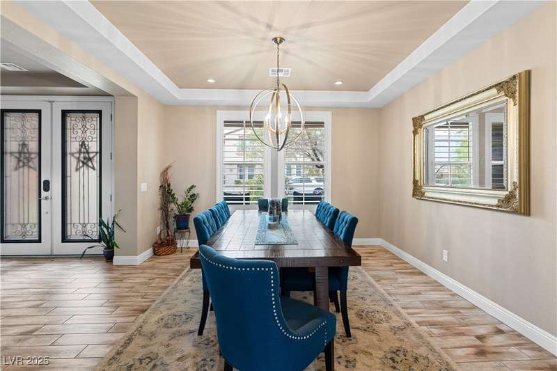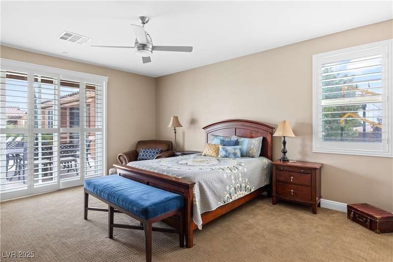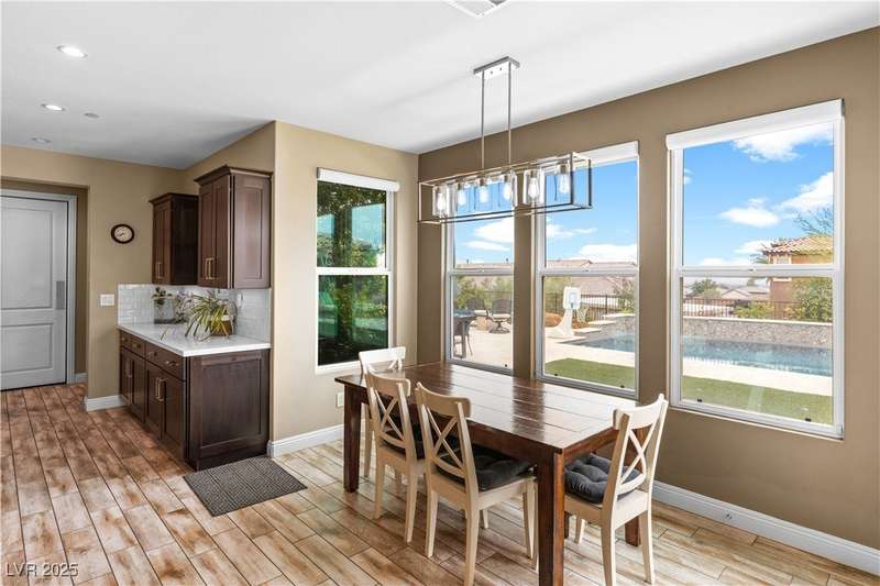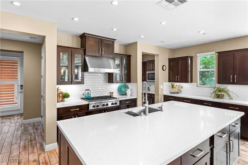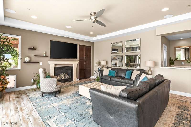 Welcome to a truly extraordinary estate in the heart of Lone Mountain, built for entertaining, comfort & sweeping Strip views. On a half-acre lot, this two-story home features a rare 630-sq ft casita w/double-door entry, Murphy bed, kitchenette, living room & full bath-ideal for guest or multi-generational living. The main home boasts plantation shutters, custom lighting & refined finishes. A gourmet kitchen shines w/dual quartz island, Sub-Zero fridge, Wolf appliances, two dishwashers, double oven & dual pantries. Flexible dual-primary layout: downtains suite w/spa bath & backyard access; upstairs suite w/retreat, loft, reading nook & balconies. Additional spaces: media room w/wet bar, office, formal living/dining, & family room w/tray ceilings. The backyard offers a saltwater pool w/solar heat, pull-thru garage, outdoor kitchen, travertine, fireplace lounge, sports & basketball courts, putting green, plus RV gate & 4-car epoxy garage. Owned solar panels enhance efficiency.