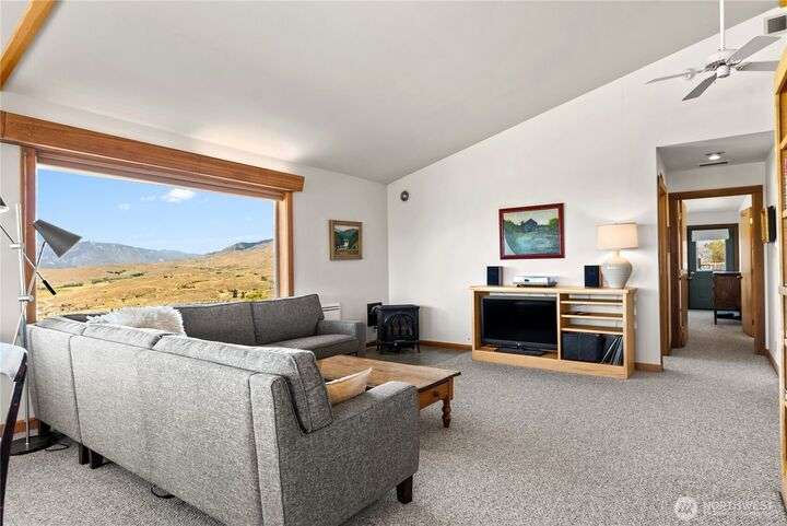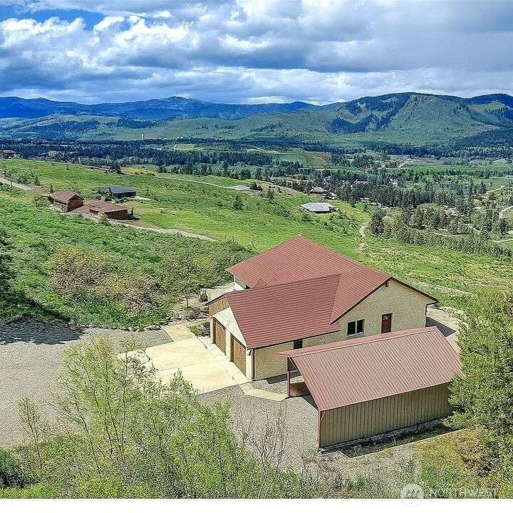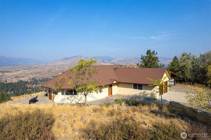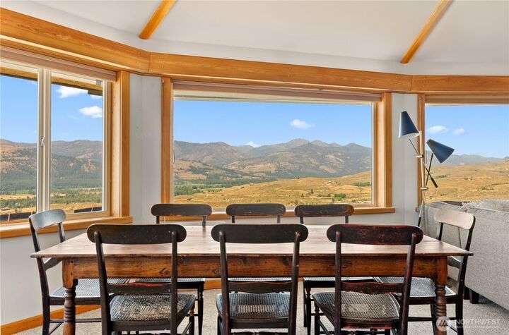 Expansive, breathtaking mountain views from this 3BD/2BA home on 6 acres of aspens & pines. 1,800 SF with windows galore showcasing dramatic high mountain vistas & natural light throughout. Open living, dining & kitchen—ideal for entertaining. Spacious primary suite with ensuite bath, two guest bedrooms, full bath & home office/media room. Fine-finished custom cabinetry, woodwork, built-ins & generous storage. Easy-care stucco siding, concrete patios extend the living area for shade & views. Drought-tolerant landscaping, mature trees & low-maintenance setting. Attached 1-car garage, carport & storage room. Minutes to Winthrop & ski trails. Privacy, peace & Methow Valley beauty—truly one-of-a-kind!