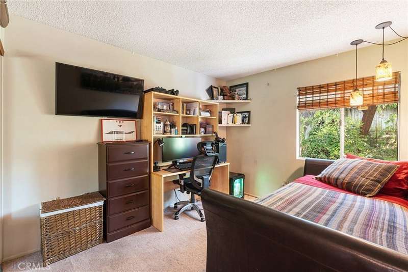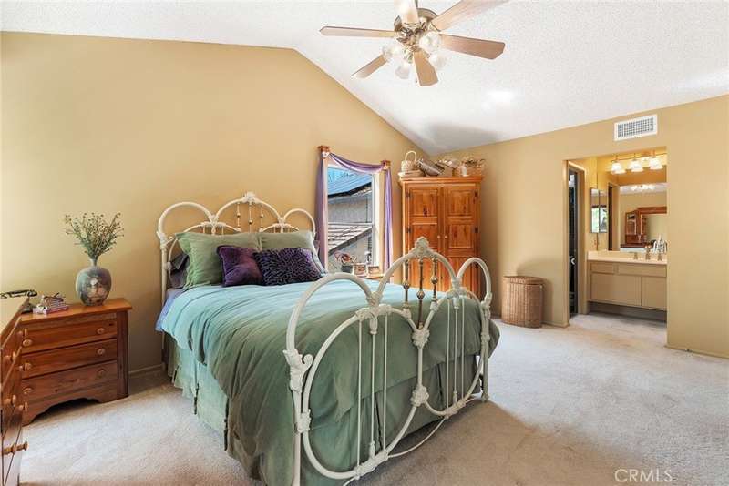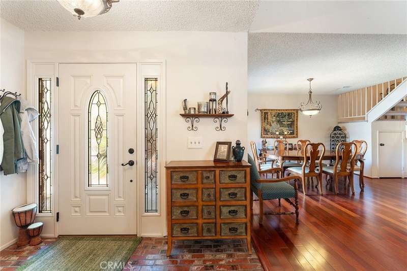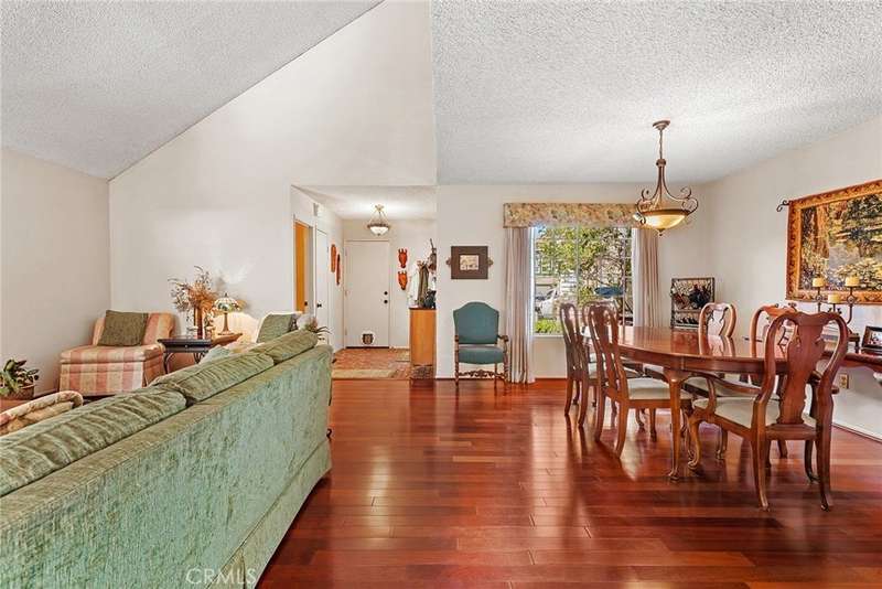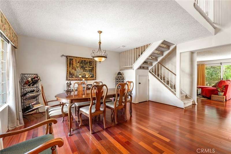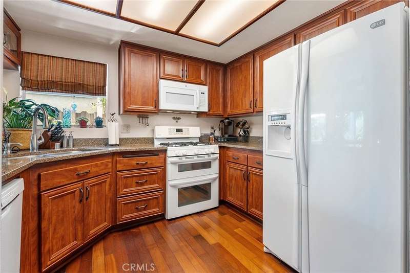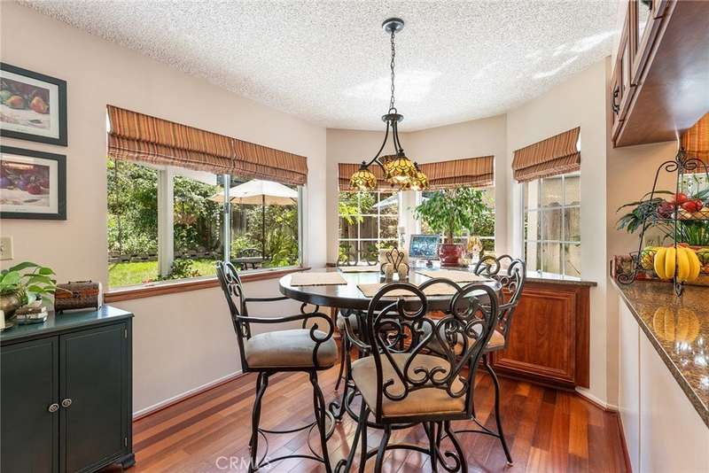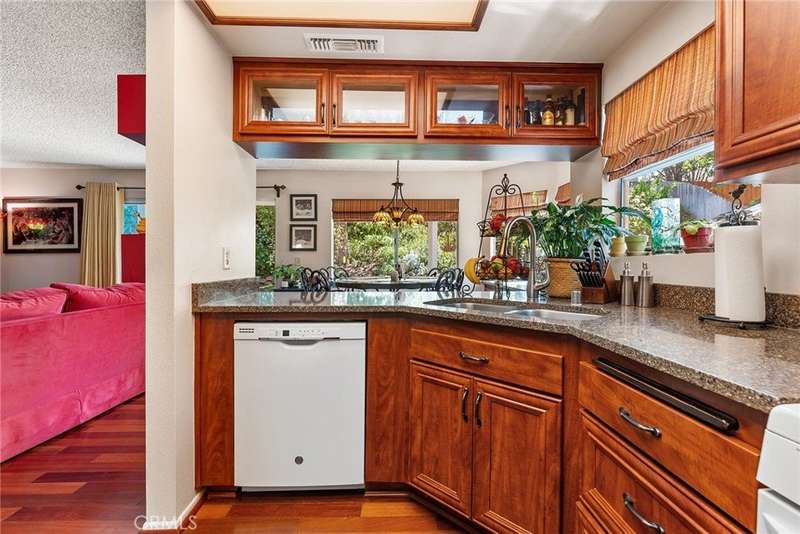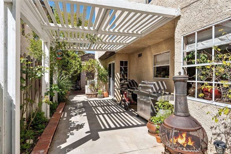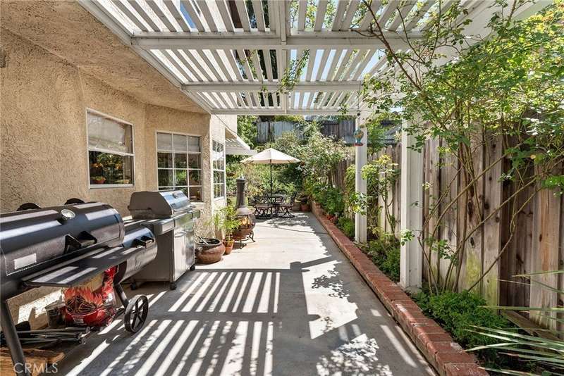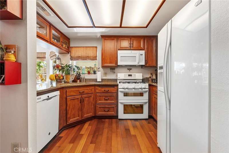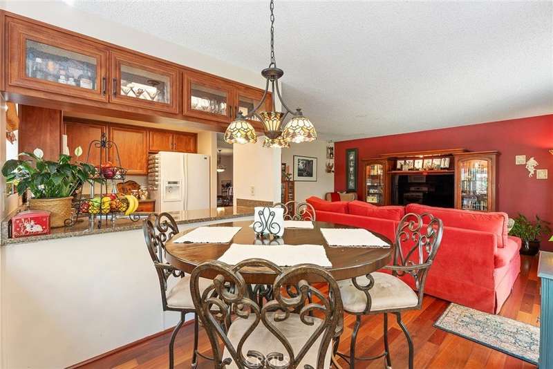Located on a quiet cul-de-sac in the American Beauty Classics community, this charming 3-bedroom, 2.5-bath home features an open layout with upgraded wood flooring, a large living room with gas wood-burning fireplace, formal dining area, and spacious family room. The remodeled kitchen includes cherry finish cabinetry with soft-close drawers, quartz countertops, and a matching built-in buffet in the breakfast nook offering additional counter space and storage. Sliding glass doors from both the living and family rooms open to a lush, private backyard with mature trees, and an expansive wrap-around patio. Upstairs, the primary suite offers dual closets and a slate-tiled bath with shower/over-sized soaking tub. Two additional bedroom each with built-in shelving and share a full bath in the hallway. The front bedroom also features a bay window. The attached 2-car garage includes an EV-ready outlet, compressed air lines, and overhead storage racks. The heating and air conditioner was just replaced in 2023. HOA amenities include four pools, tennis, basketball, and volleyball courts, a park with play area, and front yard landscaping. Conveniently located near Costco, Trader Joe’s, and a wide range of shopping, dining, and entertainment options—with easy access to the 14 freeway—this home offers comfort, convenience, and an ideal setting for your next chapter. Did I mention NO MELLOROOS!