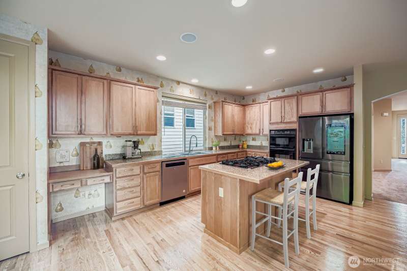 Gorgeous curb appeal in this Murray Franklyn craftsman, backing up to greenbelt. Over 3100 sqft, with 4 spacious bedrooms, very large bonus room & a den/office. The master suite is complete with 5-piece bath, walk-in closet with convenient built-ins. The family room with gas fireplace, opens to gorgeous kitchen with cooking island & high-end Smart refrigerator. Newly refinished hardwoods & repainted interior for a warm & bright atmosphere. Huge 3 car garage. New roof & new exterior paint, this home is move-in ready. Much to see & appreciate in this lovely home in the Woodside community with many parks, playgrounds, walkable trails & fantastic award-winning Kent schools.