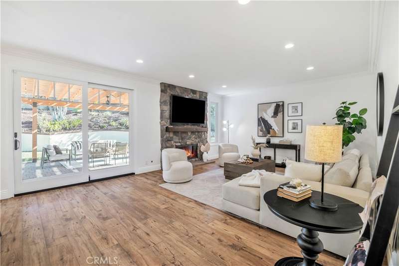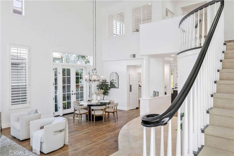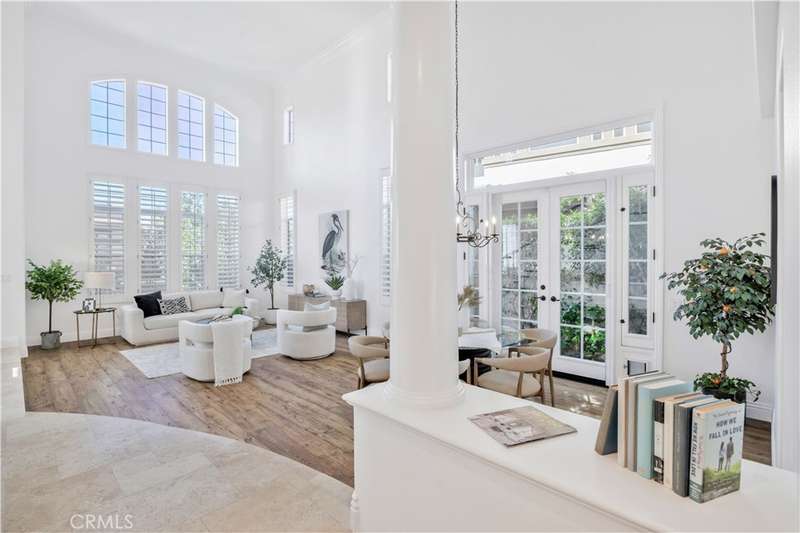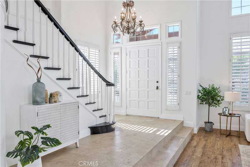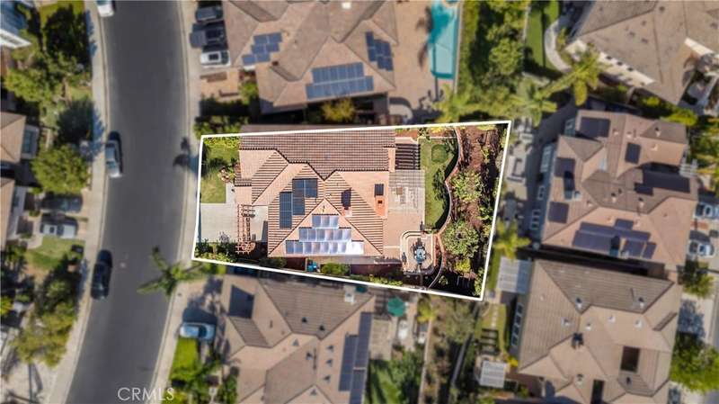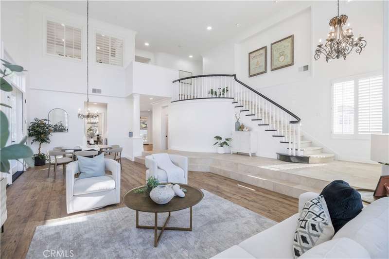 Nestled on a quiet cul-de-sac street within the prestigious GUARD-GATED COMMUNITY of Canyon Crest with NO MELLO-ROOS and LOW HOA, this stunning remodeled home perfectly blends luxury, efficiency, and comfort. This remodeled home residence showcases thoughtful design and superior craftsmanship throughout featuring a FULLY PAID SOLAR SYSTEM WITH BATTERY BACKUP, a spacious epoxy coated THREE-CAR TANDEM GARAGE with EV CHARGER outlet, MyQ wi-fi garage door openers with built in cameras and battery backup, and a large driveway that accommodates up to four cars. Step inside to a grand living and dining area with soaring ceilings, designer finishes, and abundant natural light that highlight the home's refined style.