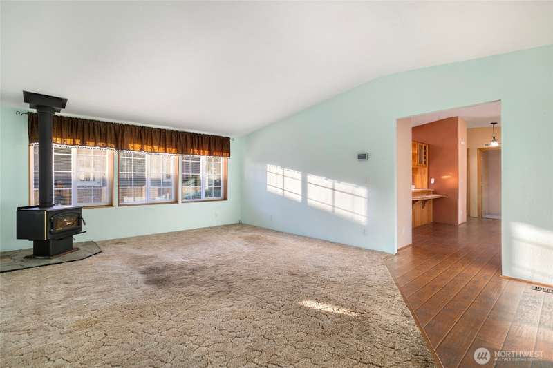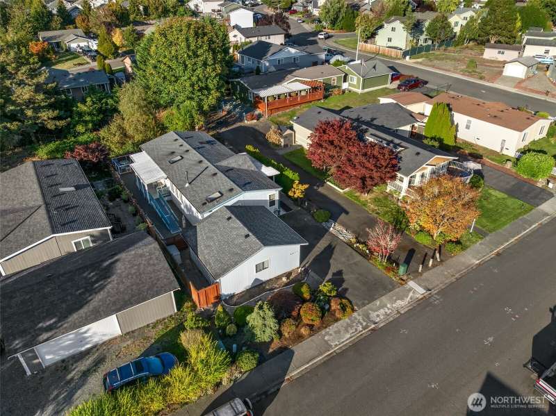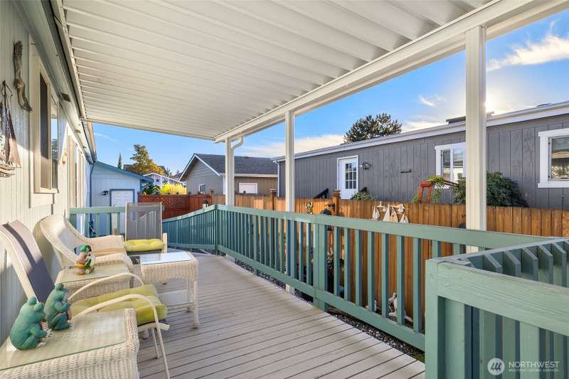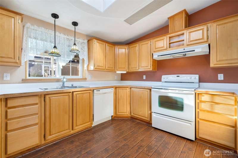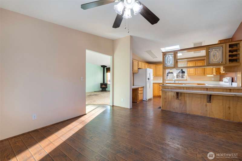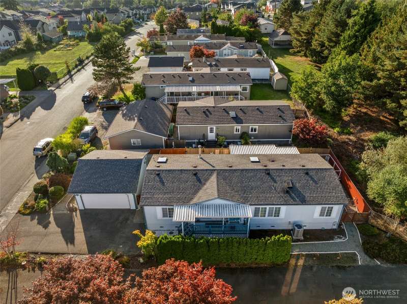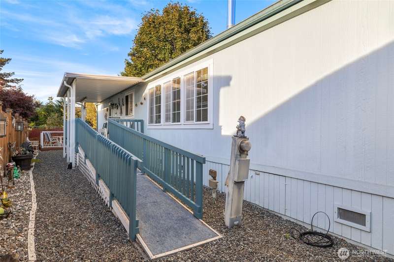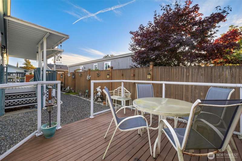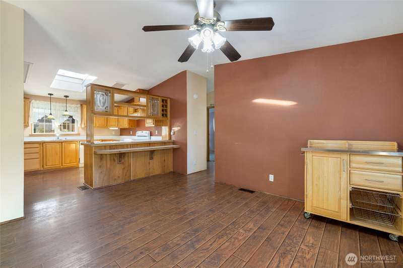 Welcome home to this cute and cozy house! Step into a vaulted ceiling living room with fireplace and lots of natural light. The gorgeous kitchen is complete with breakfast bar and eating nook. Lots of cabinet and counter top space for your cooking needs The primary bedroom is separated away from the other 2 guest bedrooms. Spacious primary bedroom with vaulted ceiling, walk in closet, and shower only bathroom. This property also features a detached garage with auto door opener, 2 decks, and fenced in yard space. The home features skylights for natural light and a heat pump system for heating and cooling. The lot is not leased land!